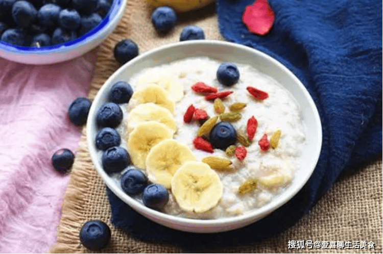 参考图片:图片11(粥上摆放切片香蕉、蓝莓等)