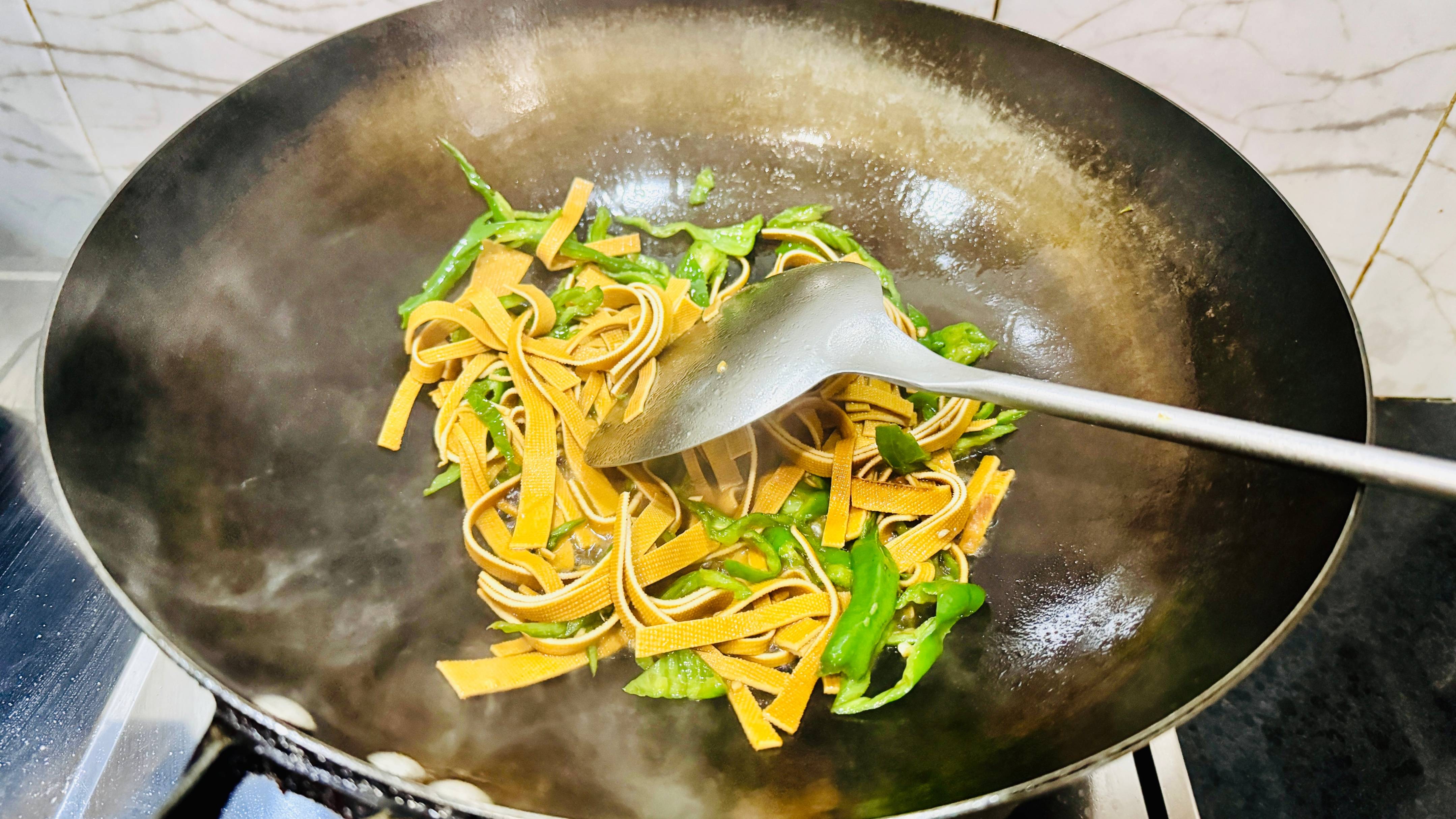 皮条干切切细条,青椒也切成条,两种食材一起下锅,炒均匀之后,加适量生抽,炒均匀,加盐味就可以出锅了。