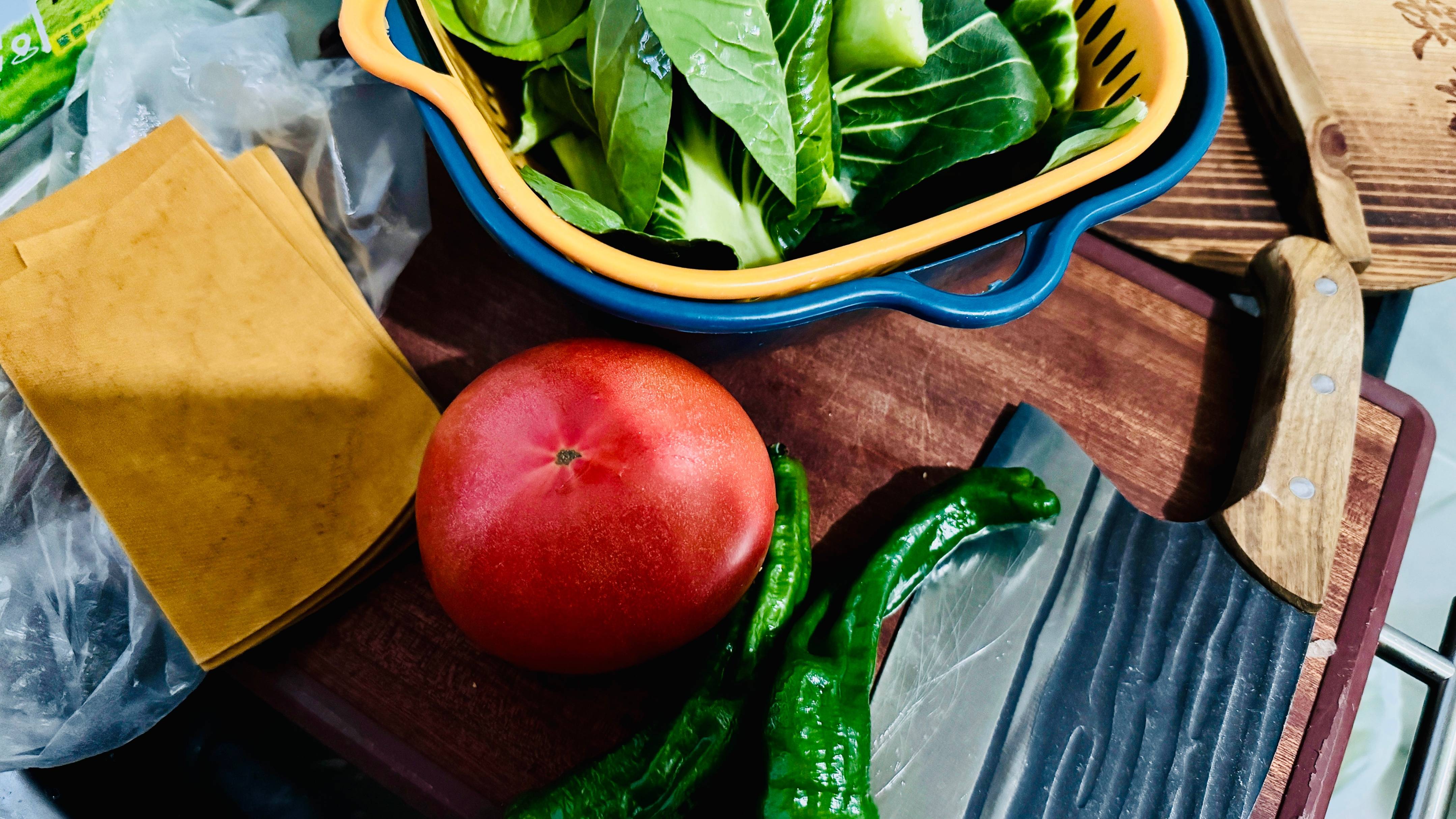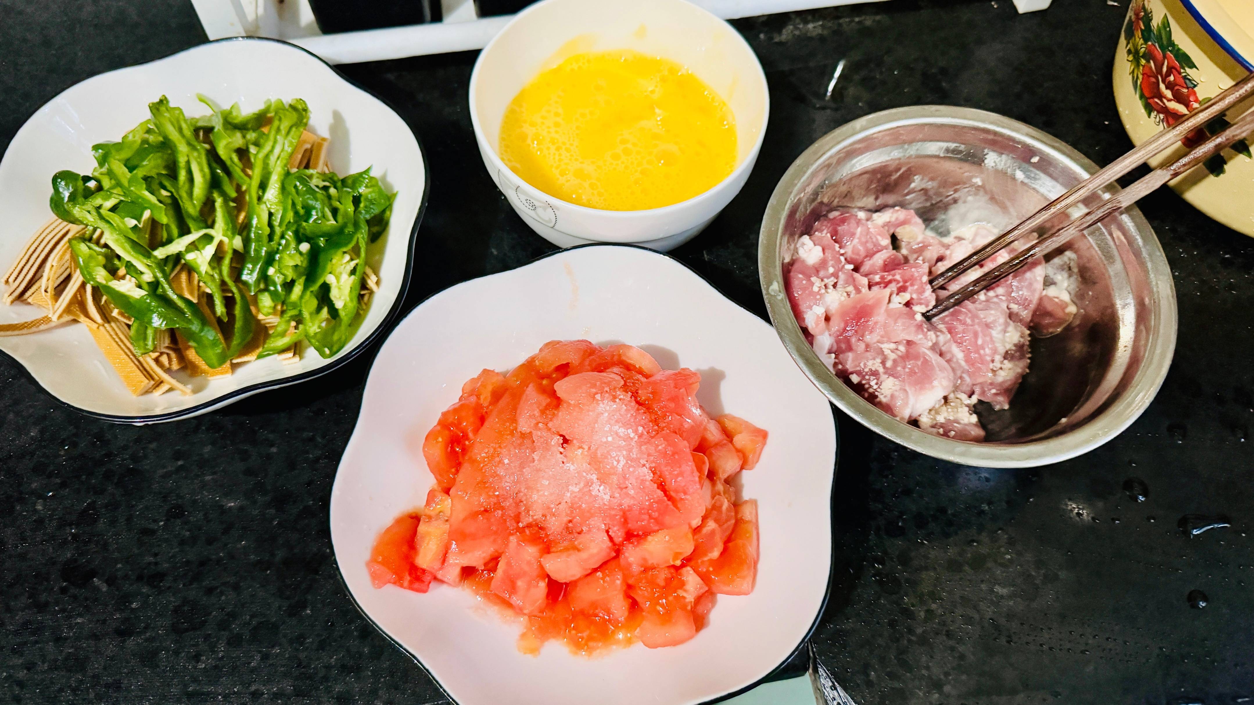 图片3(砧板上的西红柿、青椒,对应备菜过程)