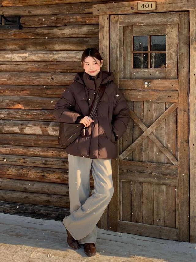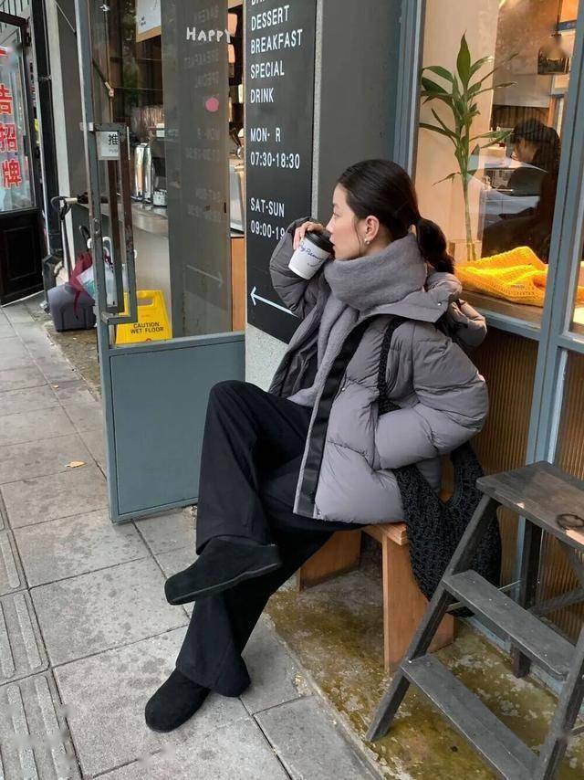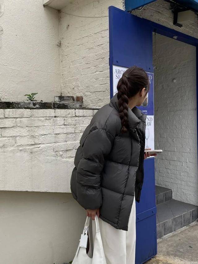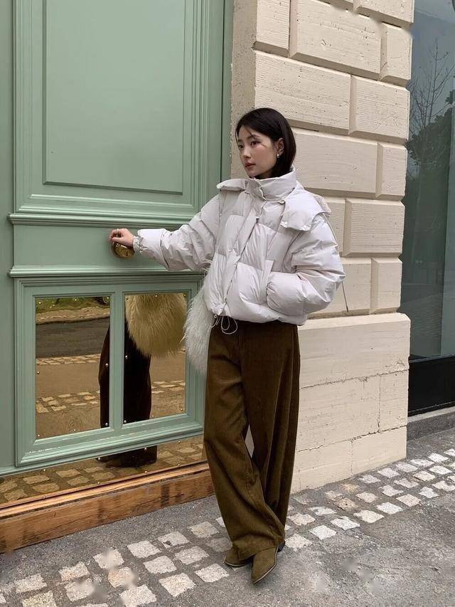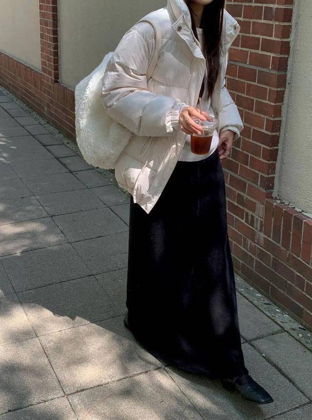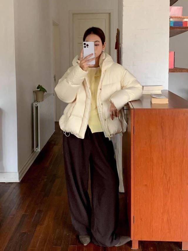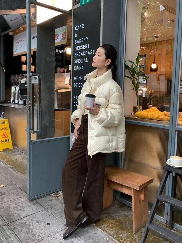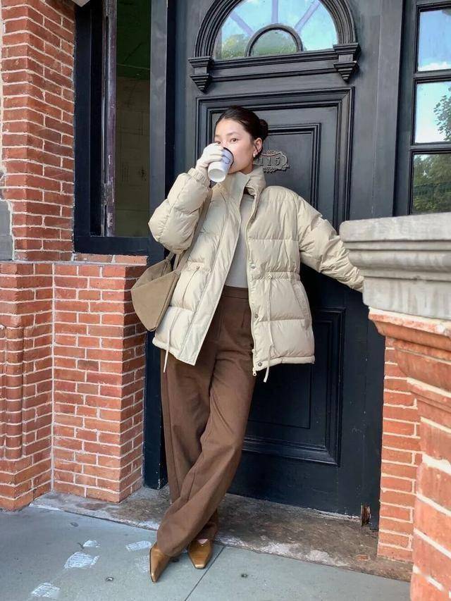 在通勤的路上,一件简约的羽绒服搭配高腰直筒裤,