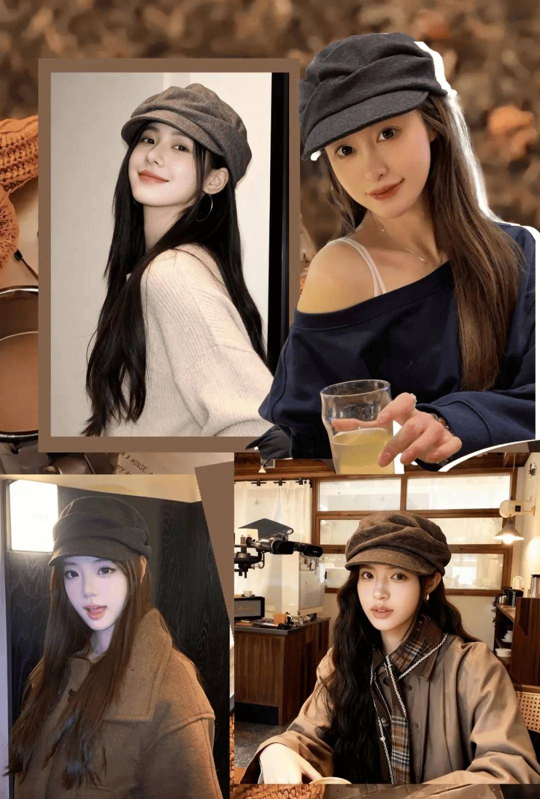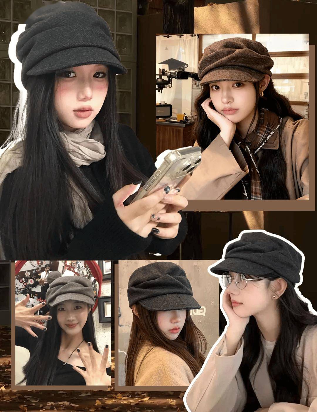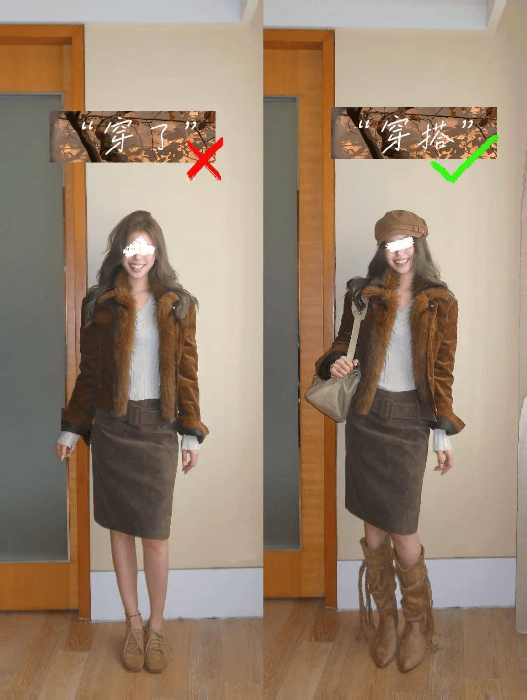 鞋履与下装同色系延长腿线:黑色靴+黑色紧身裤、棕色乐福+卡其窄裙,形成“无边界延伸”,视觉增高显瘦。