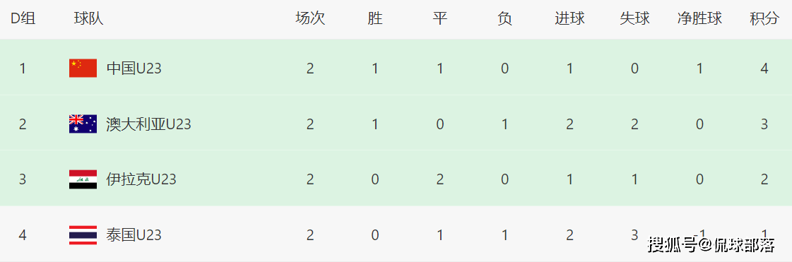 中国队积4分升至第一,澳大利亚队积3分掉到第二,伊拉克队积2分跌至第三,泰国队积1分仍居垫底。