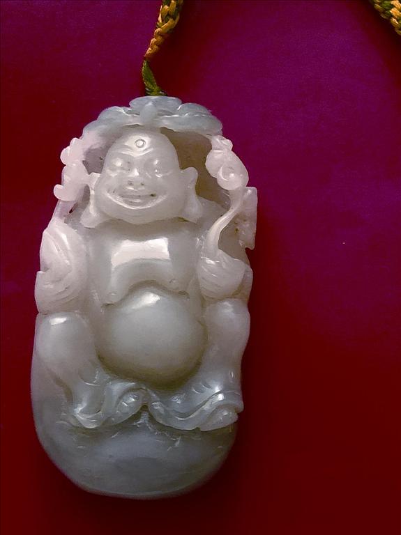 在商场的二楼精品屋,我被一尊弥勒佛玉雕像所吸引。它的造型精美,雕工细腻,喜眉大眼,袒胸露腹,笑口常开,手掌大小的雕像栩栩如生。标价为9800元,材质为白玉(和田玉)。