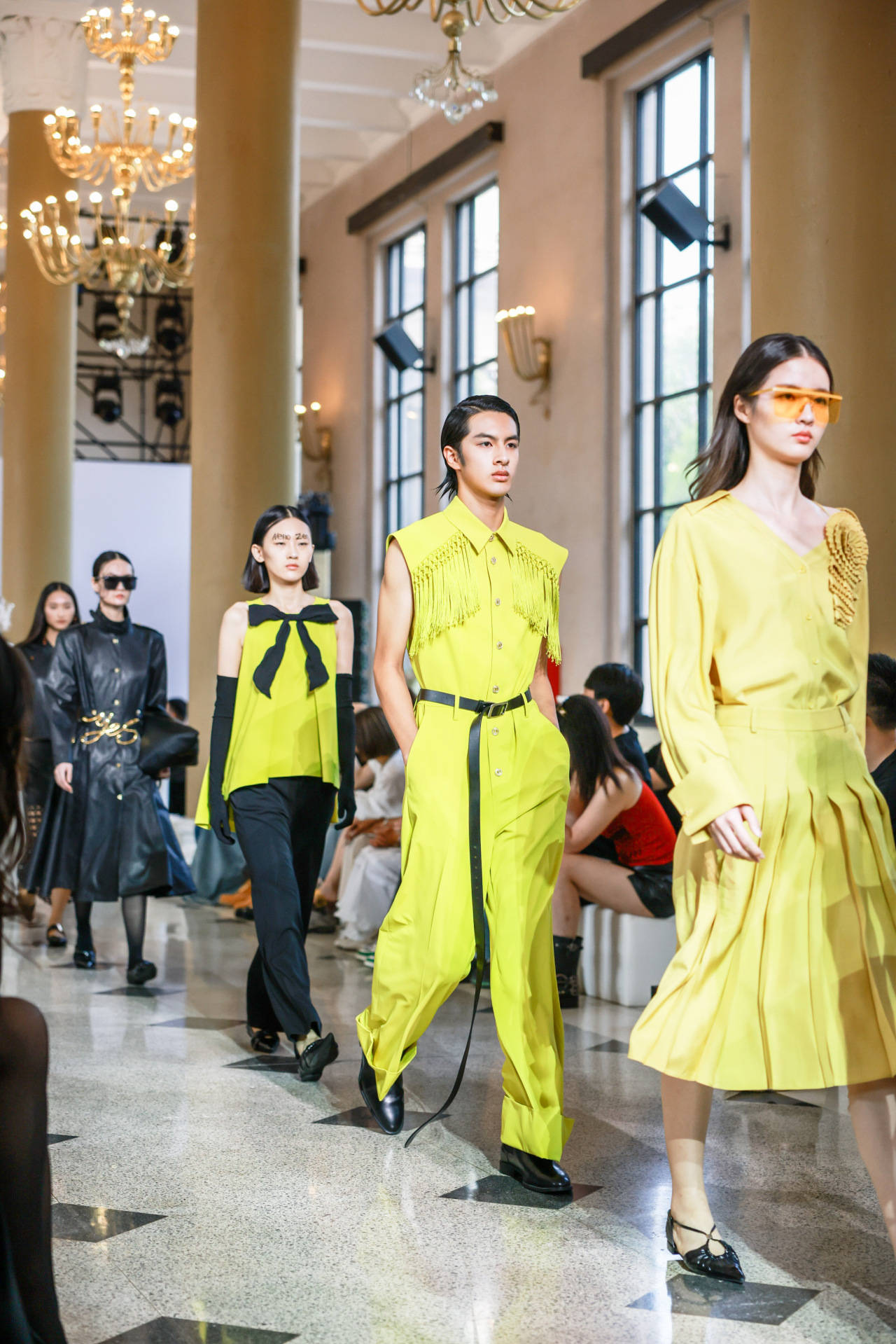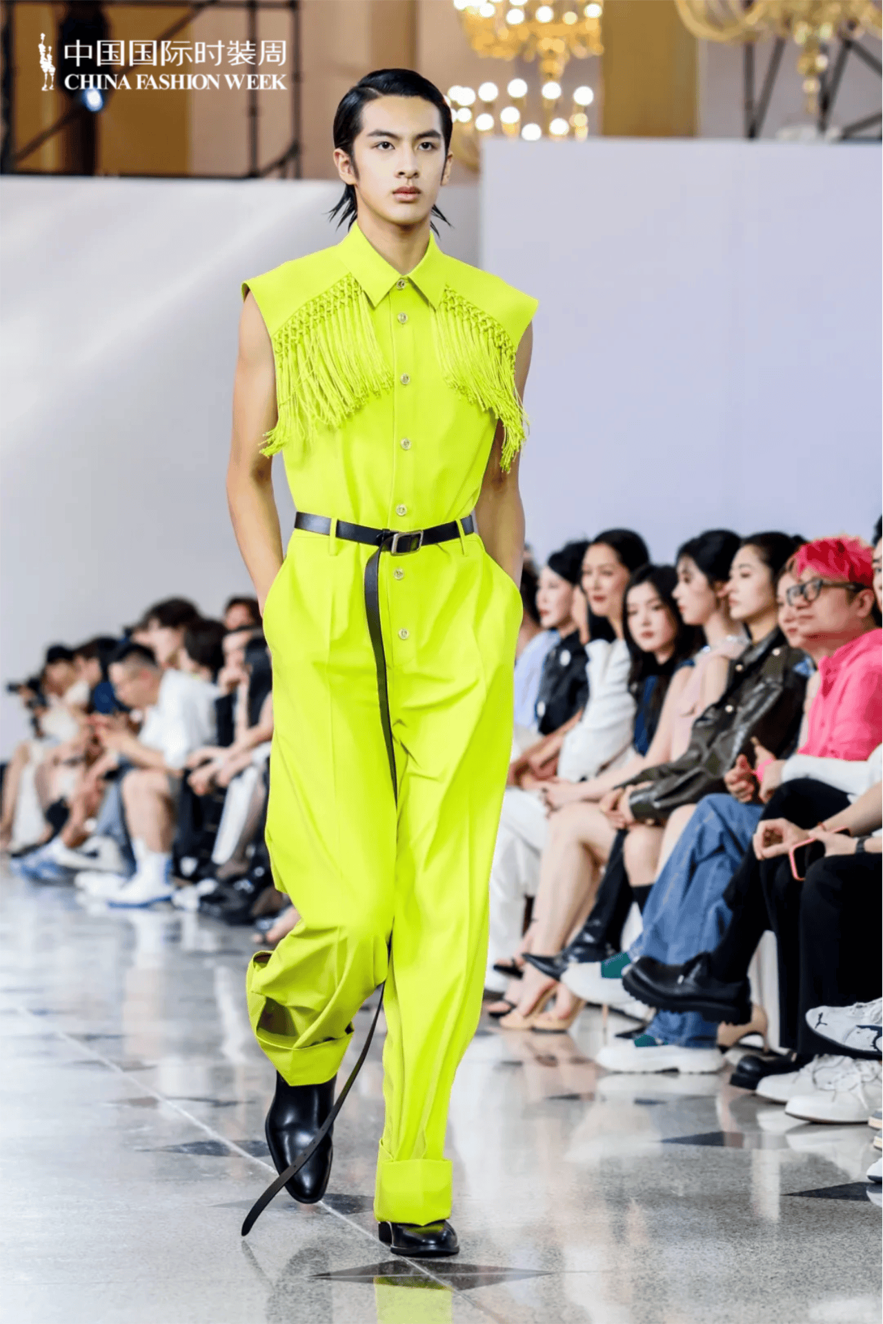的秀场场景。一位男模特身着荧光黄色无袖连体裤走在 T 台上,服装肩部装饰有流苏元素,搭配黑色腰带和黑色皮鞋,设计风格大胆且富有个性。背景中可以看到观秀的人群,场地装饰有华丽的吊灯,左上角清晰显示 “中国国际时装周 CHINA FASHION WEEK” 的标识,整体呈现出一场时尚感十足的时装发布活动。