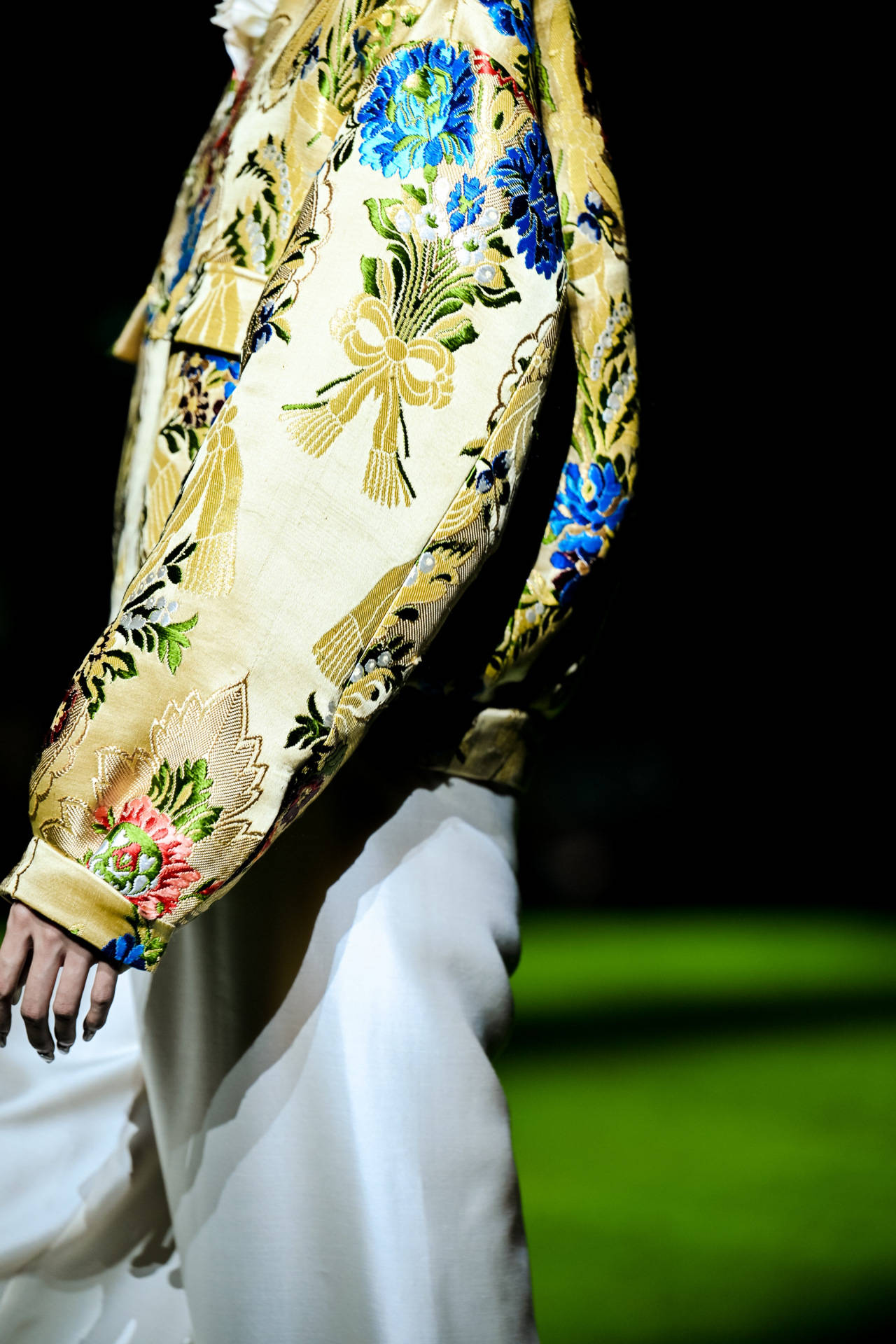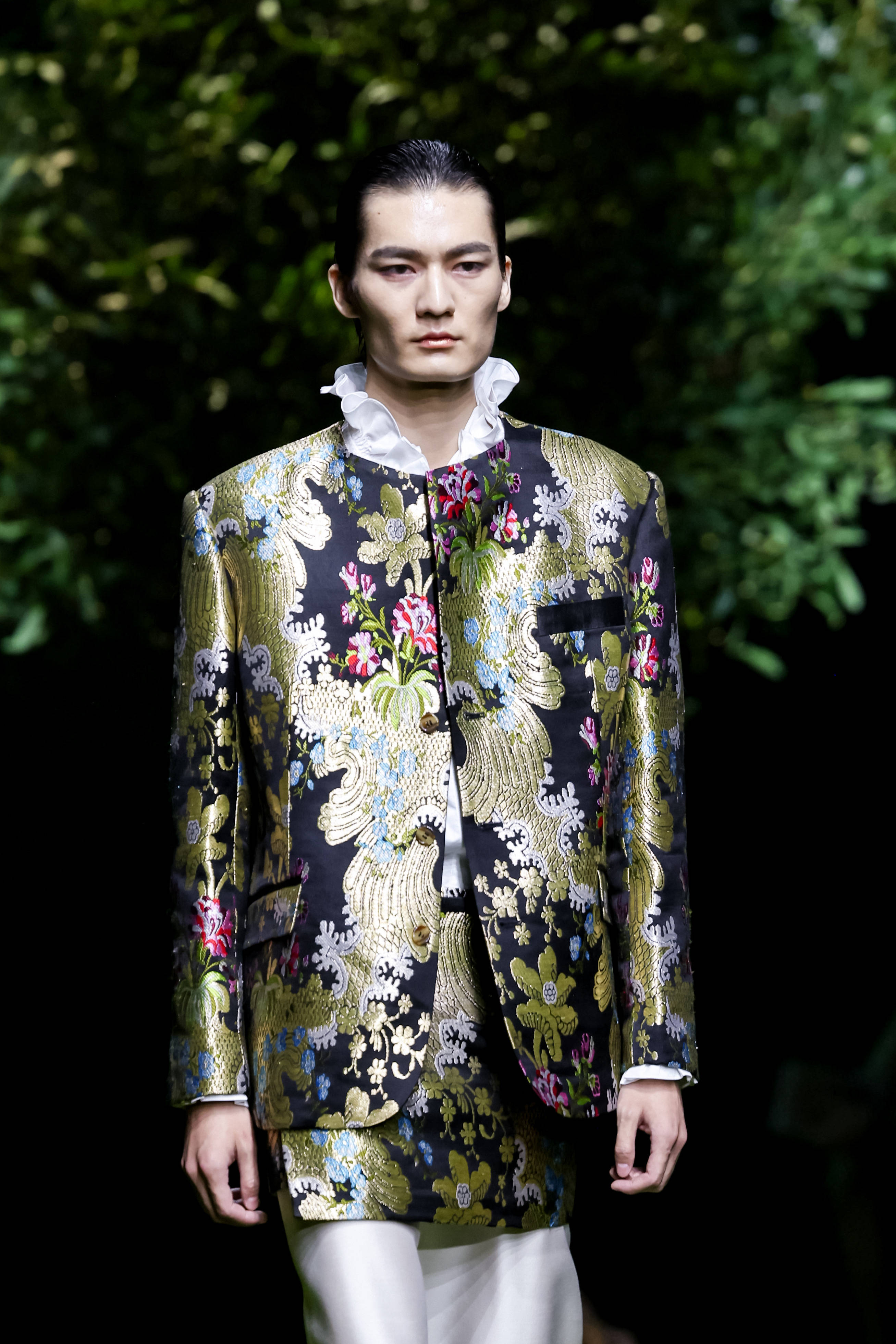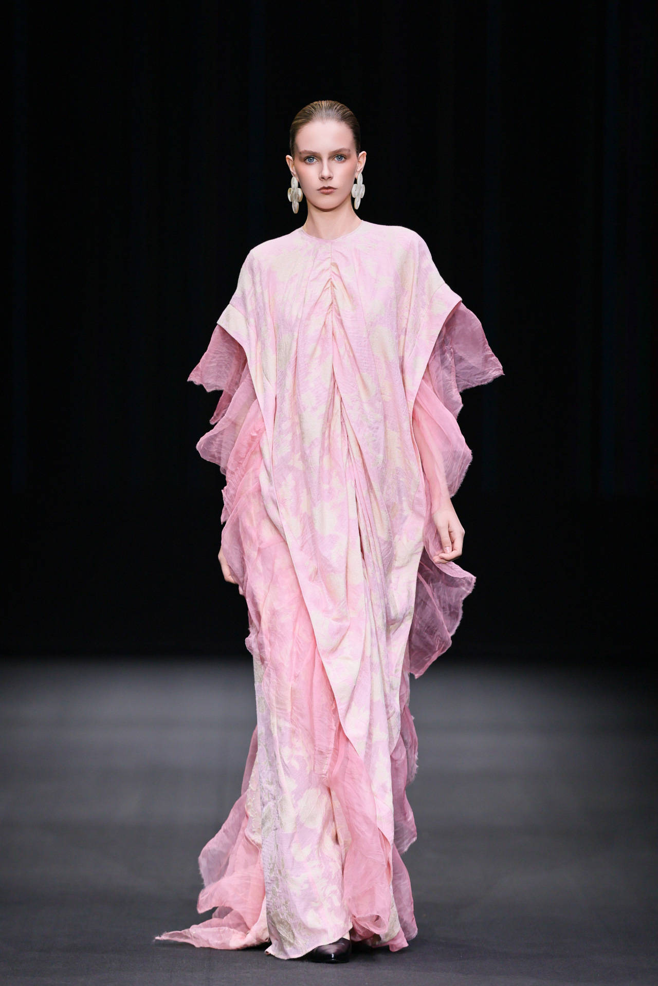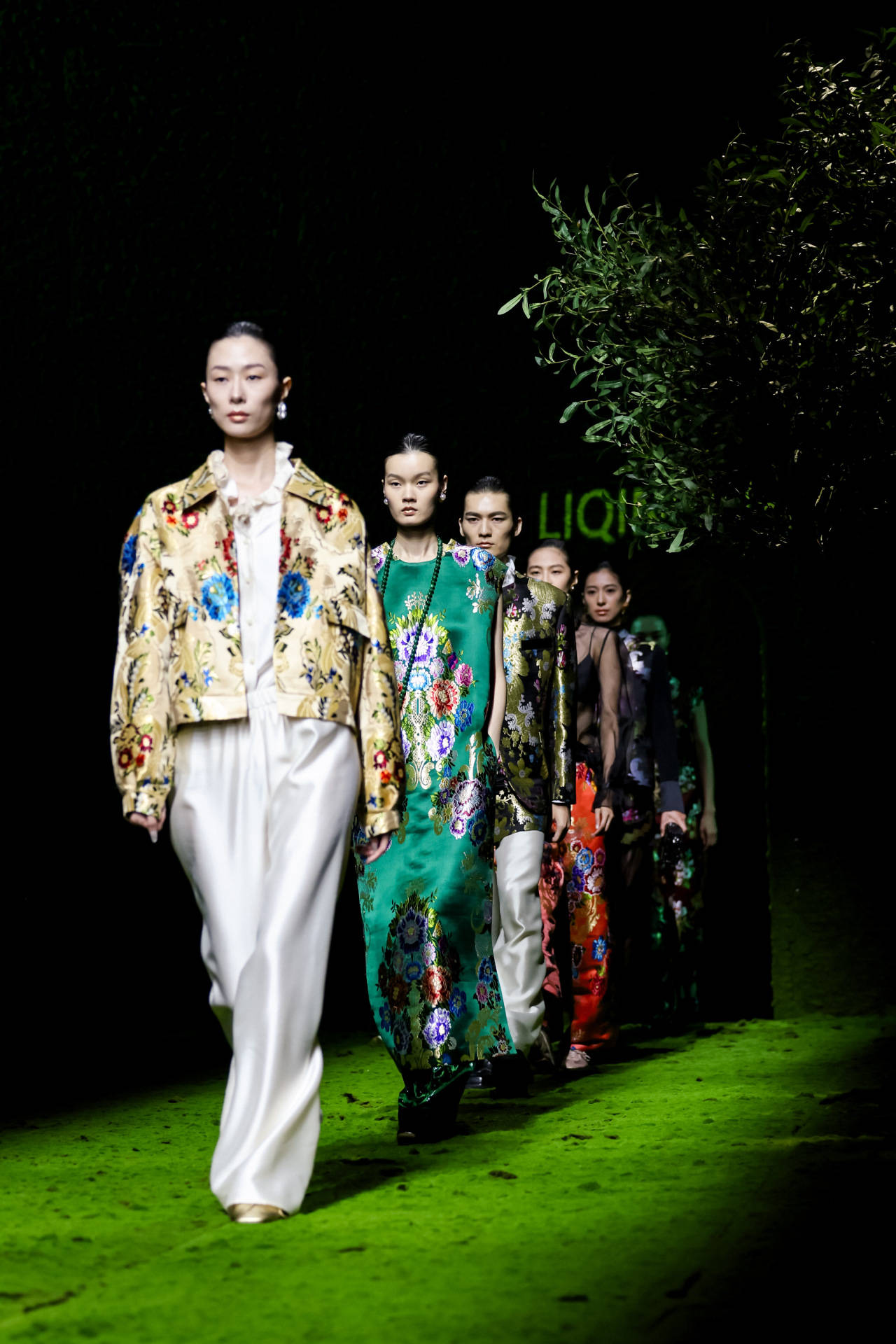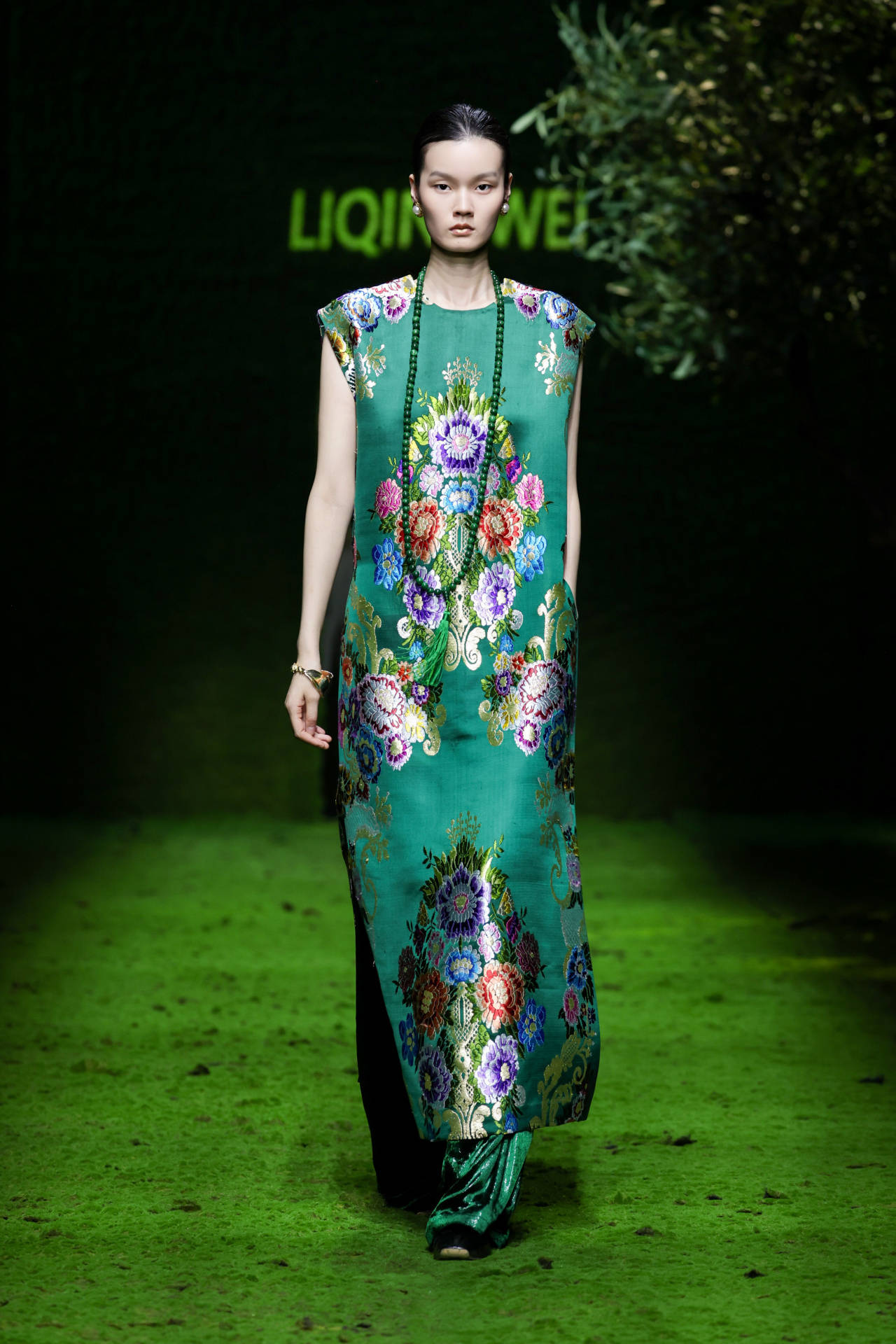 闵悦(如子之衣品牌)以汉代织锦纹样为灵感,运用提花香云纱、再生尼龙等环保面料,通过“天愿·地愿·人愿”三大篇章诠释新中式高定。