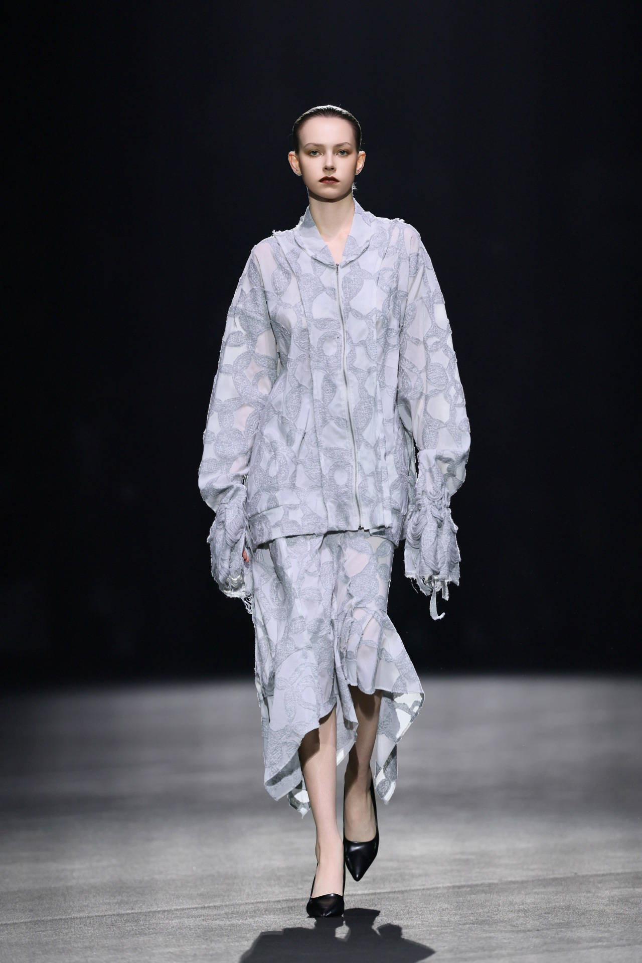 第一届“10+3”入选设计师、北京服装学院副院长邹游教授带来《纸上的叮嘱》,秀场系列灵感源自对过往文字与图像的重新审视与诠释,设计师以纸张为纽带,用拓片手法将历史痕迹呈现在服装上,借结构与材质的表达,剖开一段段历史切片。每件作品都如穿越时空的信笺,携着过往的叮嘱与当代人对话。