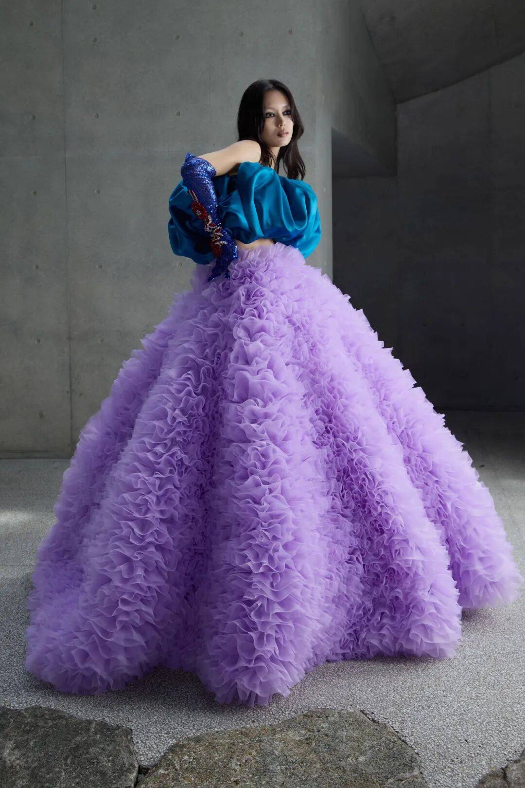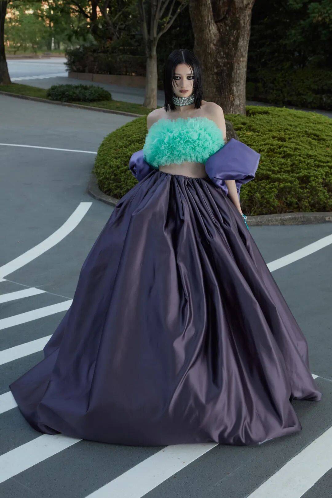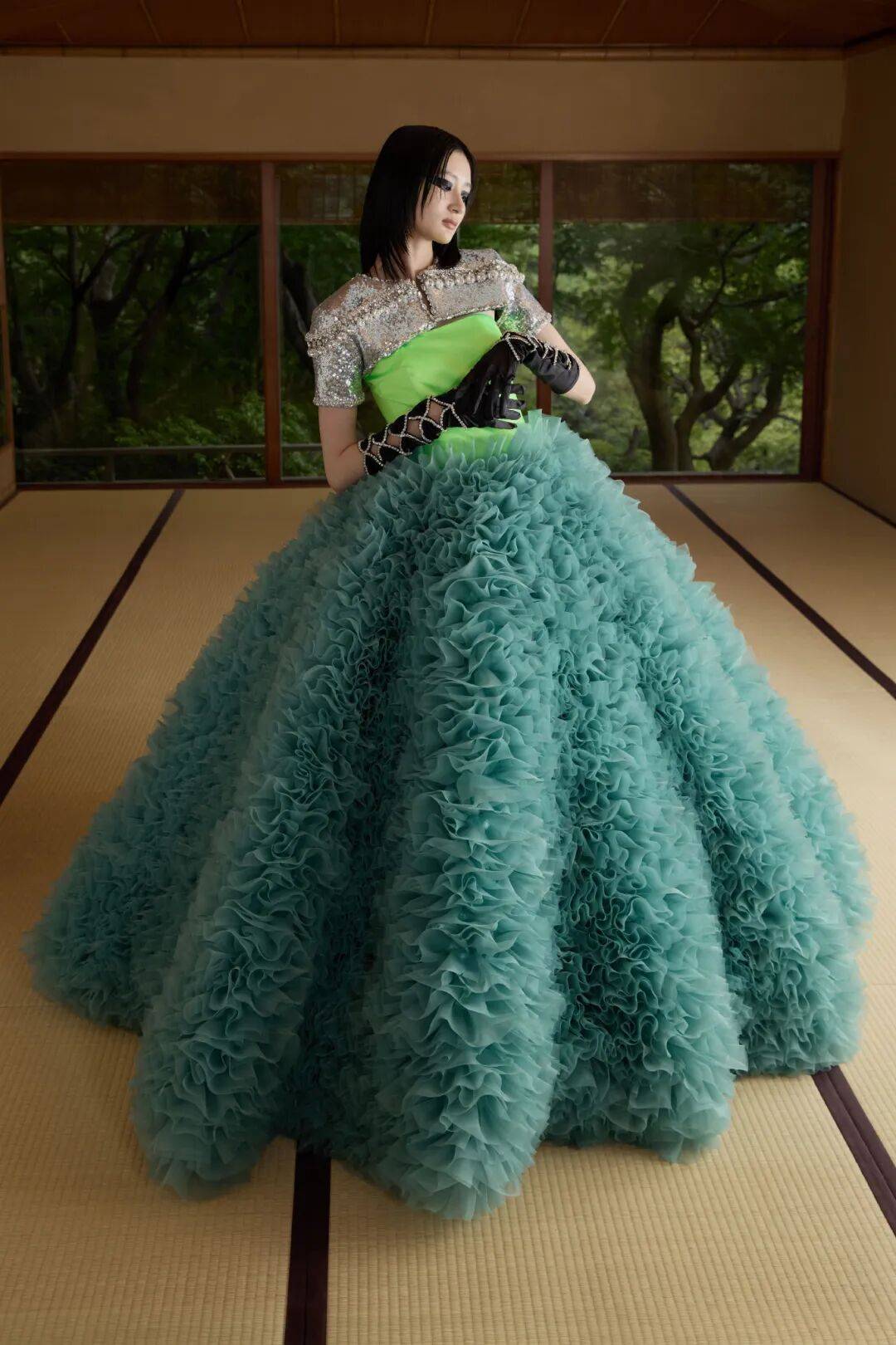 “沐浴球”式膨胀感:球形裙撑直径可达1.5米以上,无骨架支撑的蓬蓬裙通过手工褶裥实现自支撑结构,行走时如充气玩具般弹动,呼应《美少女战士》的梦幻战斗服。