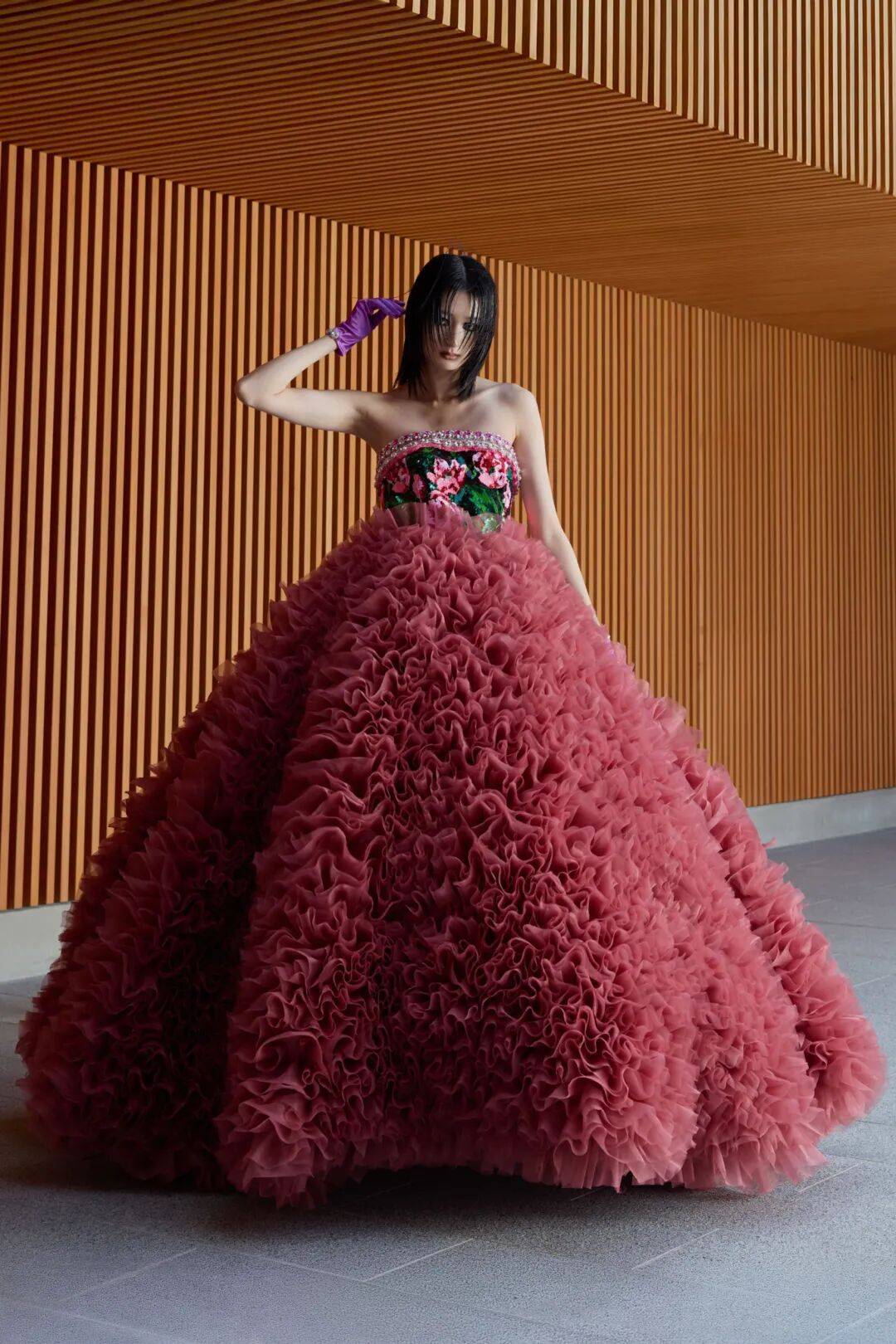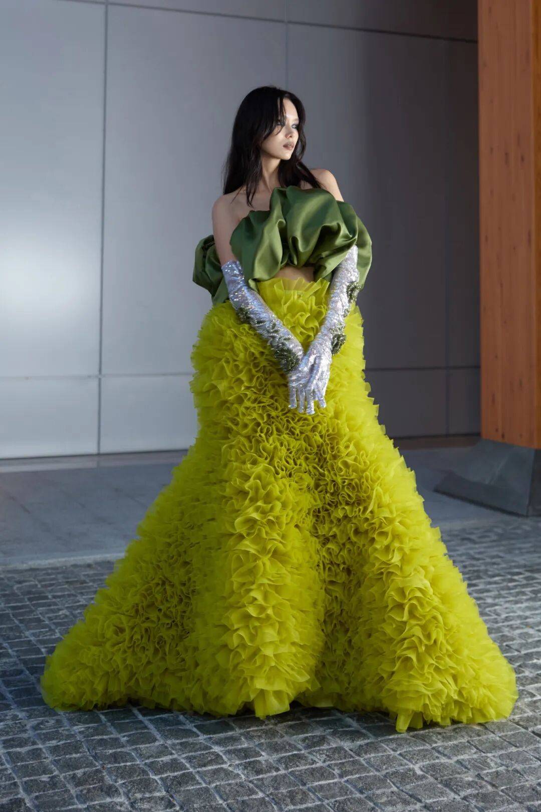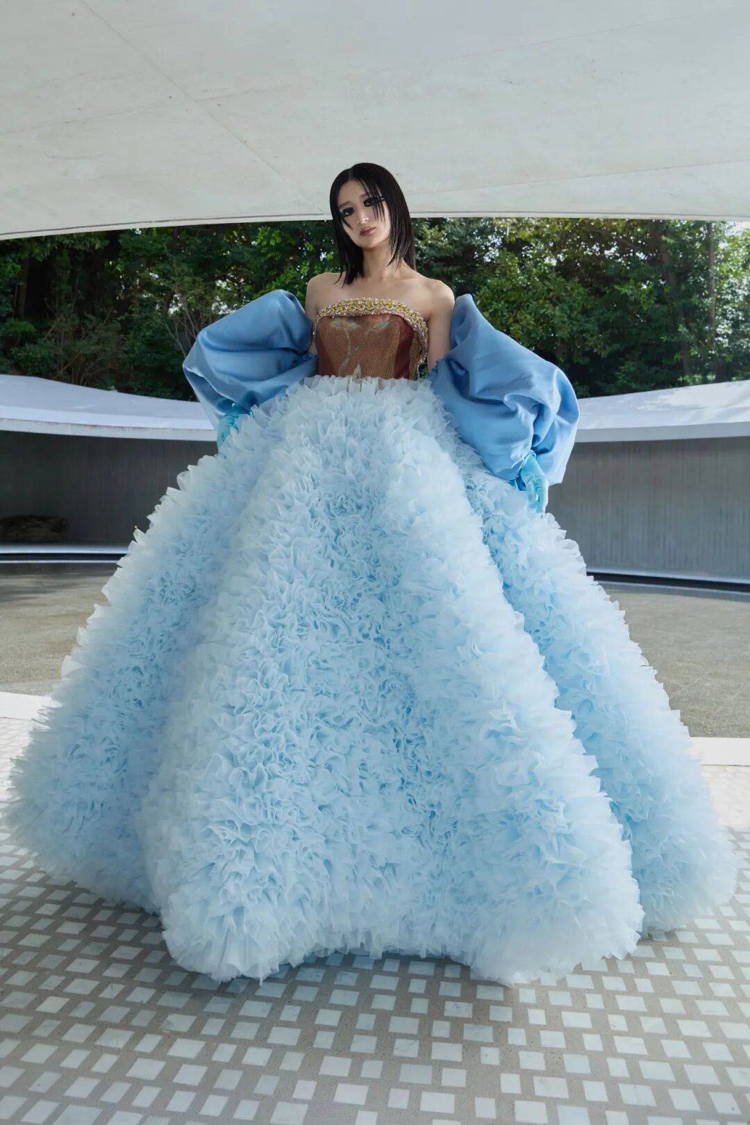 “沐浴球”式膨胀感:球形裙撑直径可达1.5米以上,无骨架支撑的蓬蓬裙通过手工褶裥实现自支撑结构,行走时如充气玩具般弹动,呼应《美少女战士》的梦幻战斗服。