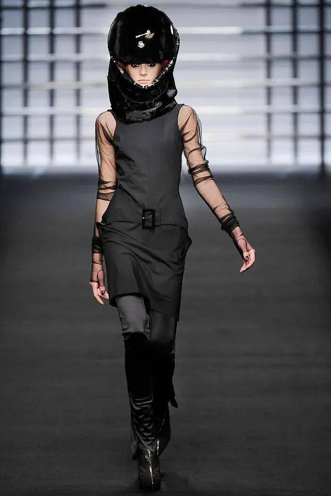 摒弃拉链与纽扣,仅用单条弹性束带固定全身,模特需他人协助才能穿上,批判快时尚的功利主义。