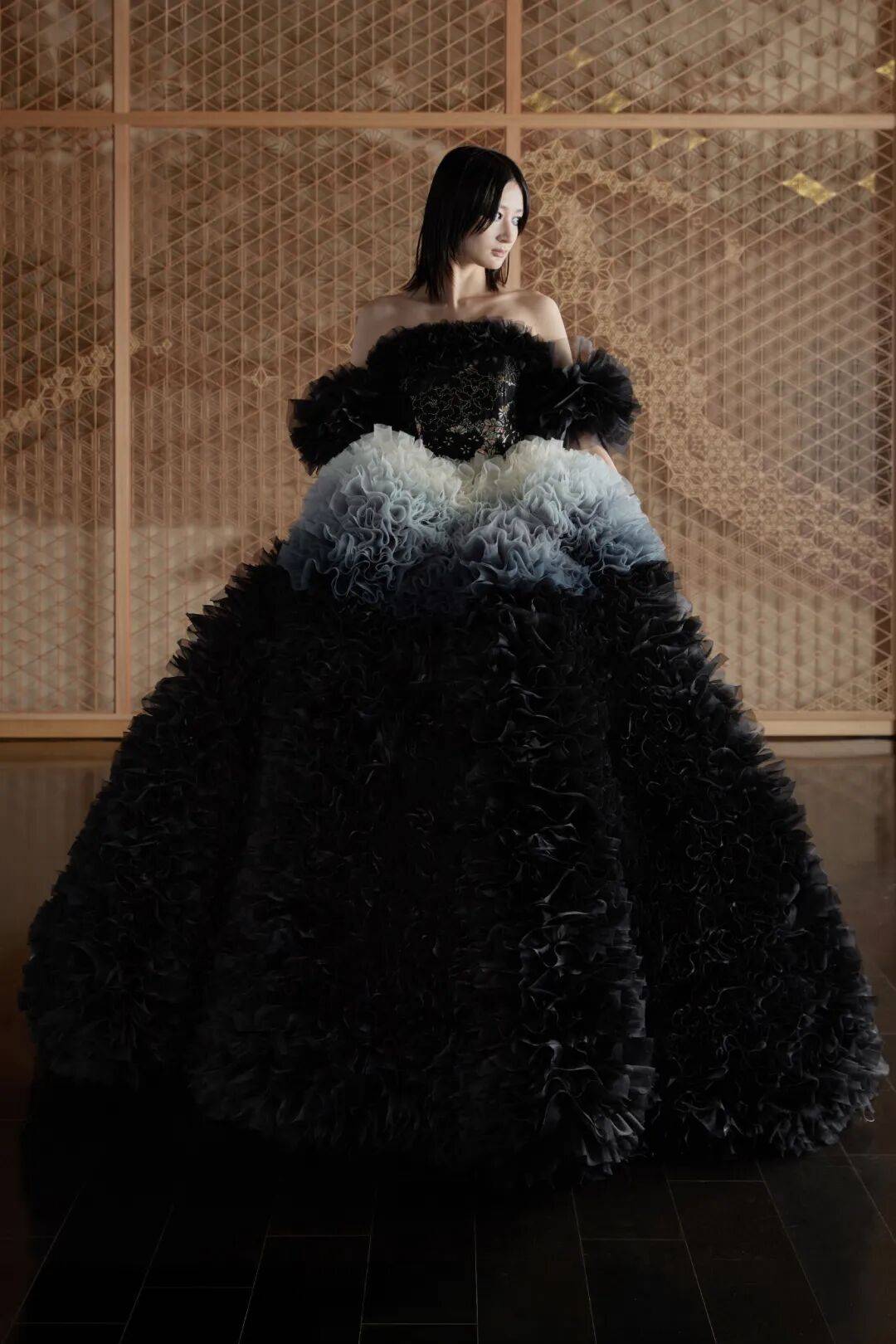 以日本传统丧葬仪式中的纸花为原型,通过数百米聚酯欧根纱堆叠出巨型层叠裙摆,模仿花圈的放射状形态。褶皱工艺模拟葬礼纸花的立体肌理,赋予肃穆符号以流动的生命力。