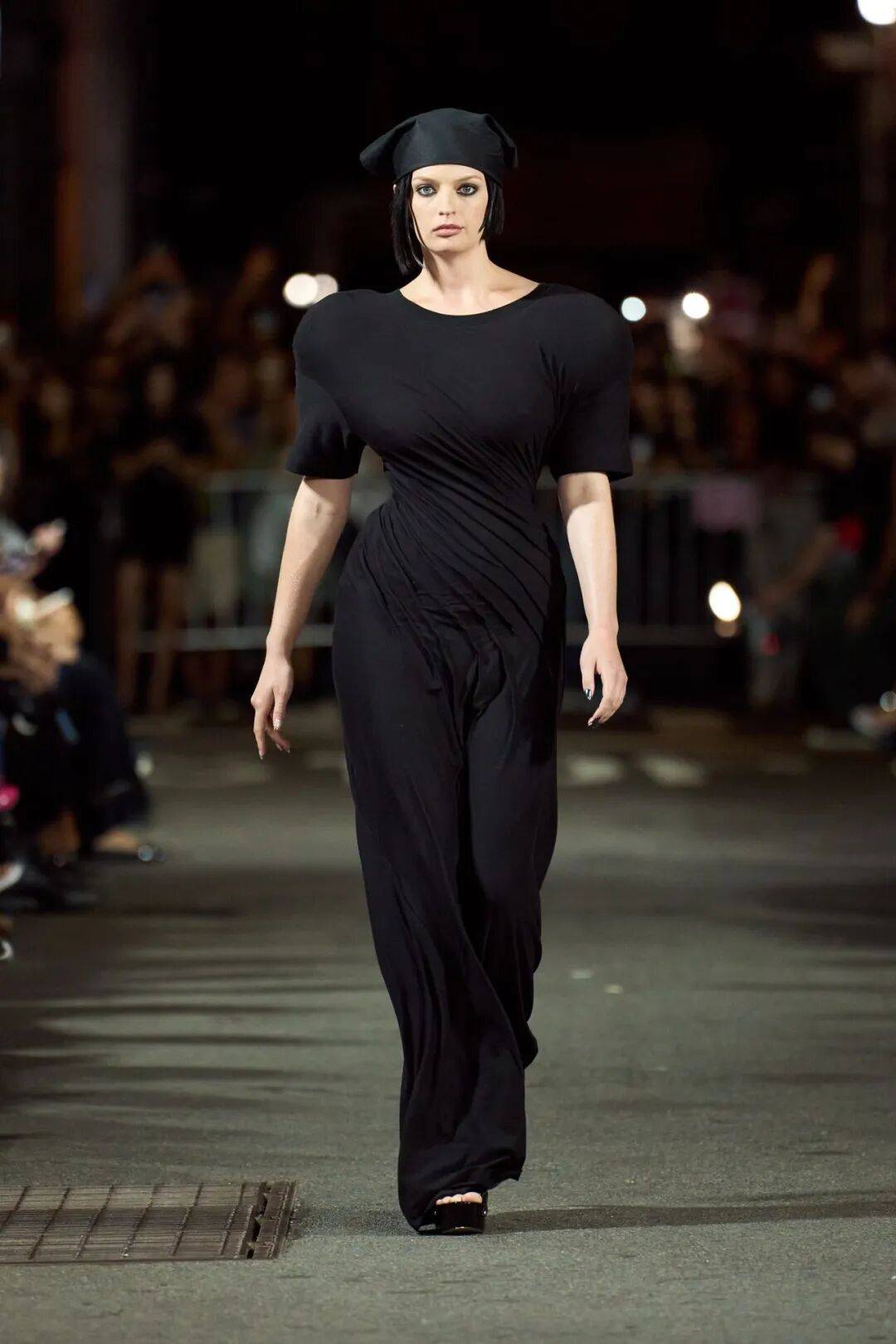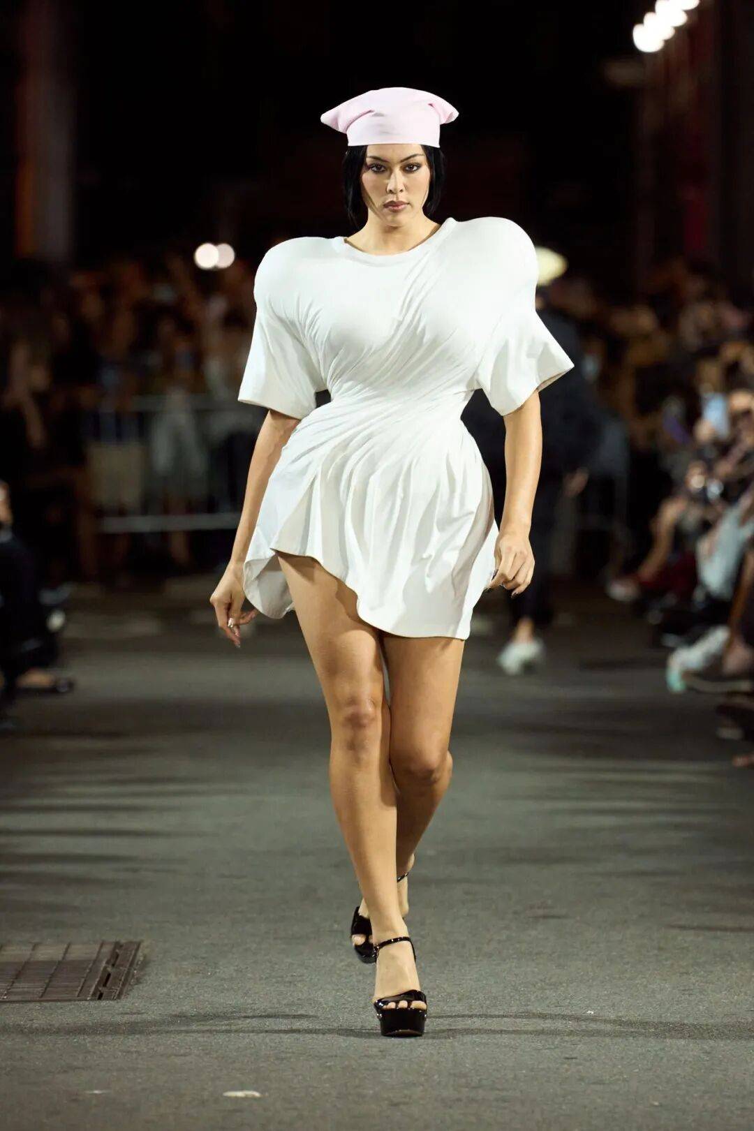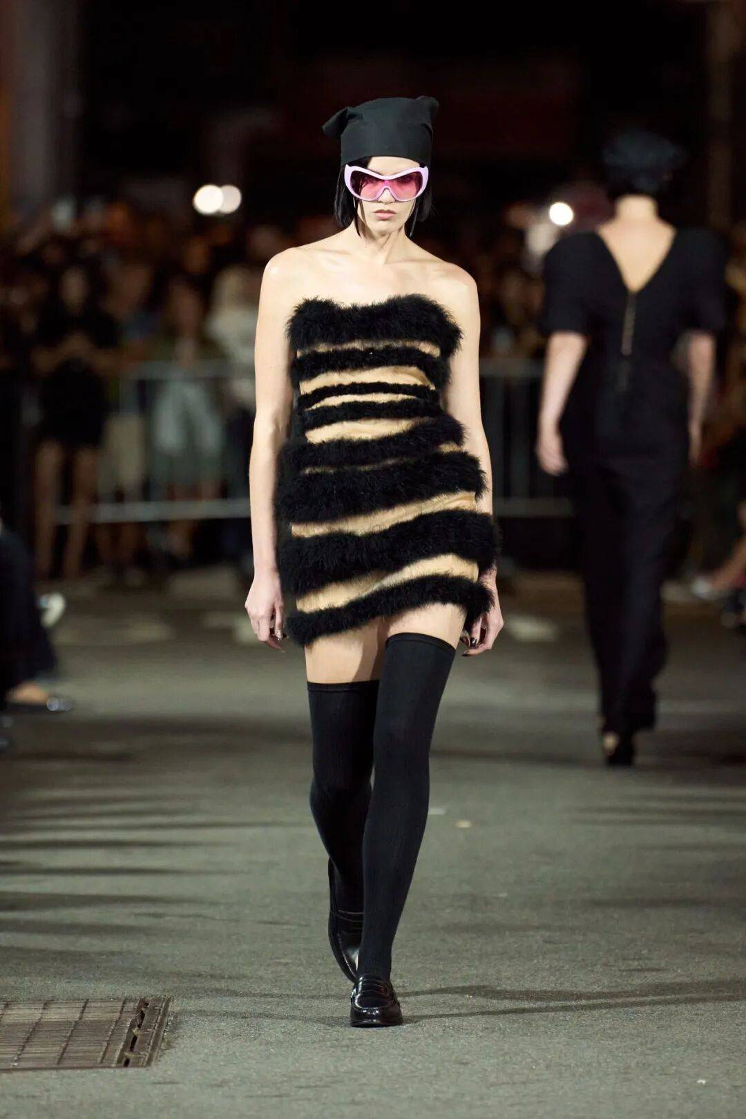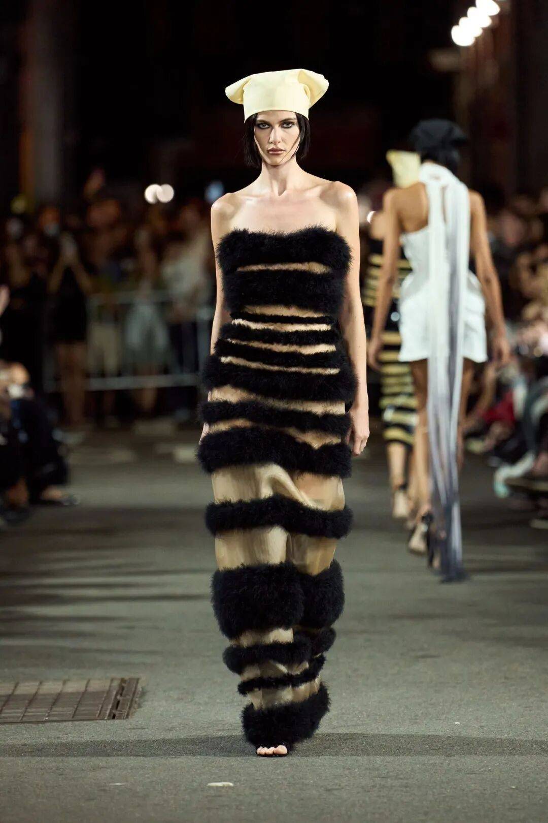 系列中扭曲的T恤式紧身胸衣礼服,灵感源自他童年目睹加利西亚女性在海边劳作时浸湿的衣衫——紧贴曲线的剪裁与镂空细节,既是对女性身体的诗意描摹,亦是对“得体”规则的挑衅。条纹编织上衣与拼接乳胶长裙的碰撞,则被解构为“航海条纹与纽约条形码的共生”,横向条纹在网纱芭蕾舞裙上化作流动的都市密码。