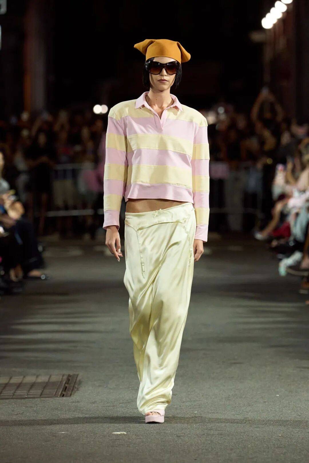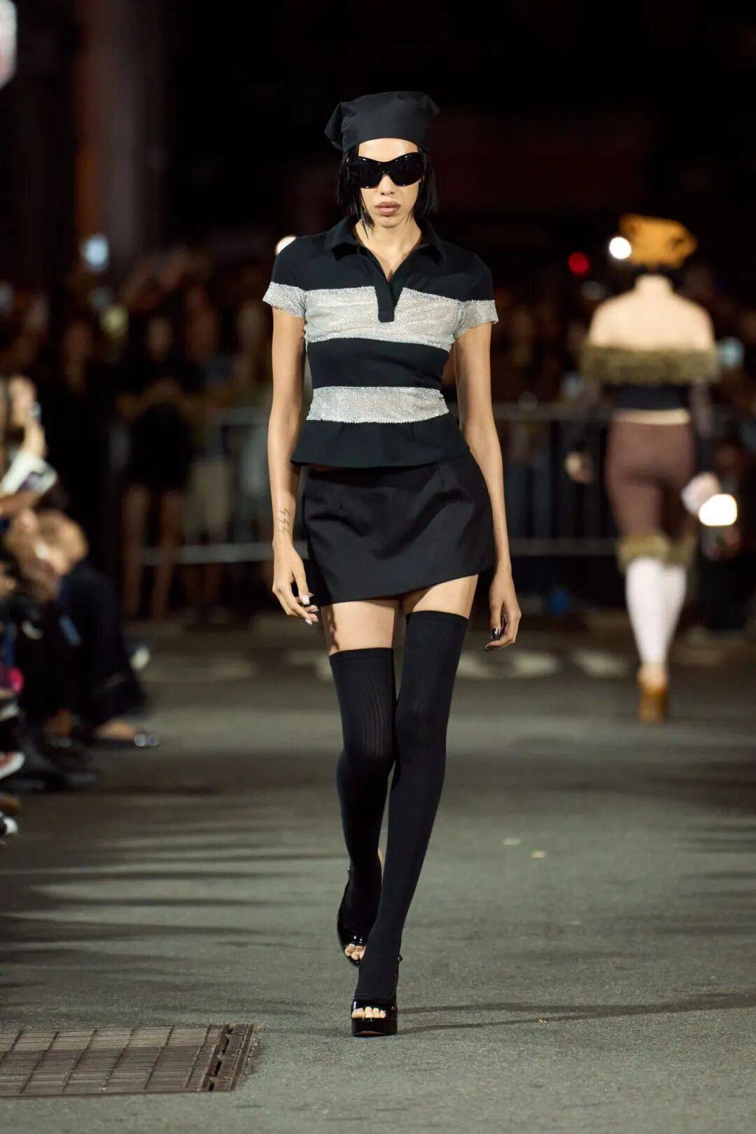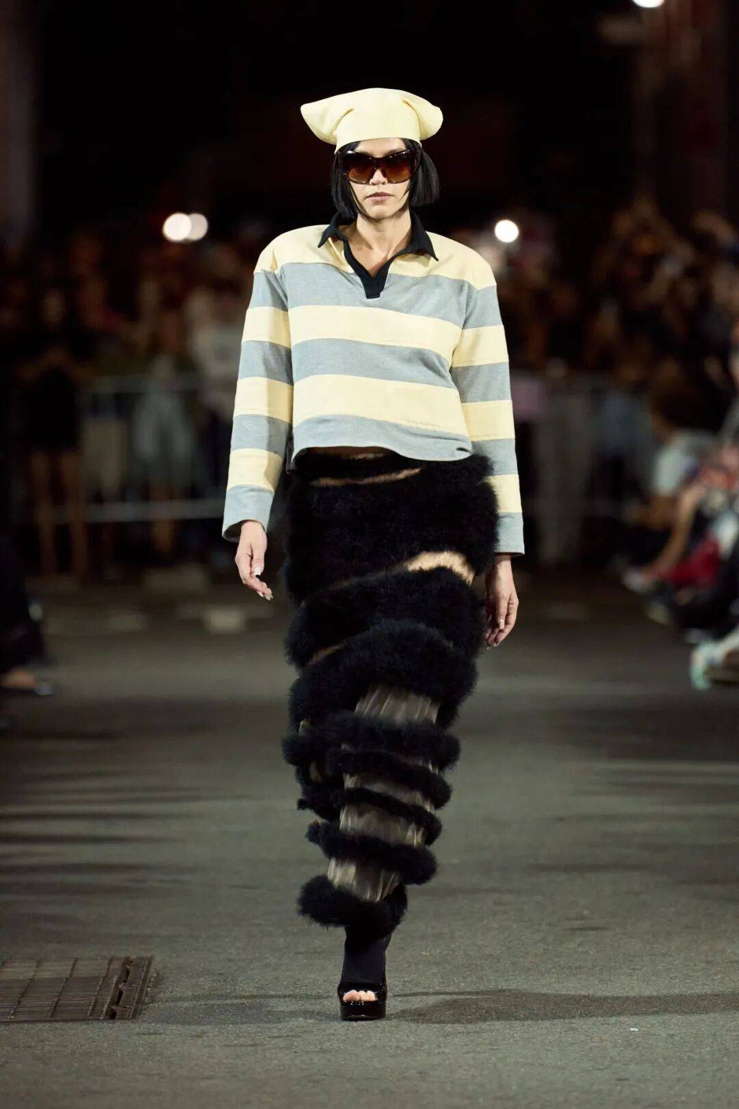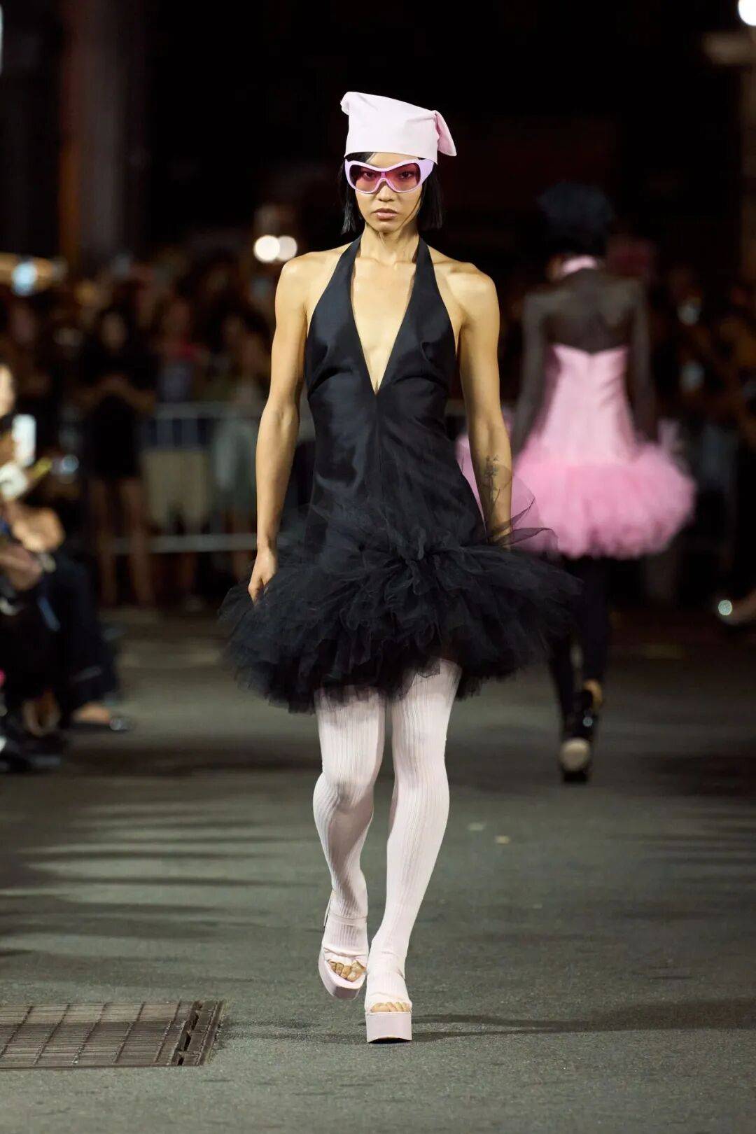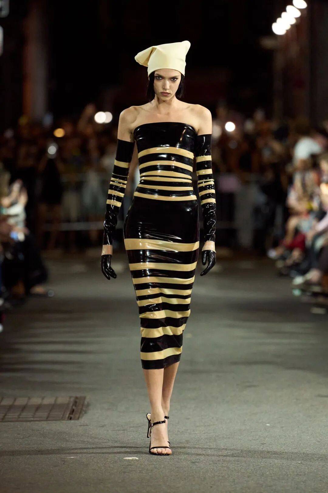 尽管被诟病“过度戏剧化”,Cowan始终将工艺视为态度载体。本季大量运用明线缝制、金属镶板与手工钩编,将街头元素提升至高级定制维度。例如航海条纹上衣的激光切割工艺、乳胶长裙的渐变涂层处理,以及网纱拼接处的隐形支撑结构,皆以技术细节消解浮夸感。这种对“精致反叛”的追求,延续了其2025春夏系列中“戏剧性露肤”的核心理念。