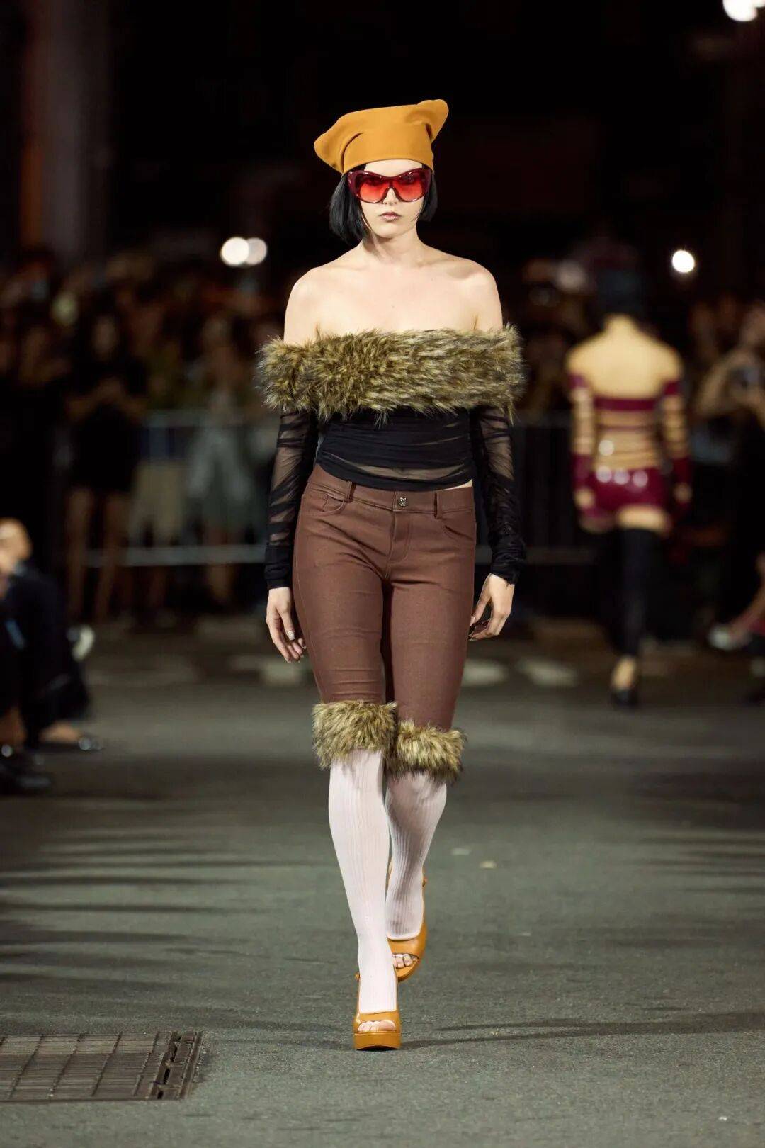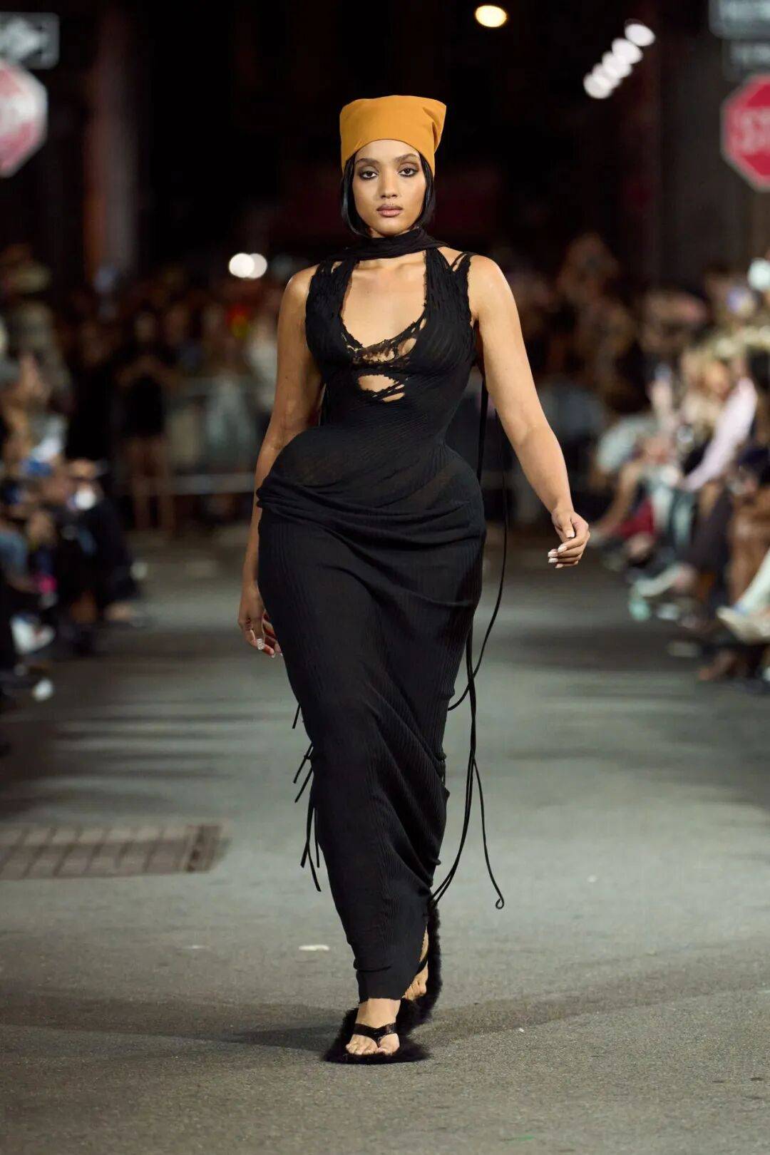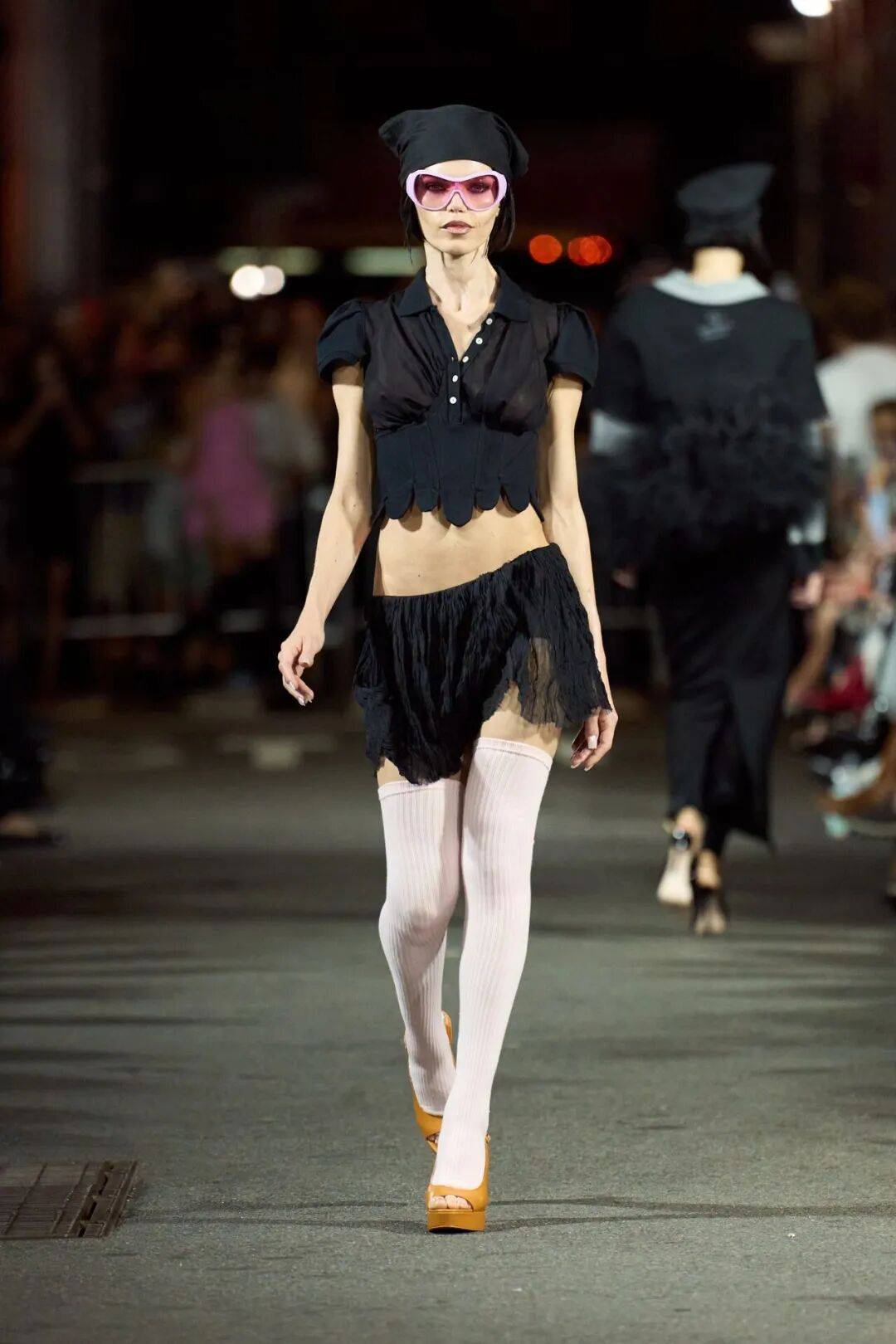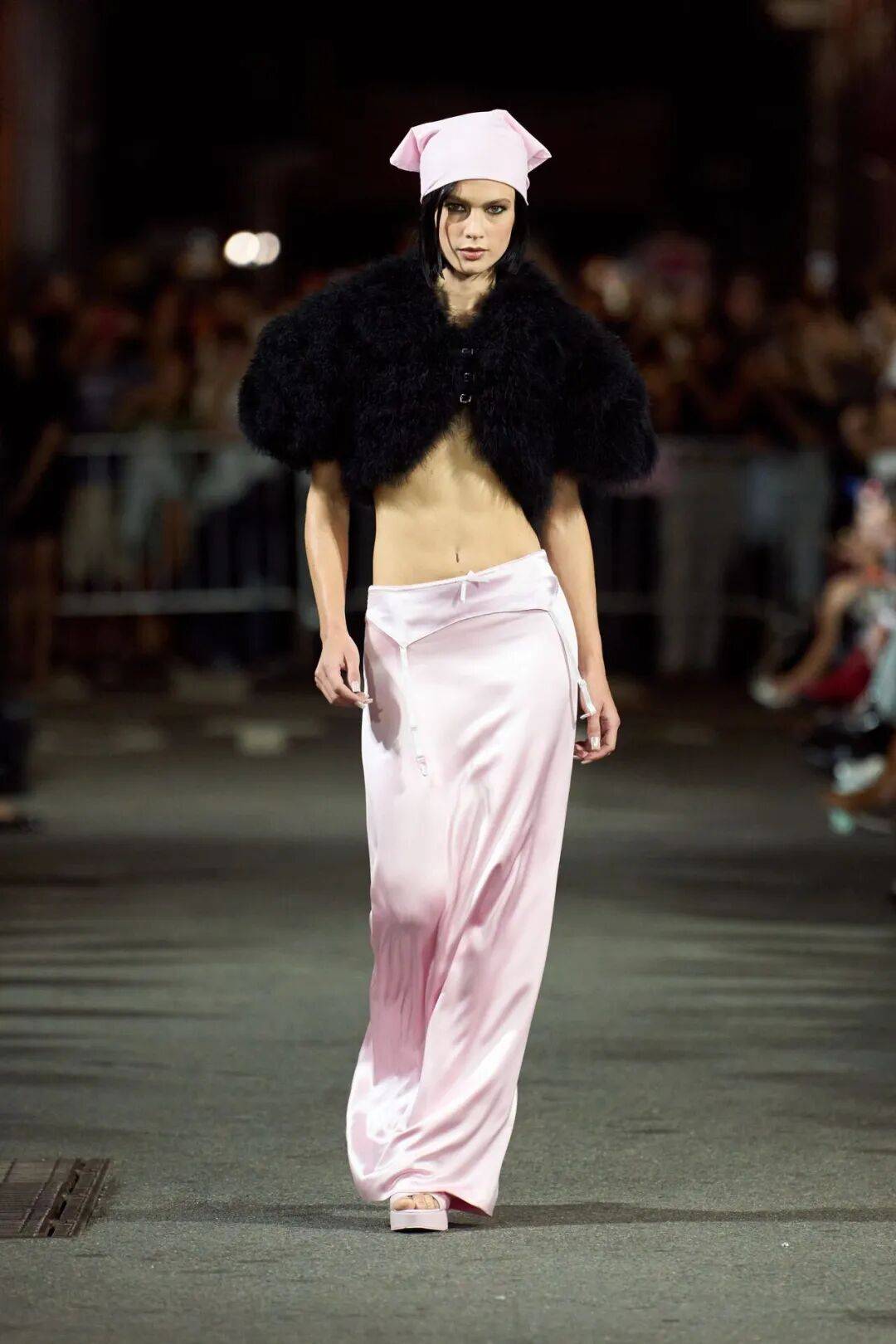 尽管被诟病“过度戏剧化”,Cowan始终将工艺视为态度载体。本季大量运用明线缝制、金属镶板与手工钩编,将街头元素提升至高级定制维度。例如航海条纹上衣的激光切割工艺、乳胶长裙的渐变涂层处理,以及网纱拼接处的隐形支撑结构,皆以技术细节消解浮夸感。这种对“精致反叛”的追求,延续了其2025春夏系列中“戏剧性露肤”的核心理念。