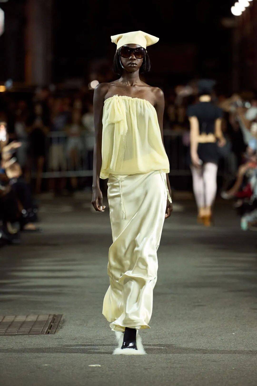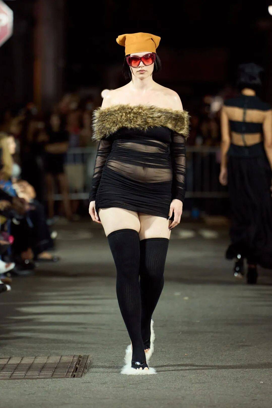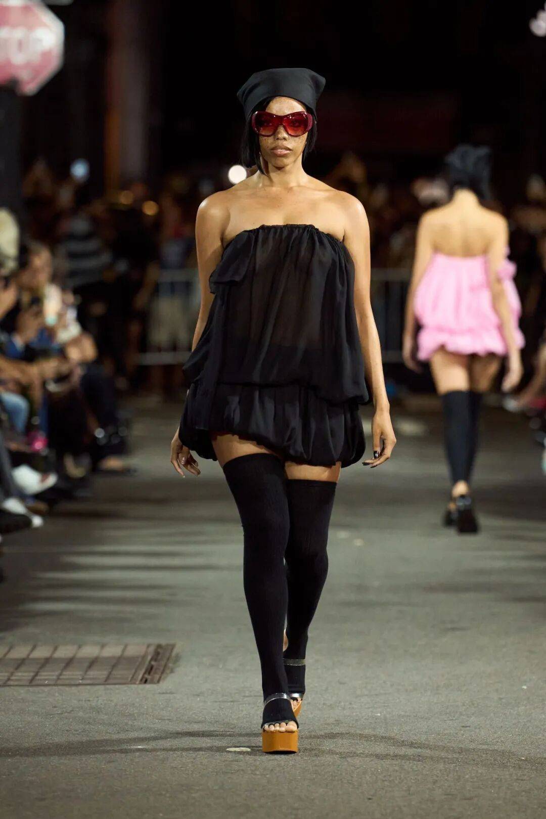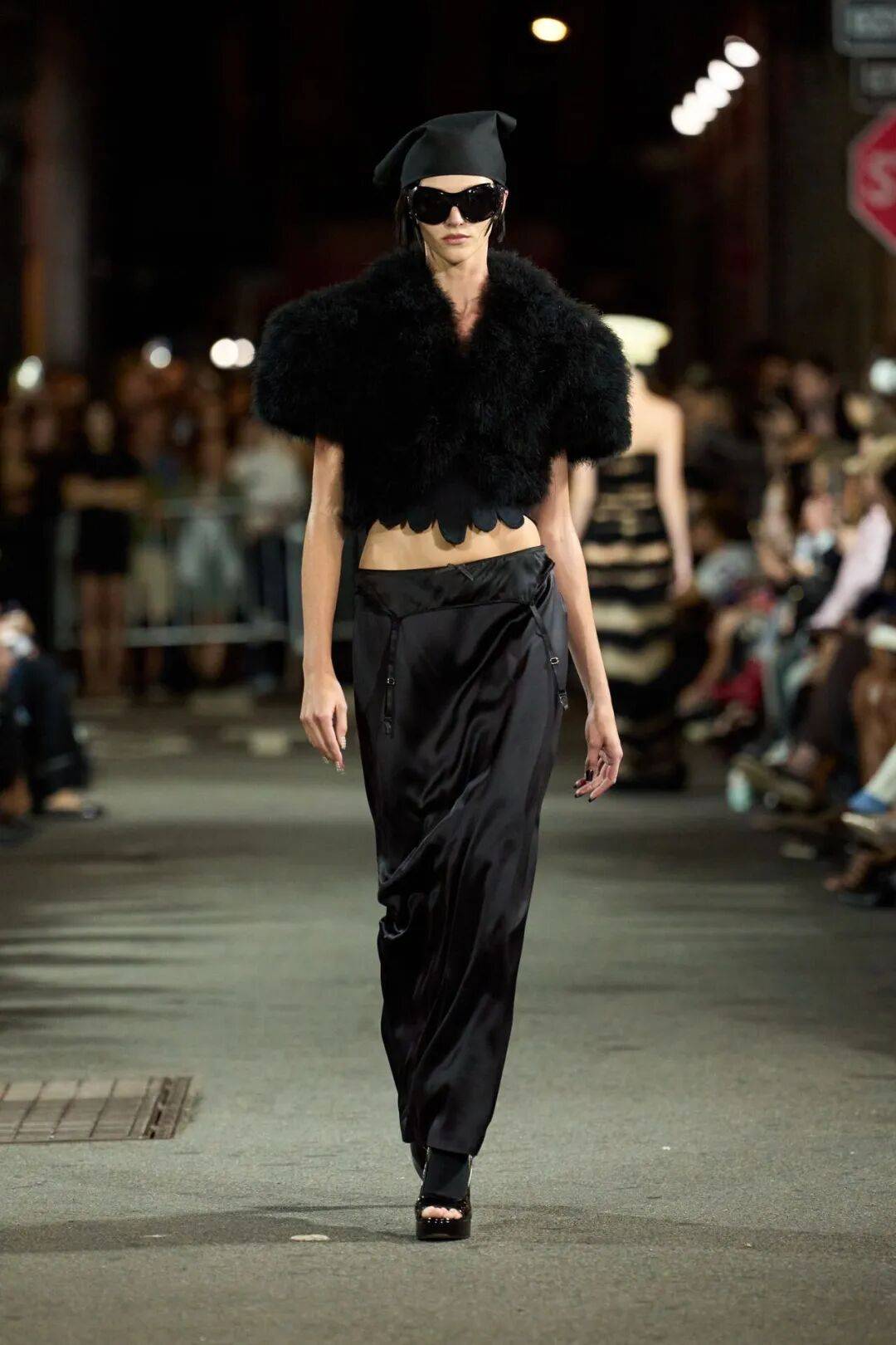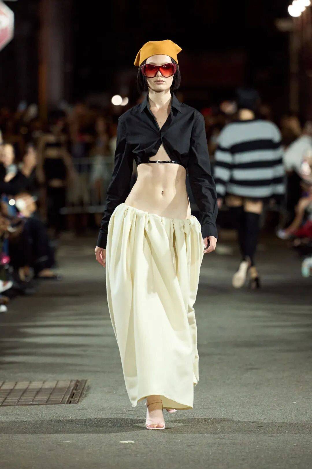 尽管被诟病“过度戏剧化”,Cowan始终将工艺视为态度载体。本季大量运用明线缝制、金属镶板与手工钩编,将街头元素提升至高级定制维度。例如航海条纹上衣的激光切割工艺、乳胶长裙的渐变涂层处理,以及网纱拼接处的隐形支撑结构,皆以技术细节消解浮夸感。这种对“精致反叛”的追求,延续了其2025春夏系列中“戏剧性露肤”的核心理念。