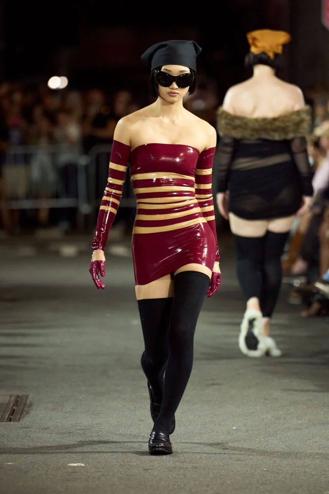 该系列以深V剪裁、乳胶材质和芭蕾轮廓为核心,融合地下涂鸦文化与反叛朋克元素,打造戏剧化视觉冲击。