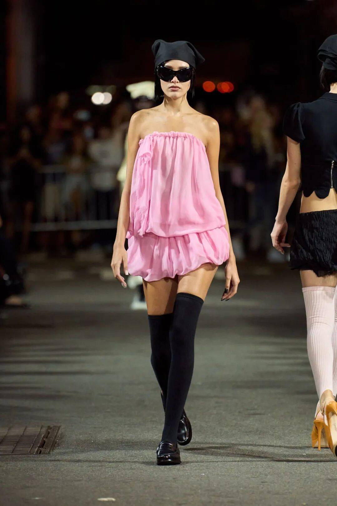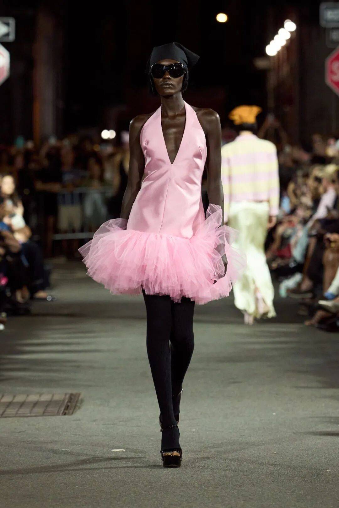 Cowan通过凌厉剪裁与材质实验,彻底打破性别界限。金属玫瑰装饰的西装外套、露背乳胶长裙与解构主义衬衫裙,以中性色调与夸张廓形重构身份认知。其中深V粉红鸡尾酒裙堪称矛盾体:蓬松的芭蕾薄纱裙摆既非纽约酷感亦非西班牙慵懒,却以芭比梦幻的粉调直击纯真与欲望的临界点——这源于设计师对童年西班牙时光的追忆,