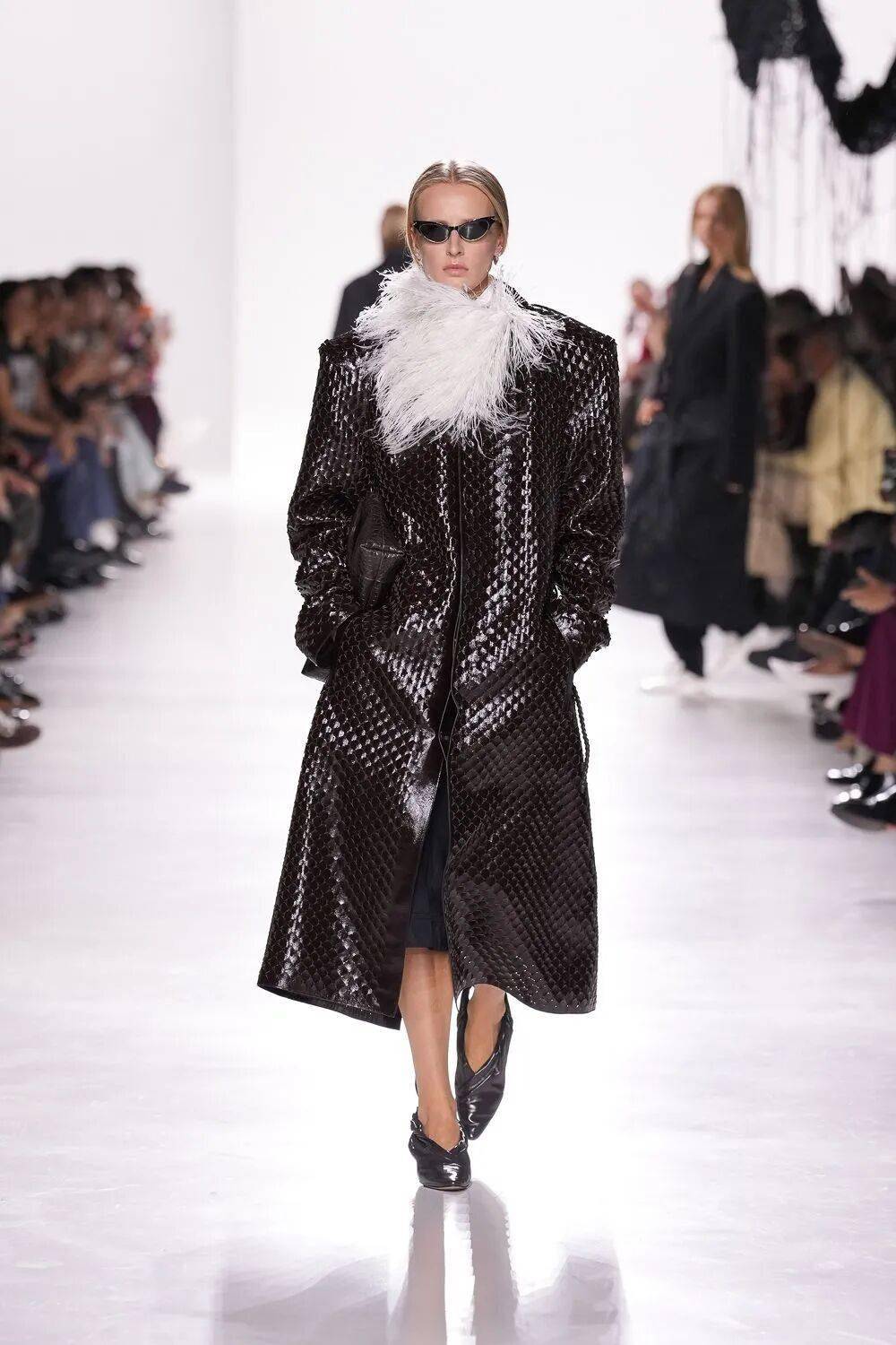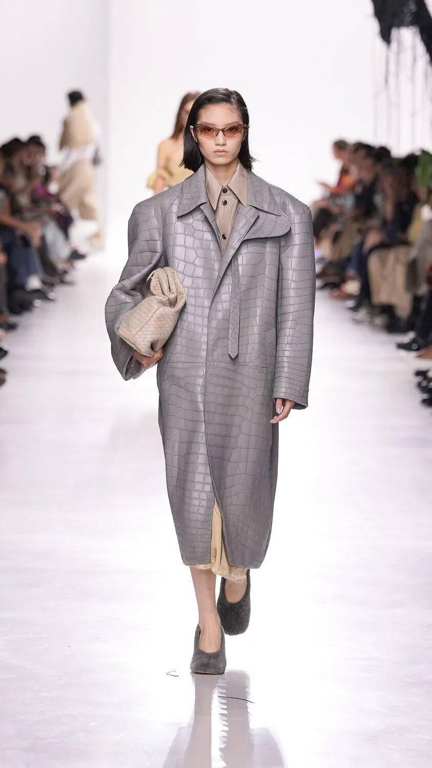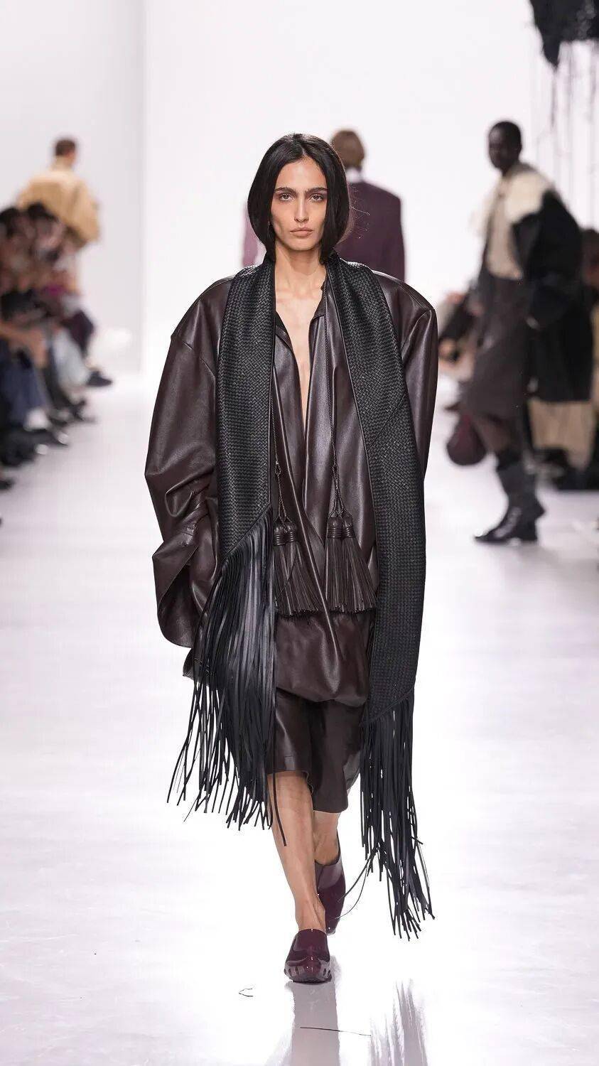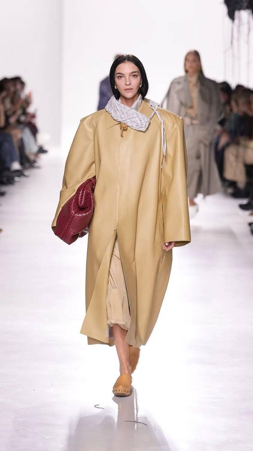 Bottega Veneta标志性的Intrecciato皮革编织作为本季关键被Louise Trotter大肆应用在服装、手袋和配件中,皮革斗篷、外套、裤装、裙子等单品纷纷亮相