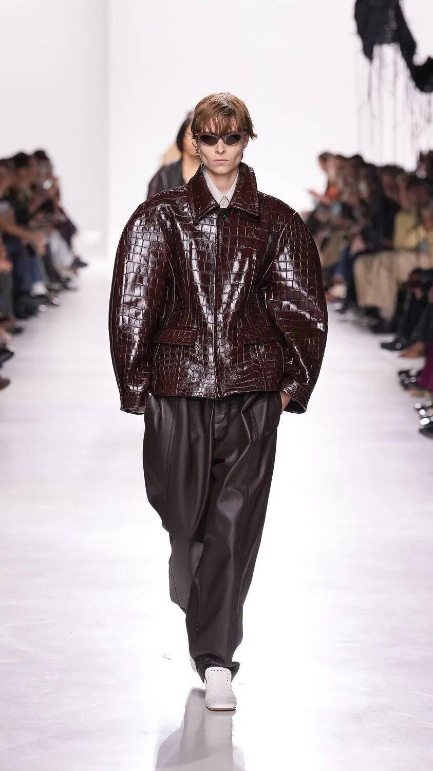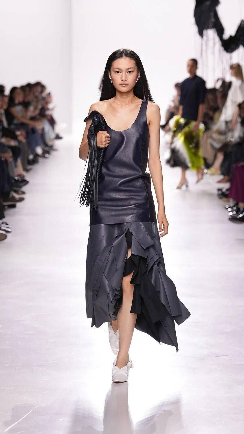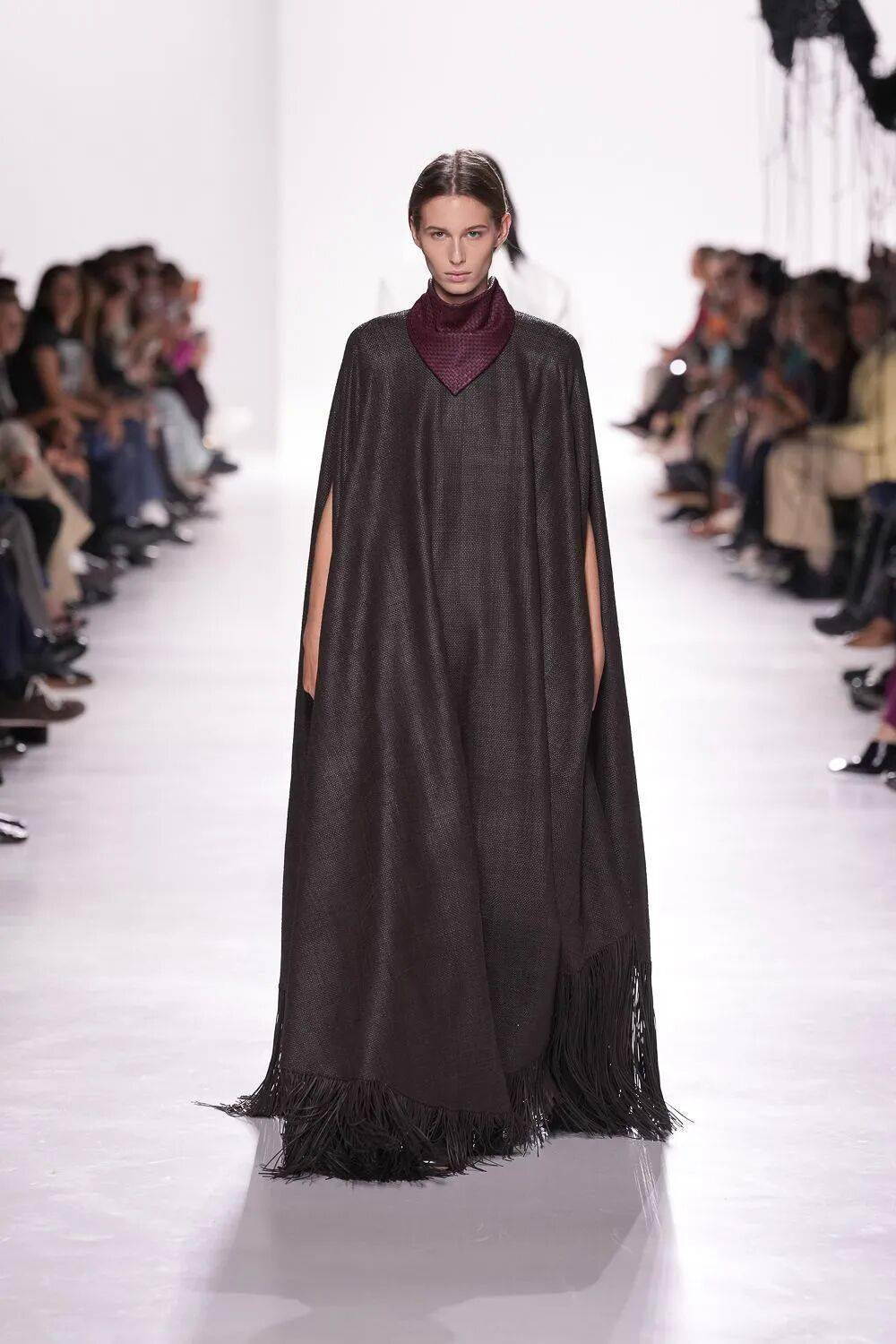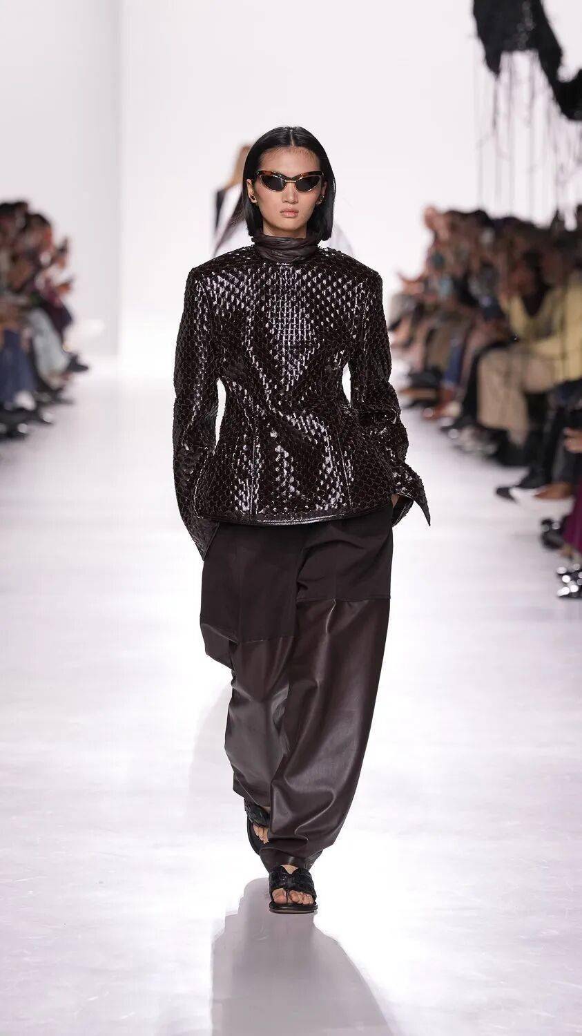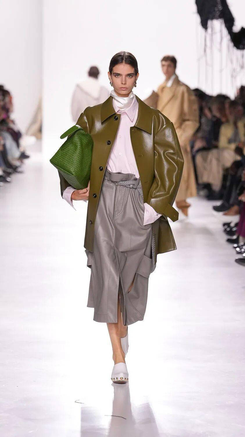 Bottega Veneta标志性的Intrecciato皮革编织作为本季关键被Louise Trotter大肆应用在服装、手袋和配件中,皮革斗篷、外套、裤装、裙子等单品纷纷亮相