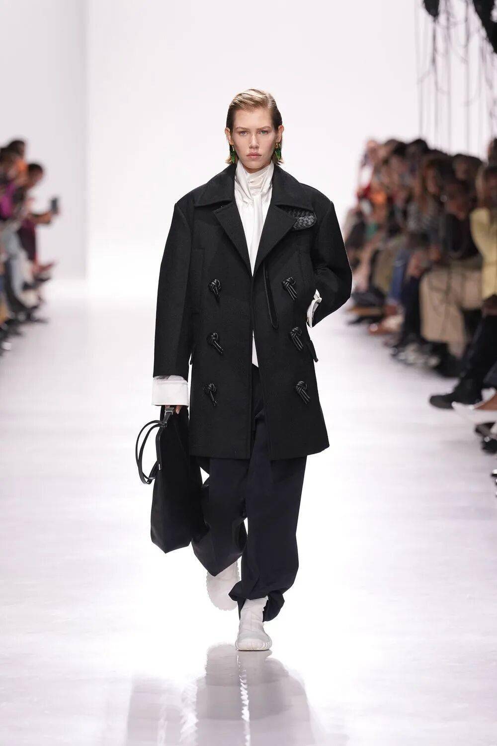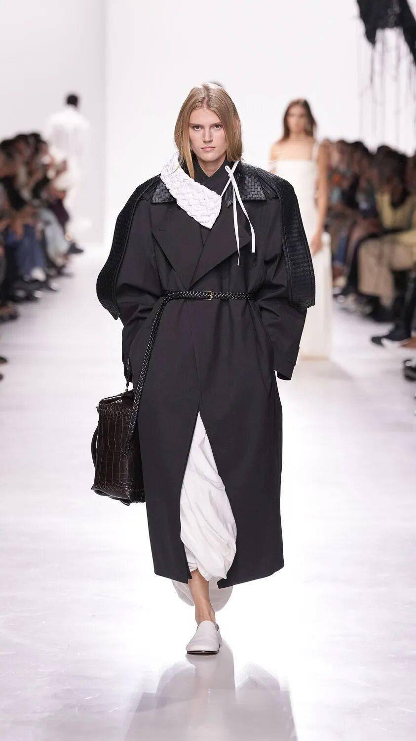 Bottega Veneta 2026春夏系列发布秀开场Look是一件黑色大衣