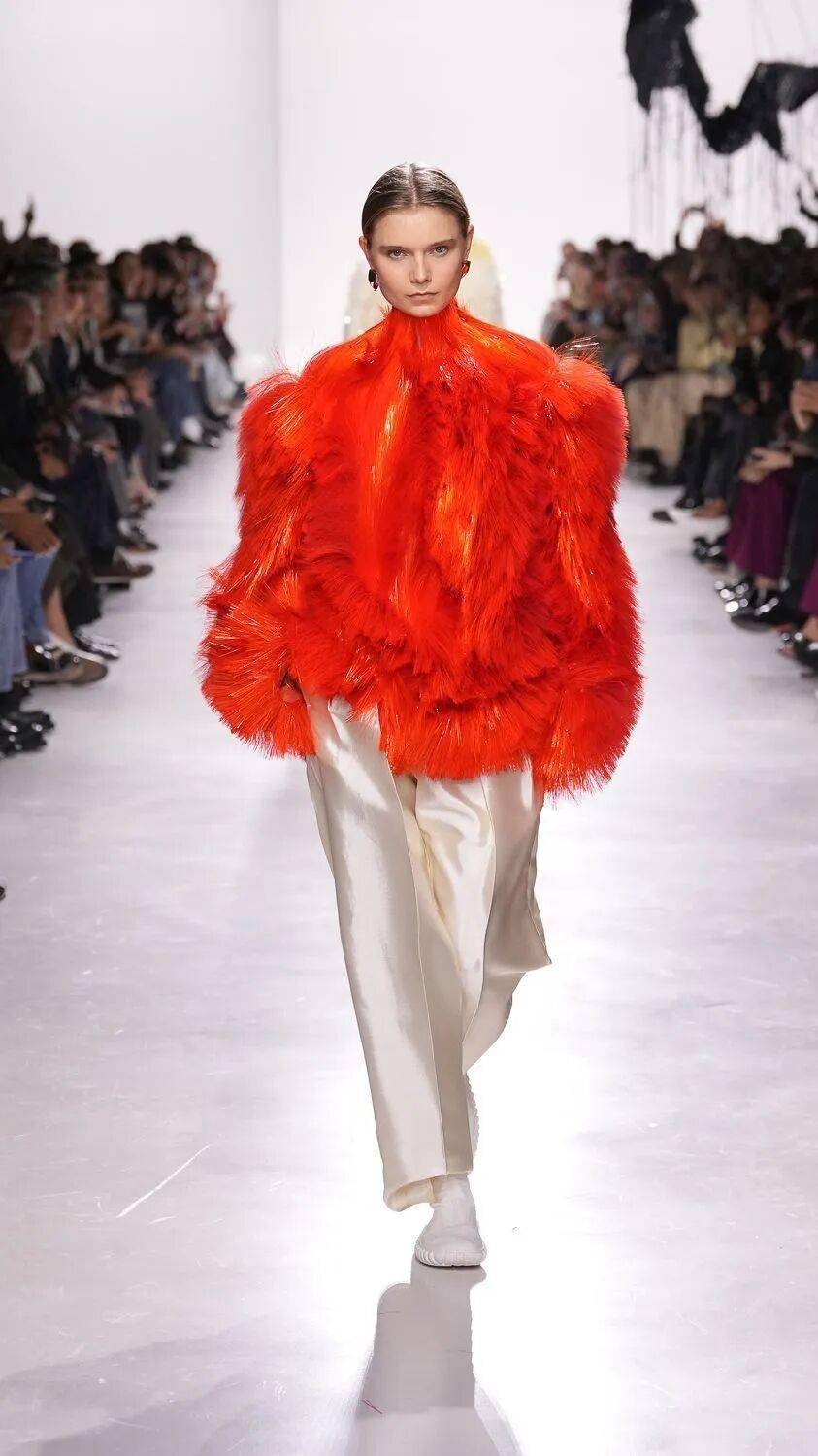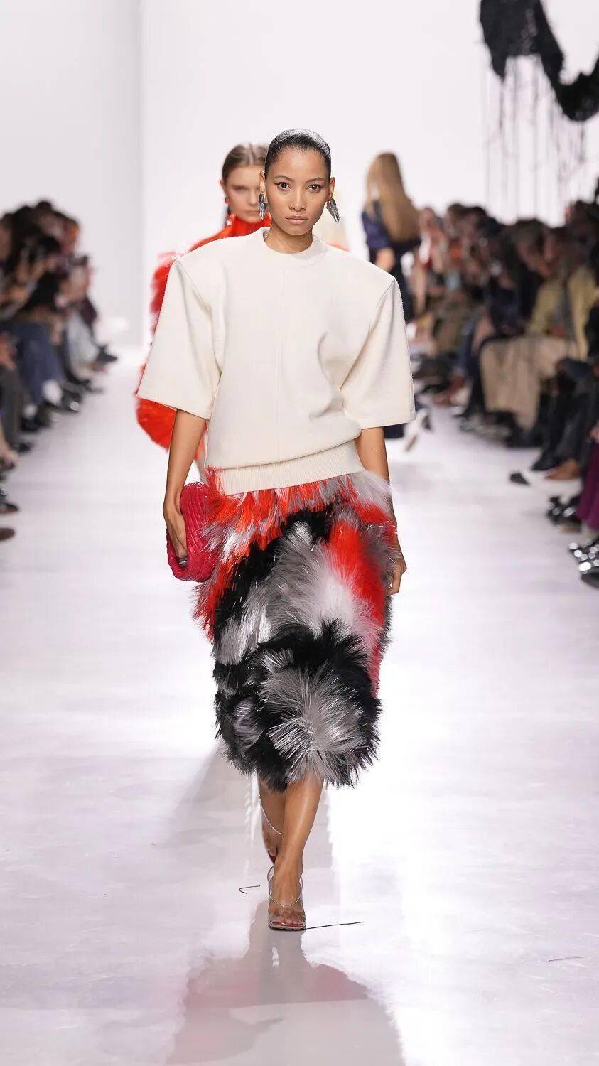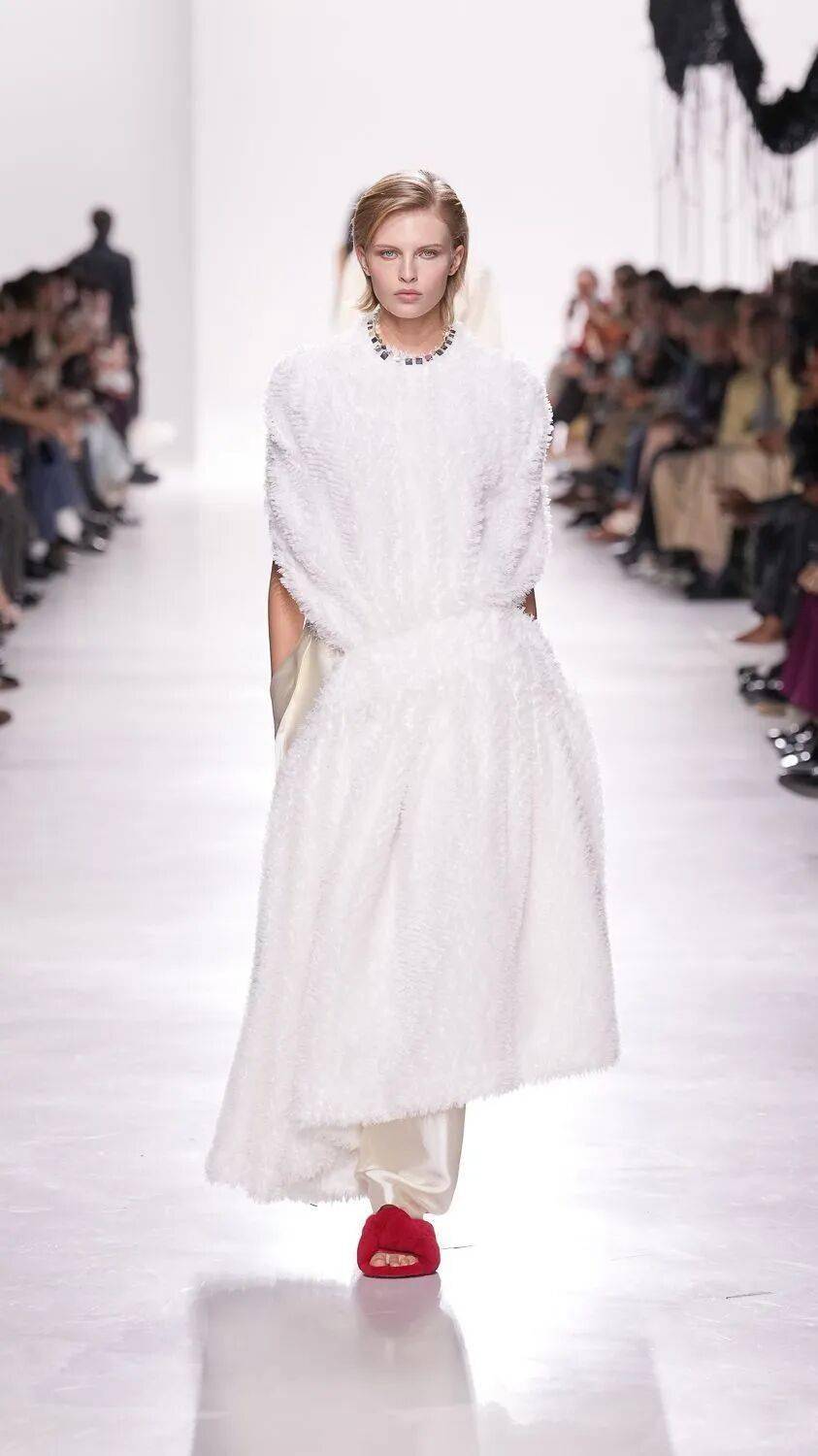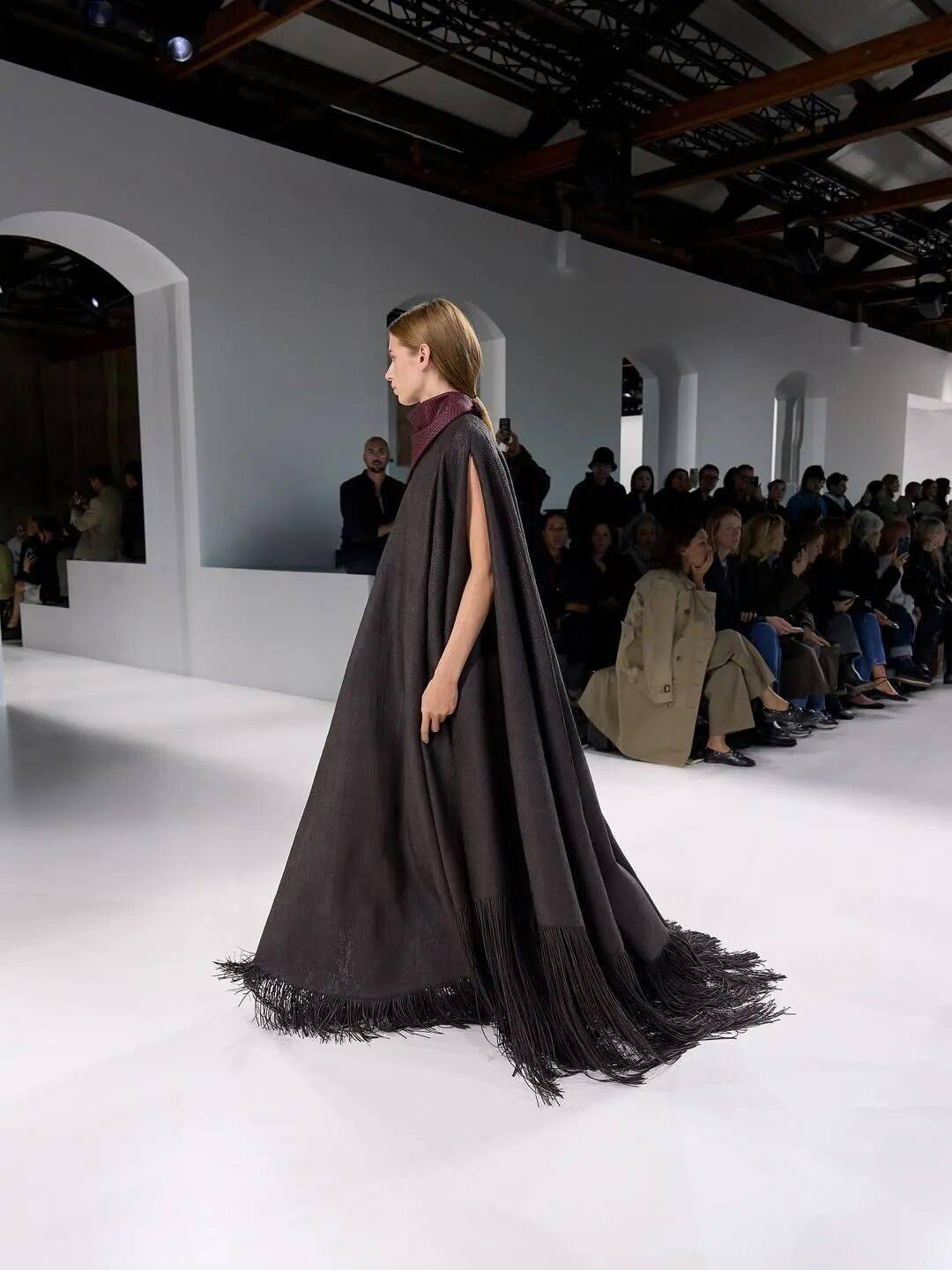 特罗特深入挖掘该品牌注重工艺的基因,并以惊人的自信对其进行了拓展。她将著名的 intrecciato 编织工艺变成了令人惊叹的作品 —— 一件剪裁考究的外套,编织得宛如蛇鳞;一件拖地斗篷,由极细的皮革条精心制作而成;一件长袍外套,上面点缀着轻盈的羽毛,仿佛会从 T 台上飘然而去。动感是这个系列的核心:裙摆拖着一条条皮革;微褶连衣裙上的流苏勾勒出身体的曲线;还有那些闪闪发光的 “毛衣”—— 它们由回收玻璃纤维雕刻而成,在灯光下呈现出橙色、红色和蓝色的光泽。“它有皮毛的质感,却像玻璃一样灵动,” 她解释道。在她手中,可持续发展不再是枯燥的说教,而是一场视觉盛宴。