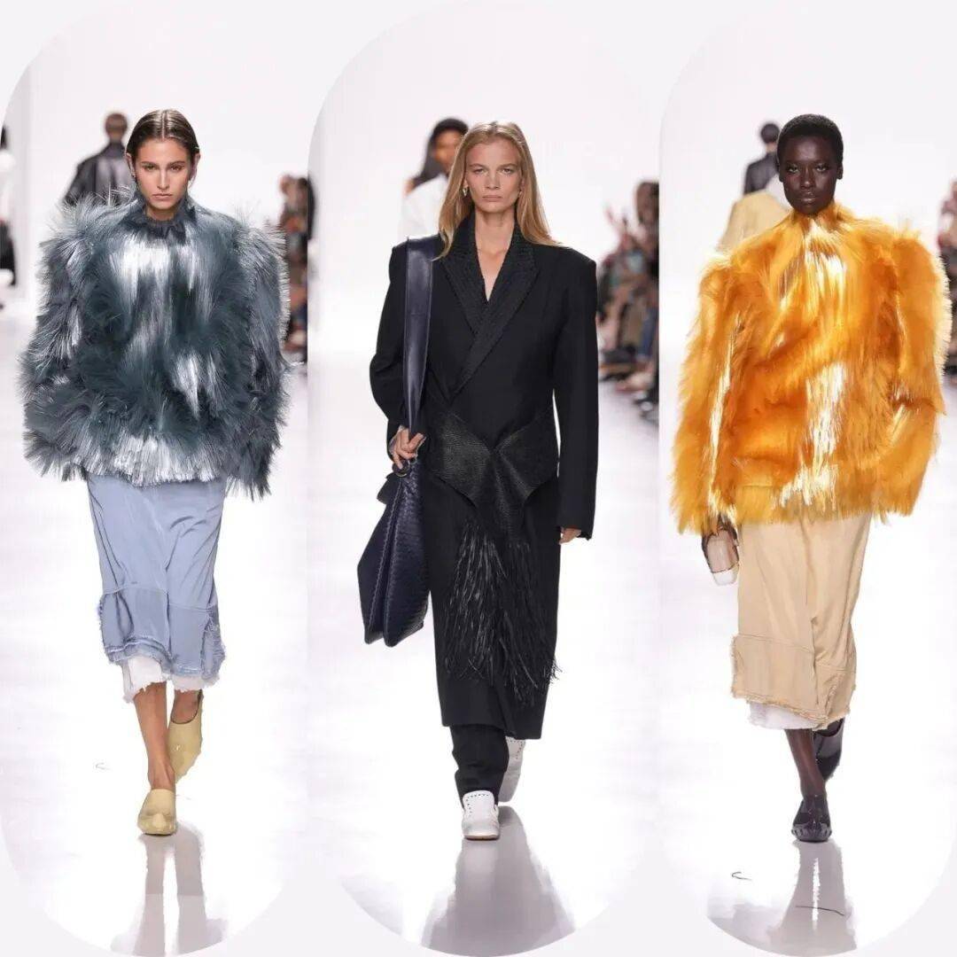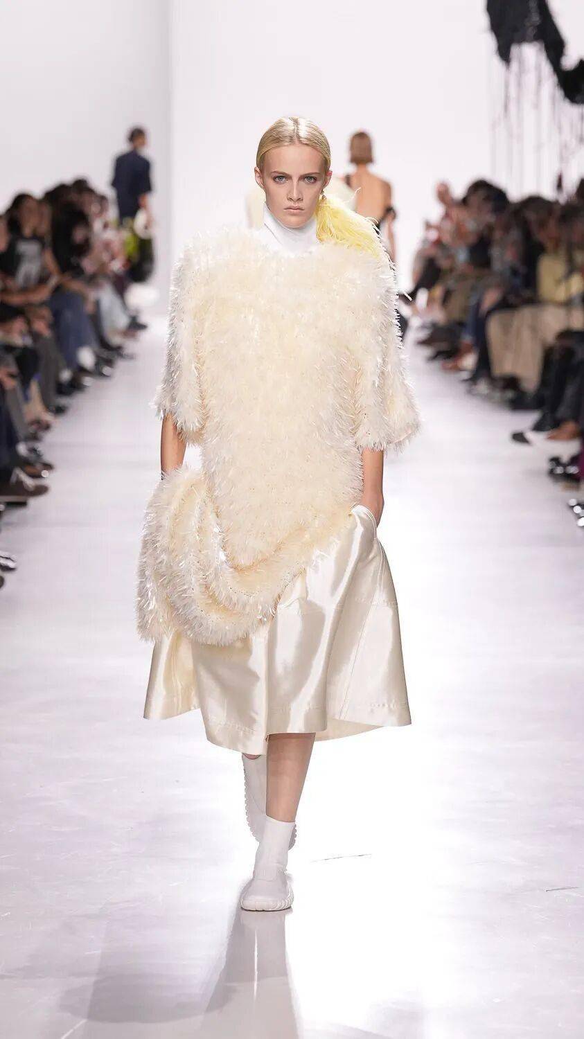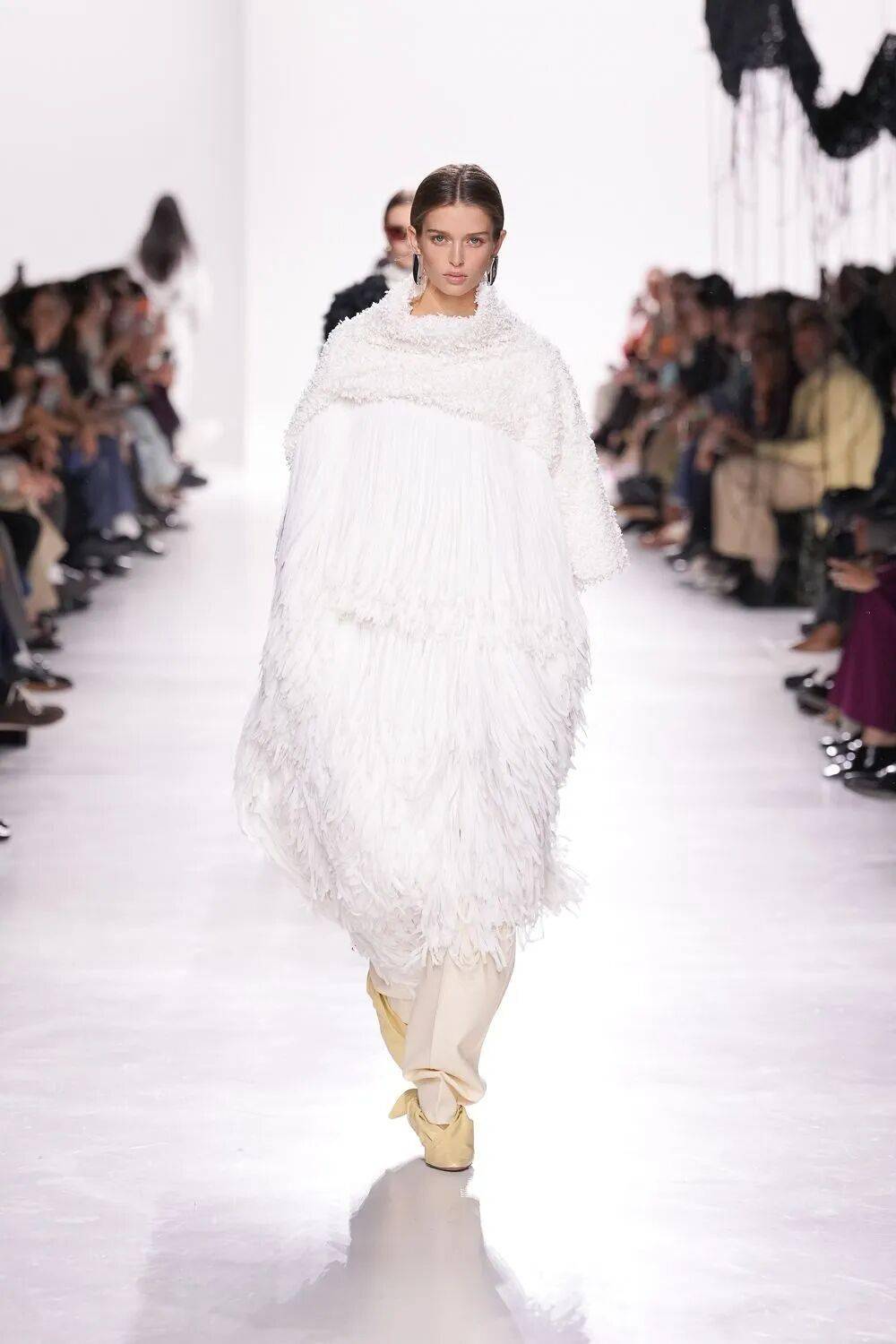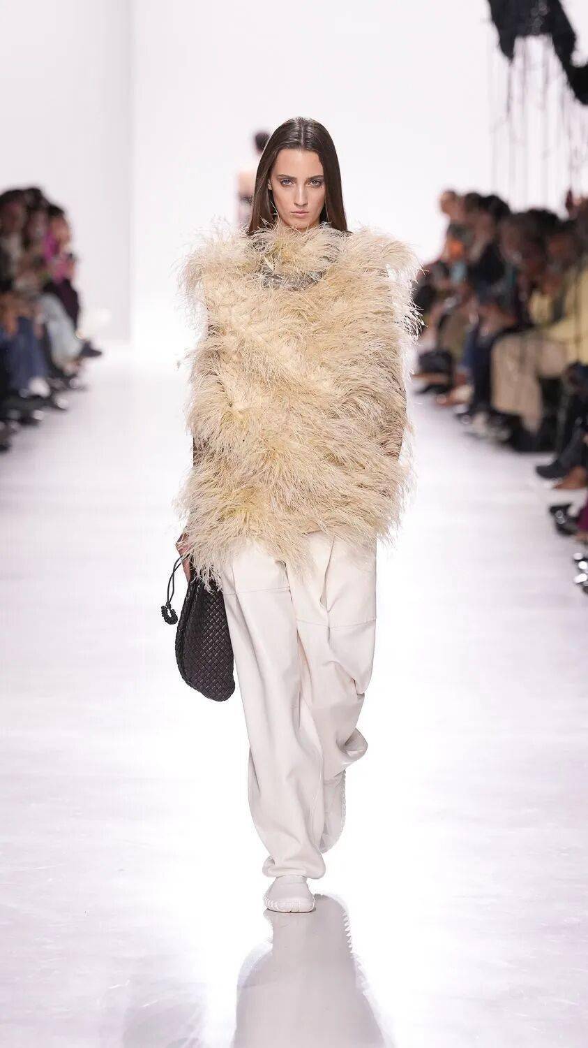 Bottega Veneta本季的工艺还体现在那些略显厚重的流苏连衣裙和羽毛外套等单品设计中