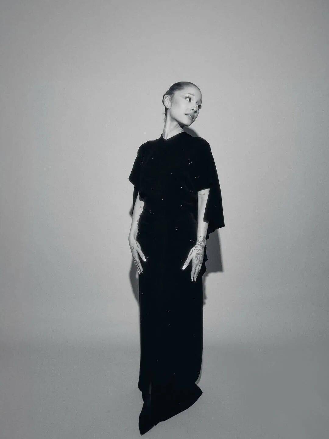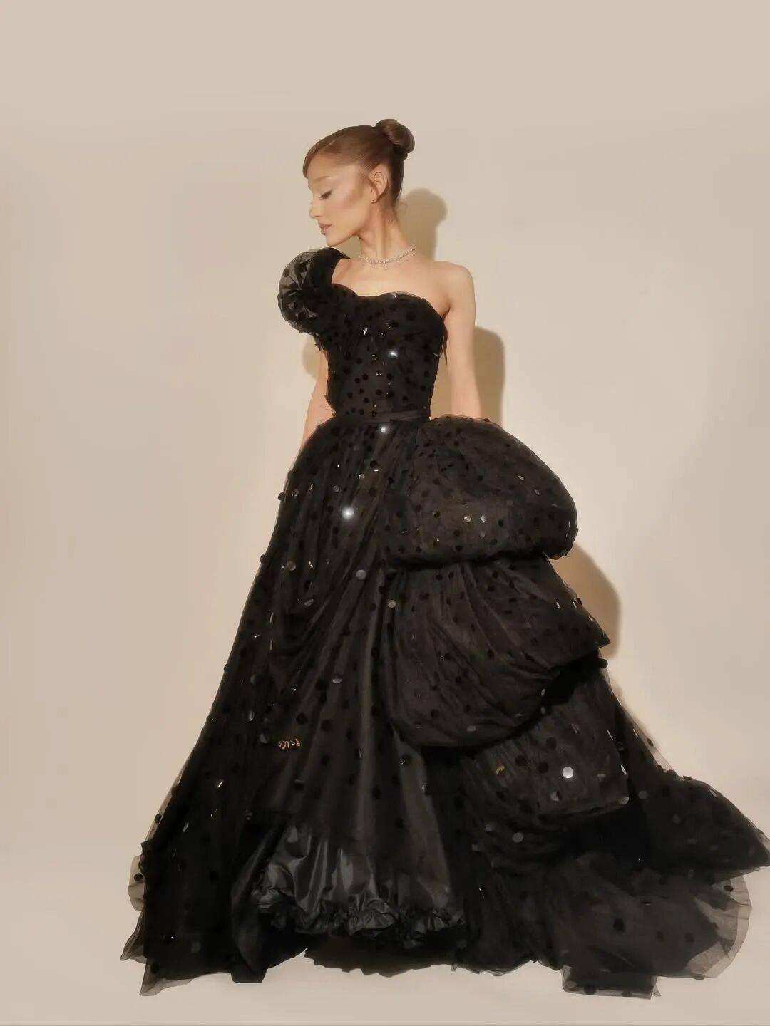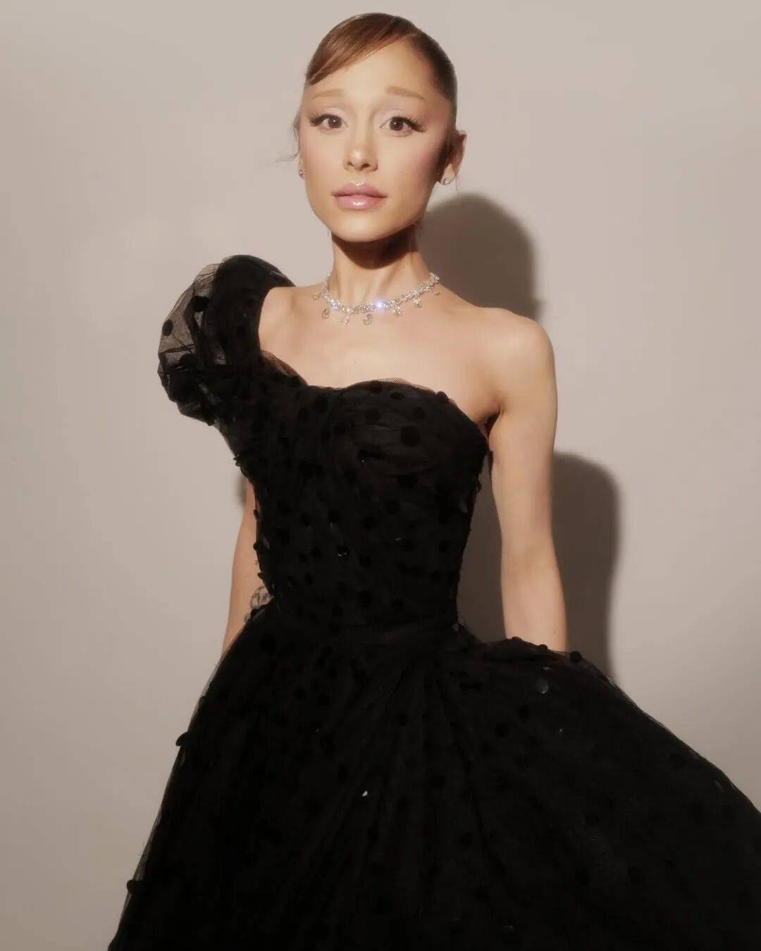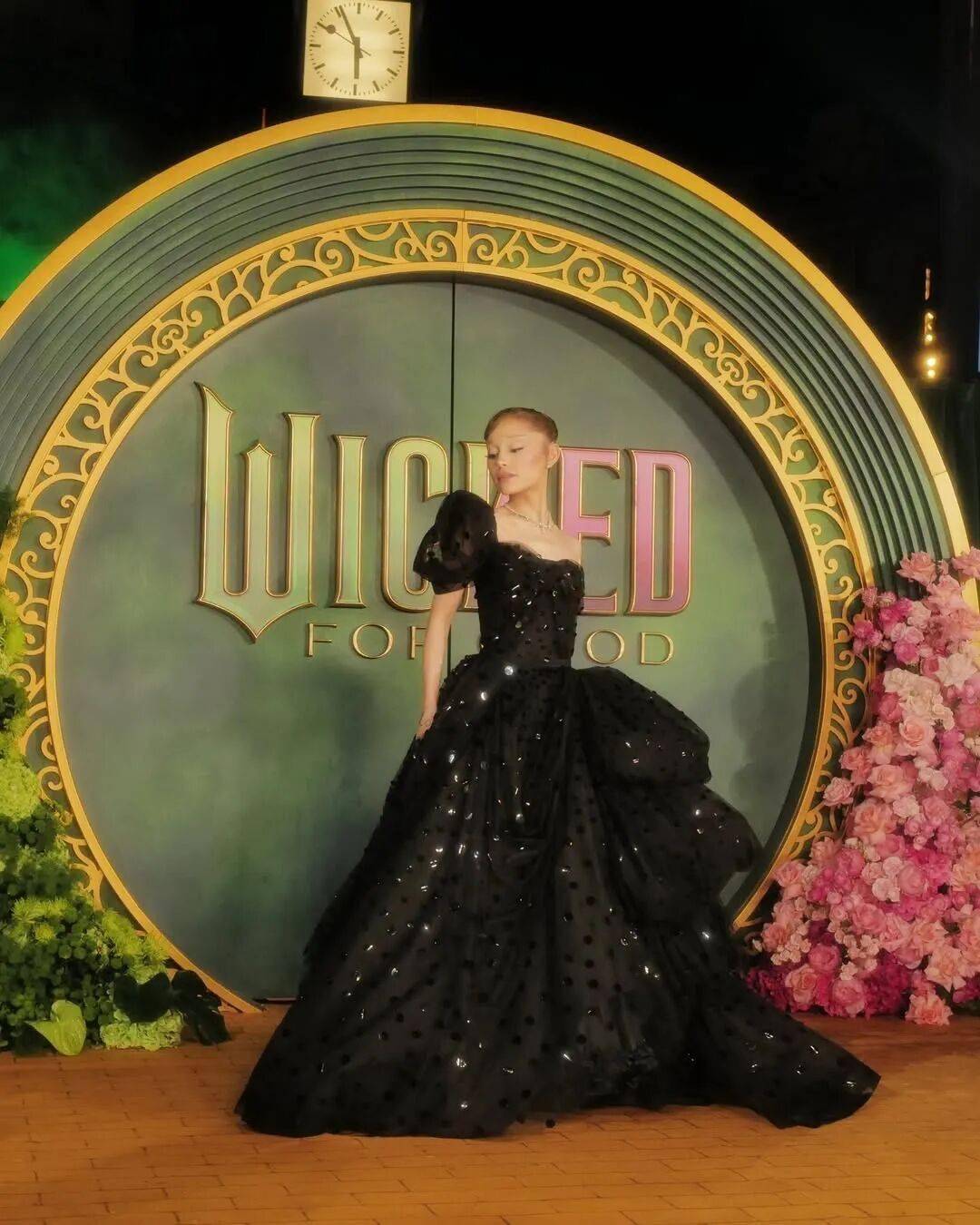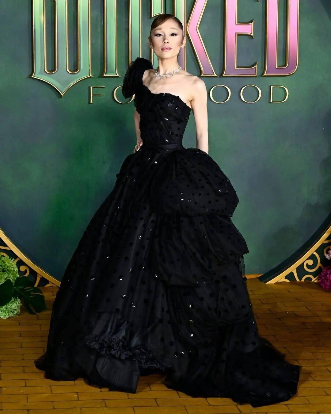 Gilbert Adrian作为电影服装史上的标杆人物,正是《绿野仙踪》(1939年)中Glinda经典粉色礼服、Dorothy格子裙与红宝石拖鞋的创作者, A妹在《魔法坏女巫2》宣传中穿上他的作品,既是对经典的致敬,也是对“女巫宇宙”时尚传承的呼应,让造型与电影的溯源关系形成巧妙闭环。 单肩的设计展现出Ariana优美的肩部线条,裙摆部分则采用了华丽的塔夫绸材质,质感十足。裙身上的手工钉珠排列成精美的图案,在灯光的照耀下闪烁着迷人的光芒。