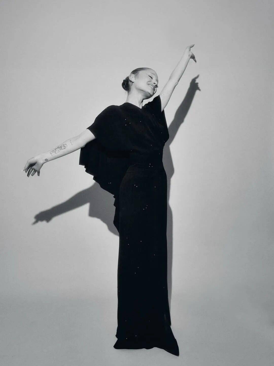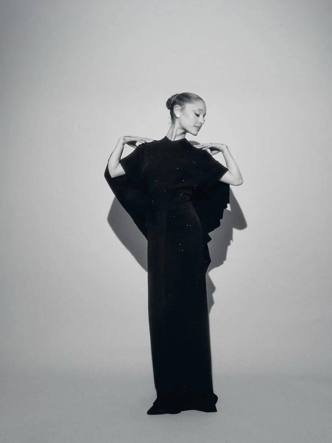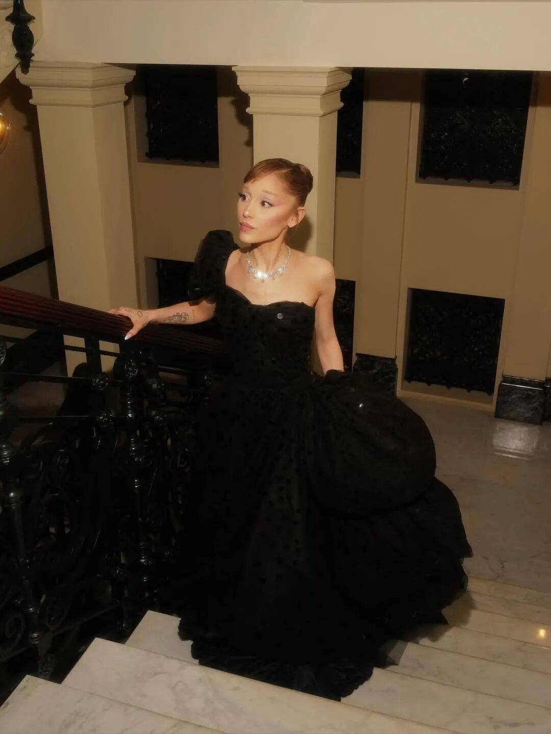Ari还穿上了另一件黑色“Adrian礼服”。Adrian在1928年至1941年担任MGM的首席服装设计师,离开MGM后,继续创办了自己的时装屋,许多作品如今在世界各大博物馆展出,受到时尚爱好者的研究。他对产品线的愿景保留了他广为人知的作品元素,包括大胆的肩部设计、引人注目的轮廓和精湛的剪裁工艺。