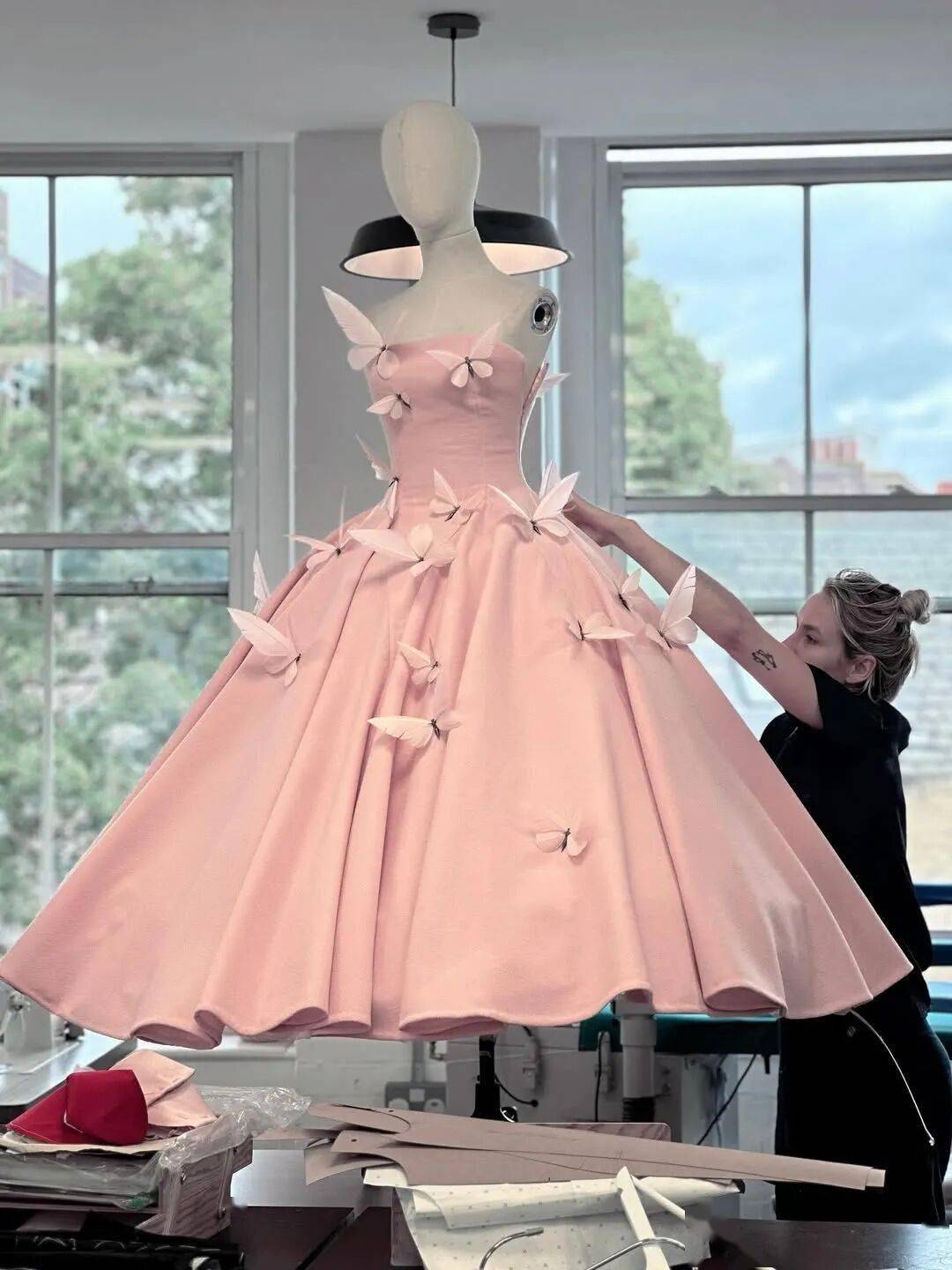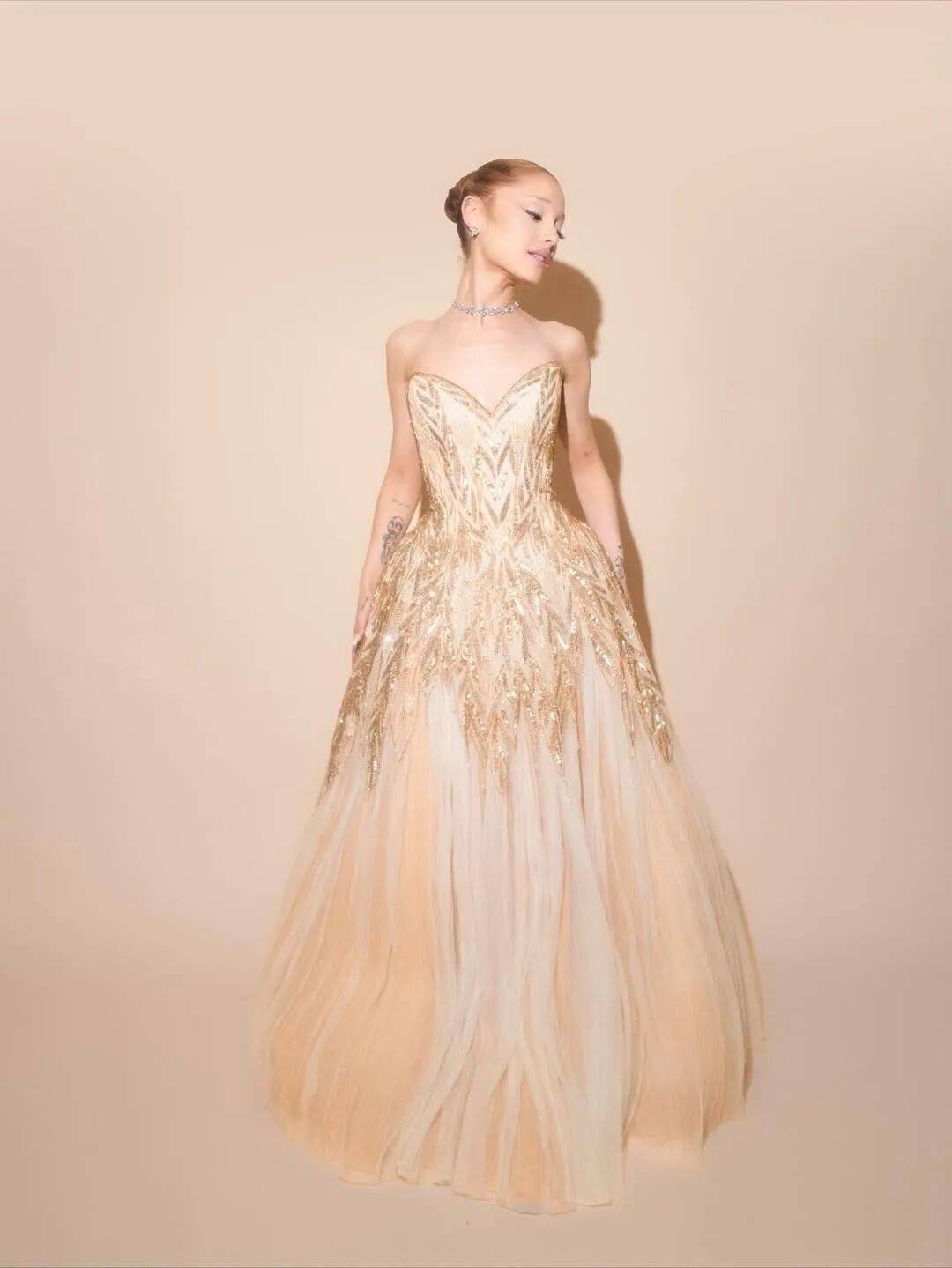 这件柔粉色礼服堪称艺术与时尚的完美结合。从裙身至指尖,皆点缀着展翅欲飞的蝴蝶,这些蝴蝶采用精致的手工刺绣工艺,栩栩如生,仿佛下一秒就会振翅高飞。裙摆部分采用了轻盈的欧根纱材质,随着她的走动,轻轻飘动,如同仙女的裙摆一般。 设计师Robert Wun表示:“这件礼服的设计灵感来源于电影中Glinda的魔法世界,我希望通过蝴蝶的元素,展现出一种梦幻、灵动的感觉。”