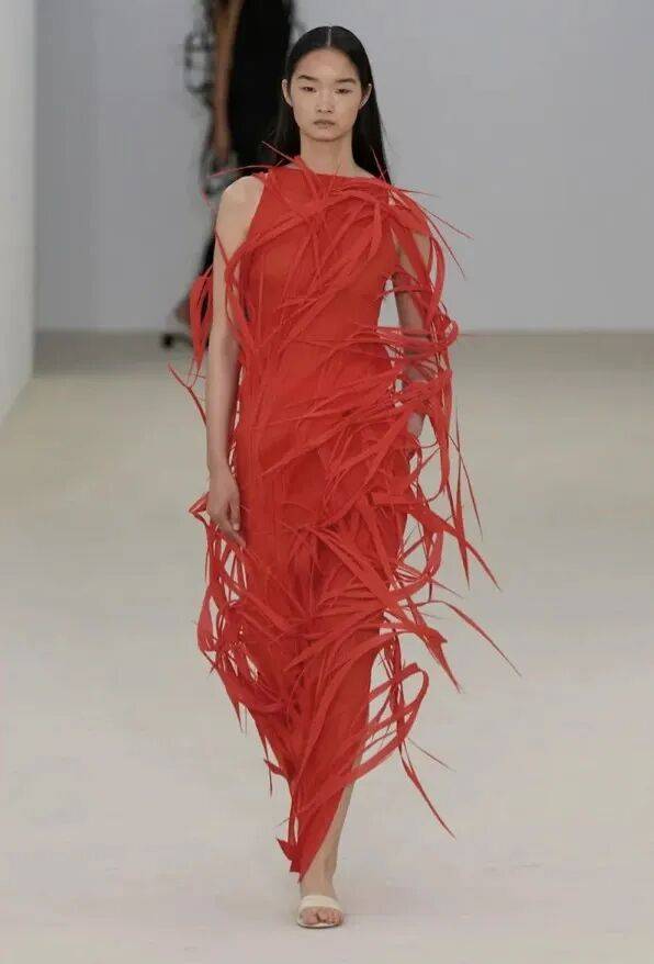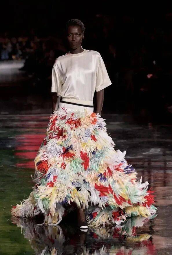 本季,设计师们证明了,绚丽的羽毛无需复杂的造型——只需纯粹的线条和优雅。三宅一生(Issey Miyake) 的羽毛造型宛如花瓣,随着模特的移动而栩栩如生;斯特拉·麦卡特尼(Stella McCartney) 在晚礼服中运用符合伦理道德的“羽毛”,其中一袭精致的淡紫色羽毛尤为引人注目;而香奈儿(Chanel) 的压轴造型更是锦上添花——一件白色真丝T恤搭配一条缀满彩色真丝“羽毛”的长裙,在T台上营造出一种轻盈飘逸、宛如魔法般的效果。