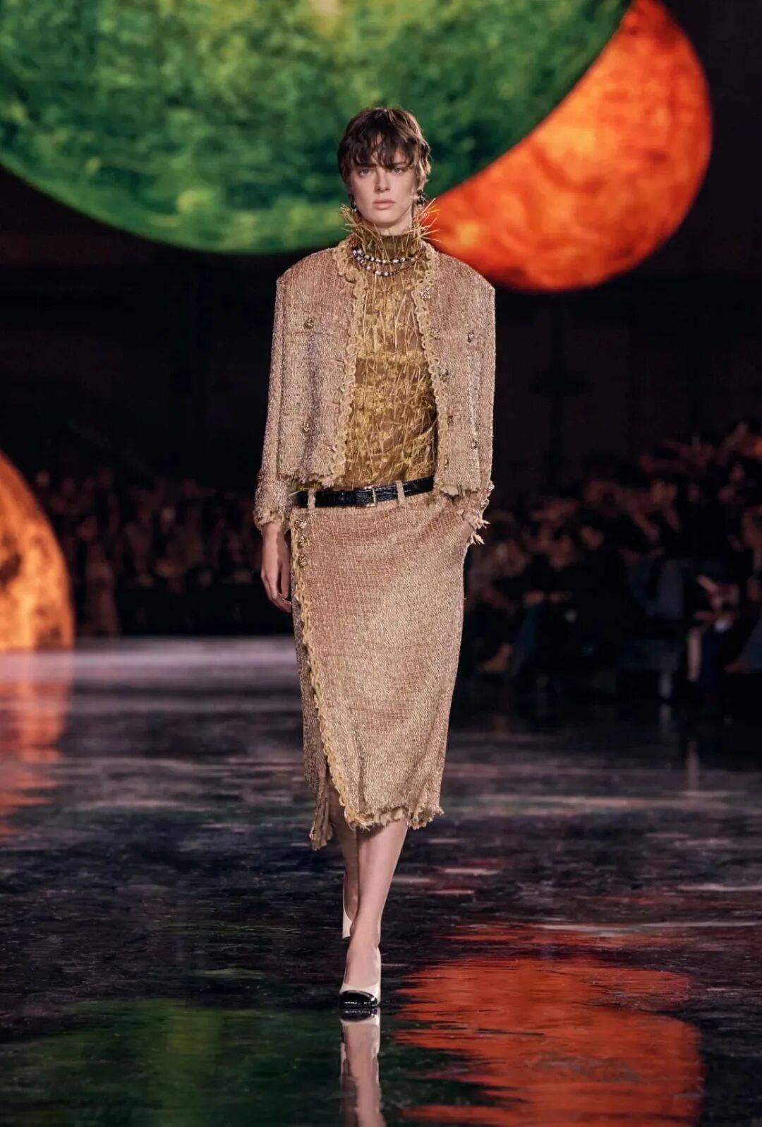 新一季,设计师们增添了一丝魔力——微妙的金色光泽。在夏帕瑞丽(Schiaparelli) 秀场,模特们身着宛如雕塑的全金连衣裙,熠熠生辉;最令人惊艳的造型则仿佛由撕碎的纸片制成,透过纸片,银色光彩熠熠。加布里埃拉·赫斯特(Gabriela Hearst) 将艺术与天文学巧妙融合——星空图案、深蓝色的天空和金色漆皮服饰;而香奈儿(Chanel) 在马修·布拉西(Mathieu Blasi) 的领导下,则为品牌开启了新纪元——经典粗花呢、太空配饰以及精湛的工艺。