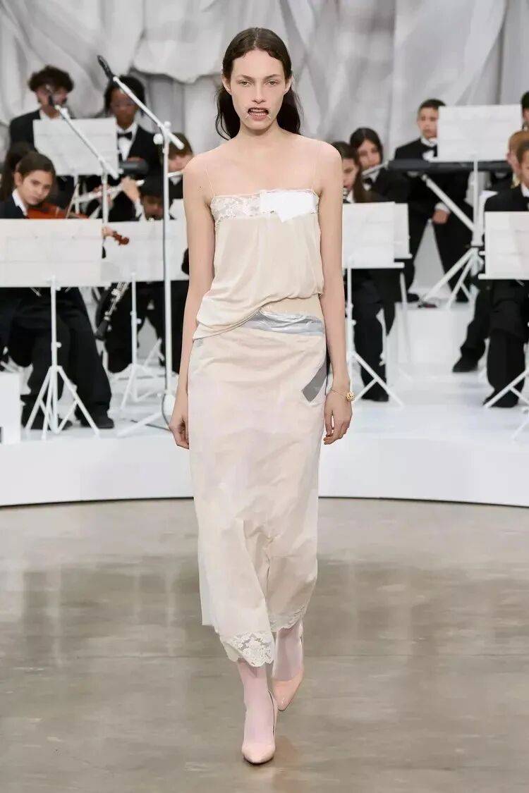 从路易威登2026春夏“居家”系列开始,巴黎T台上便充满了睡袍和精致的混搭连衣裙。这些轻盈的“居家”造型,或薄纱或丝绸,点缀着精致的蕾丝细节,颂扬着独处之乐的美感。