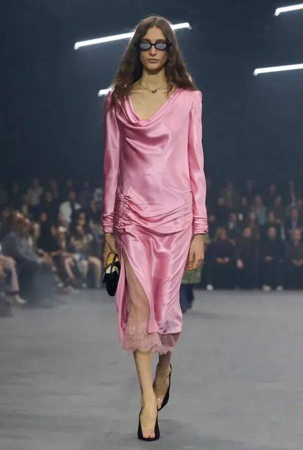 巴黎最引人注目的色彩之一是柔粉色——它柔化了系列的色调,增添了女性气质和沉稳的气质。在路易威登,它成为了主旋律,为蓬松的半身裙、裤裙、天鹅绒印花真丝连衣裙以及饰有装饰性领带的人造皮草背心增添了色彩。斯特拉·麦卡特尼(Stella McCartney)也将柔粉色运用在纹理面料上——从厚重的环保皮草大衣到饰有皮草嵌片和褶边的迷你连衣裙。汤姆·福特(Tom Ford)则以柔和的淡粉色呈现了西装。