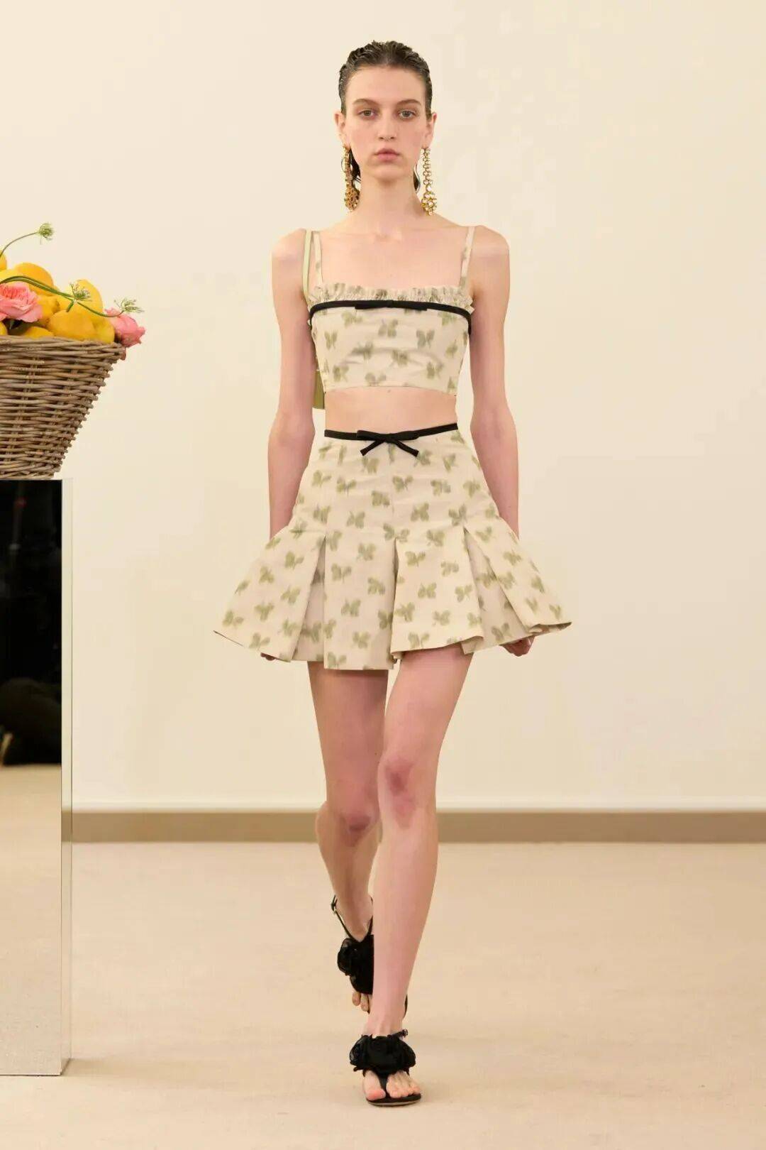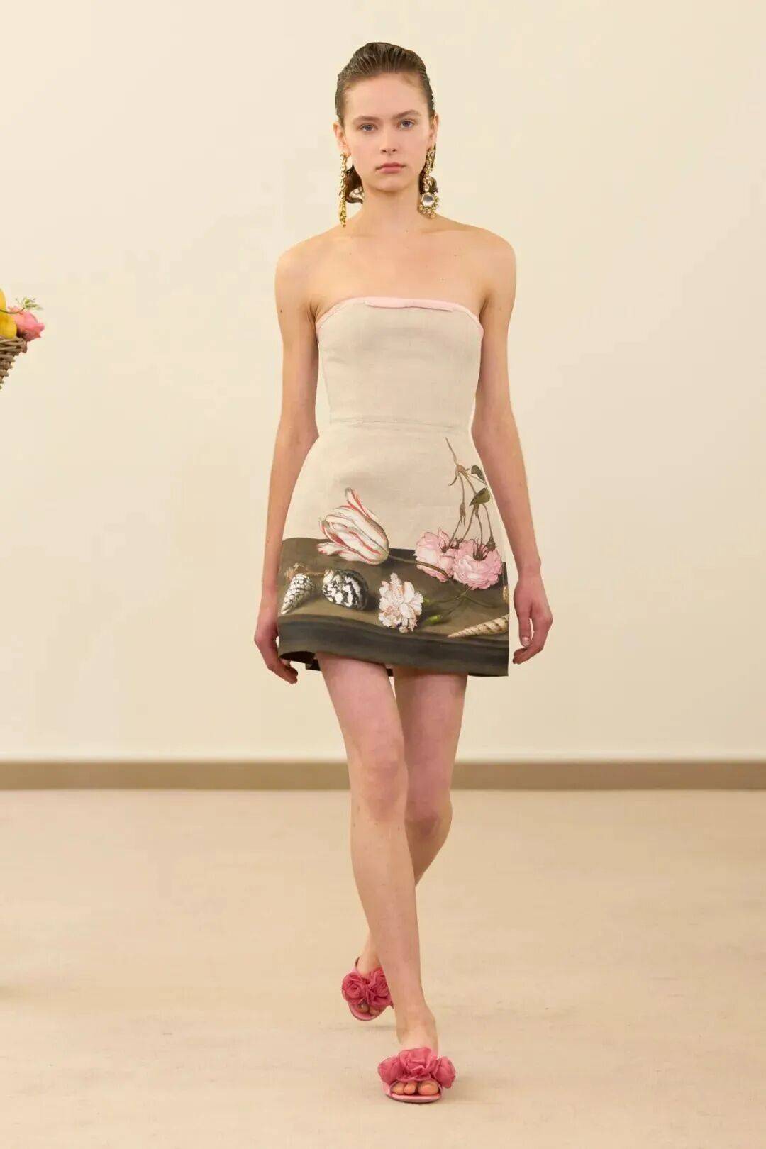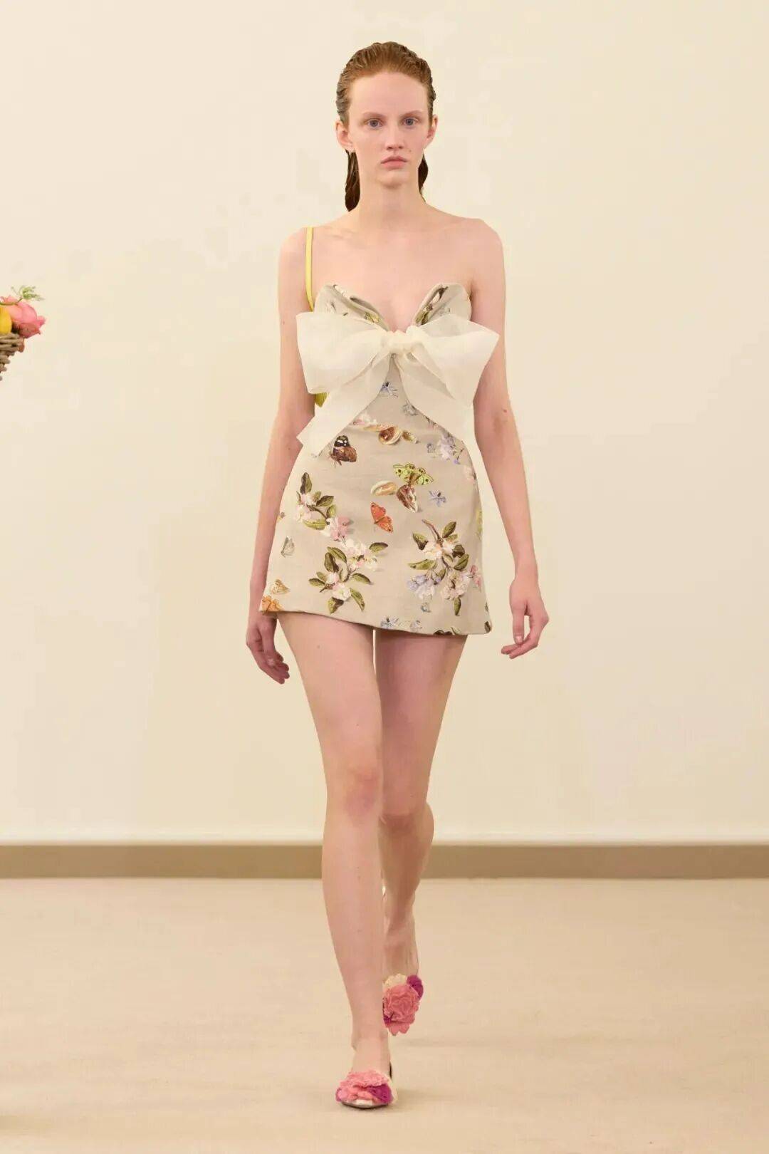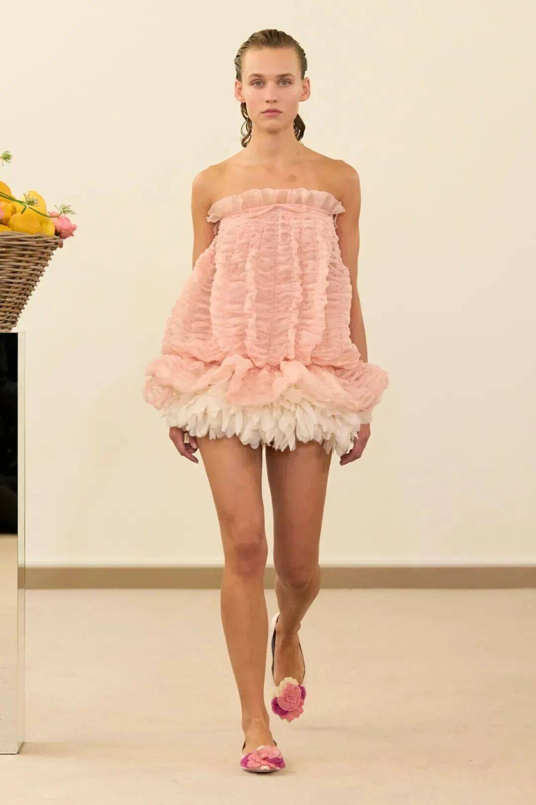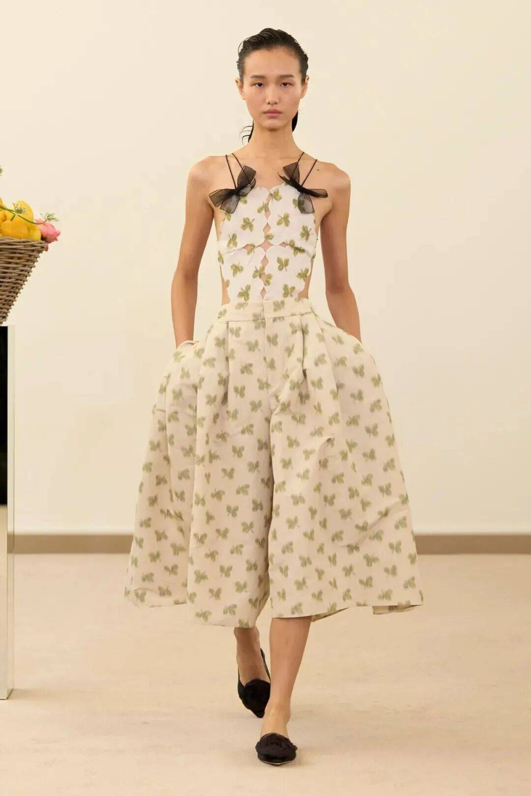 在整个系列中,瓦利对大自然的热爱达到了极致。手工绘制的花朵在一件围裙式连衣裙上被放大呈现,而粉色的绣花花蕾则在一件镂空的柱状连衣裙上以类似蔓藤编织的网状图案呈现。包包的形状则像是光滑的苹果和梨。