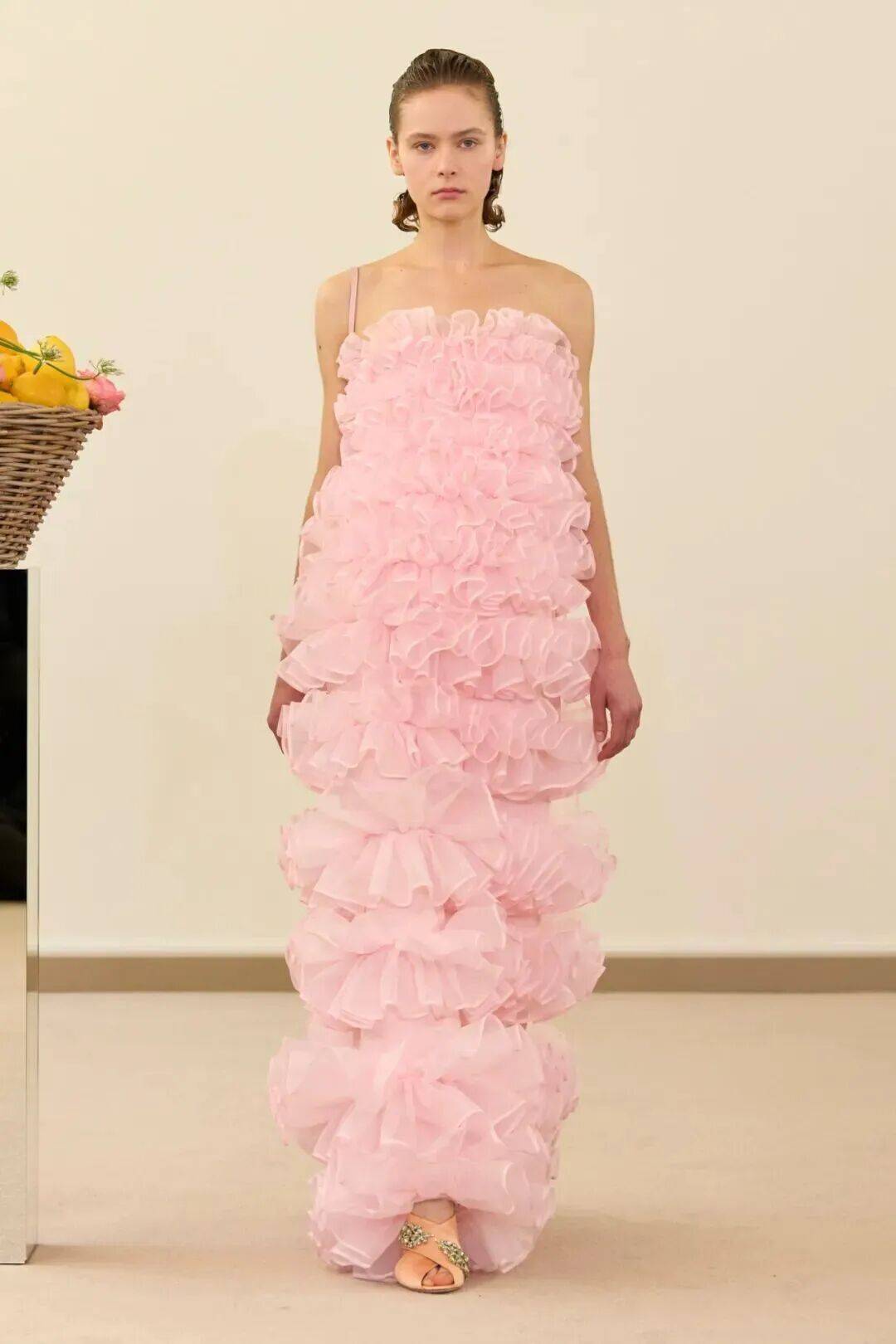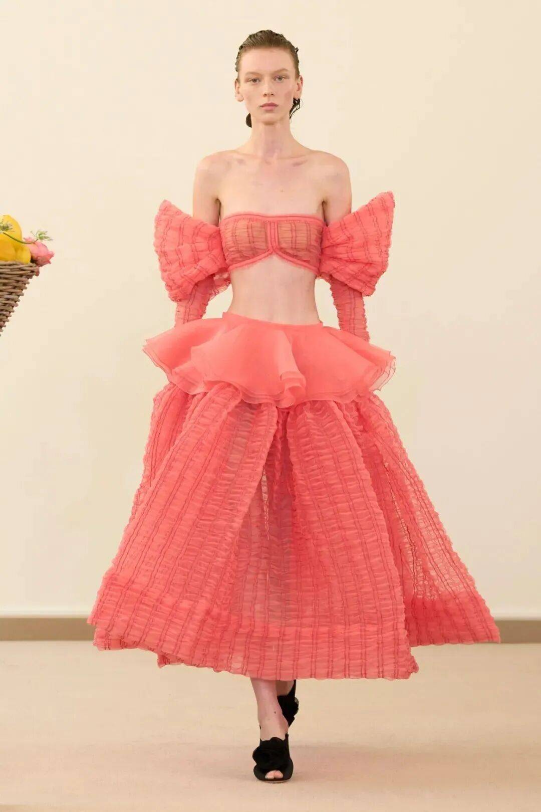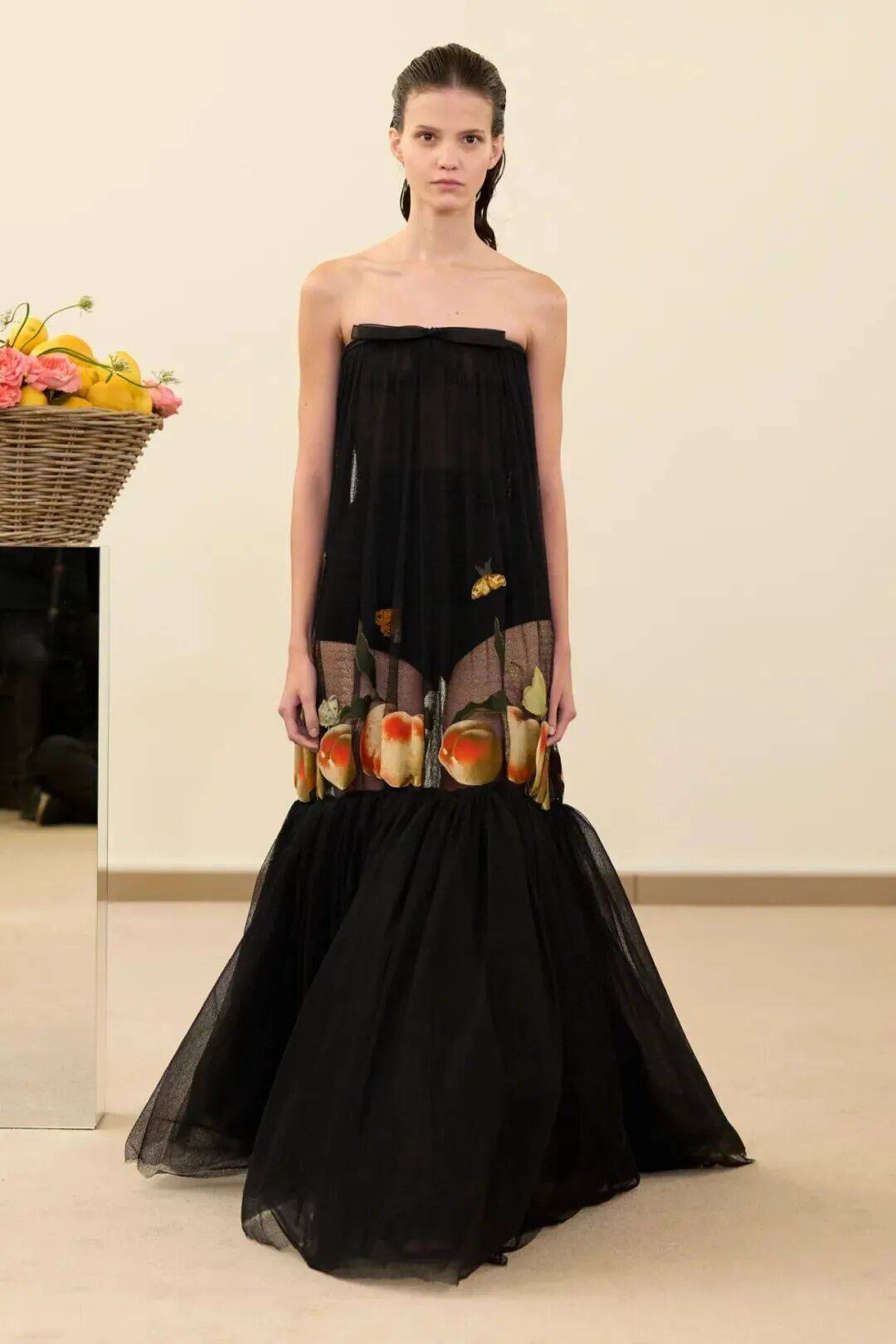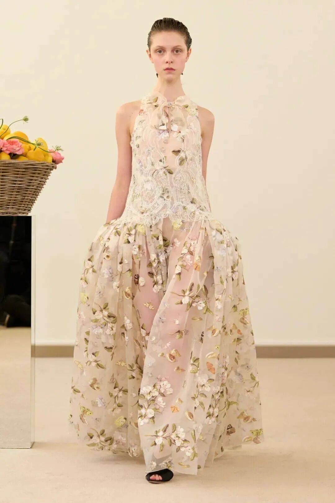 包括凯西·希尔顿及其女儿妮基·希尔顿·罗思柴尔德在内的宾客们齐聚在瓦利在巴黎的总部。那里摆放着带有镜子装饰的基座,上面放着装满鲜花和新鲜水果的篮子。这位设计师的开场设计同样朴实无华:有的是用厚重的亚麻布或精致的网眼蕾丝制成的,有些上面印有静物画的复制品,而另一些则绣有麦穗图案的破碎镜子。