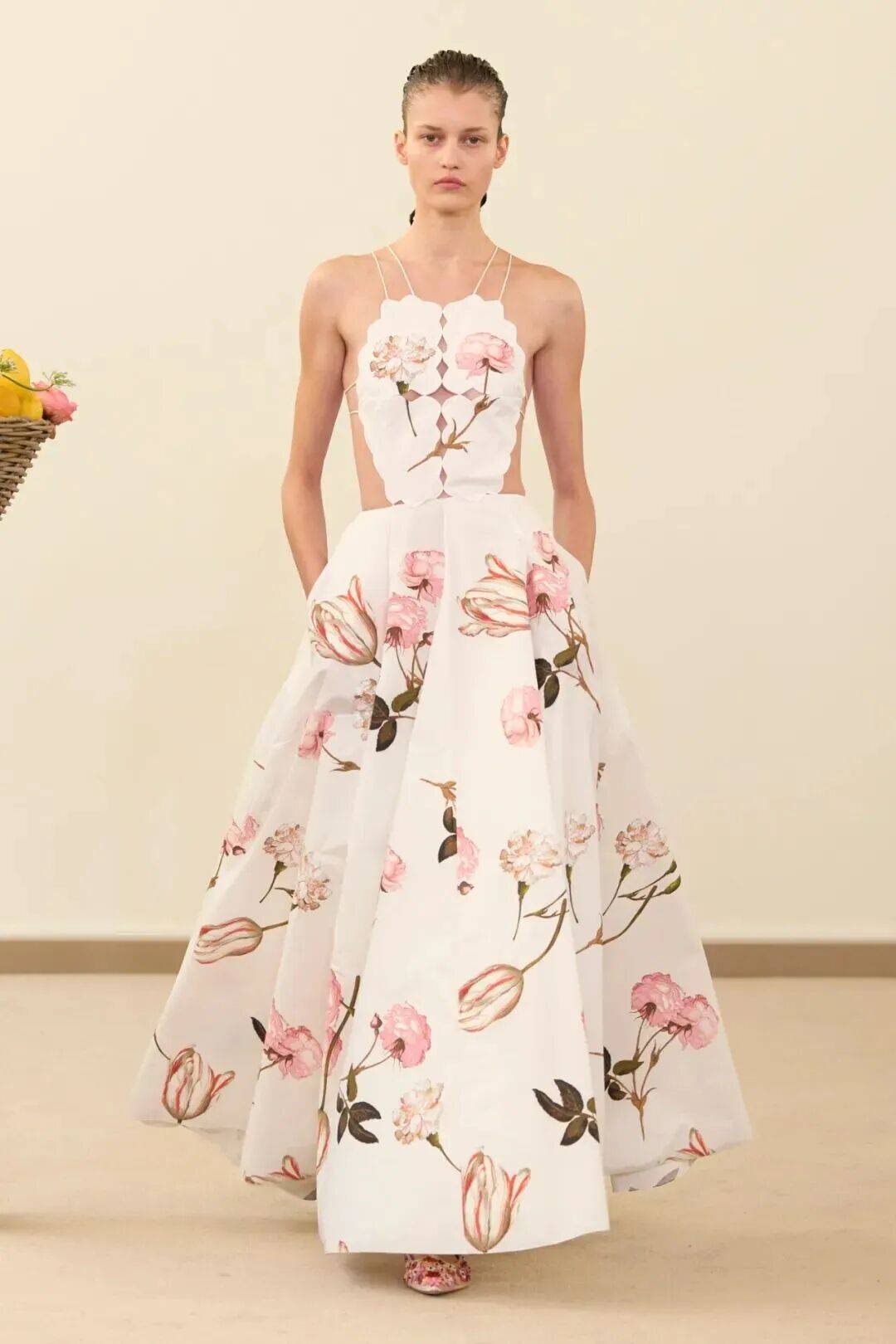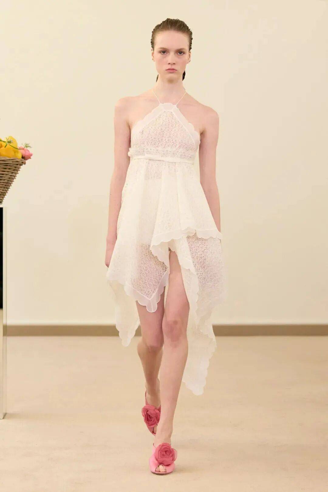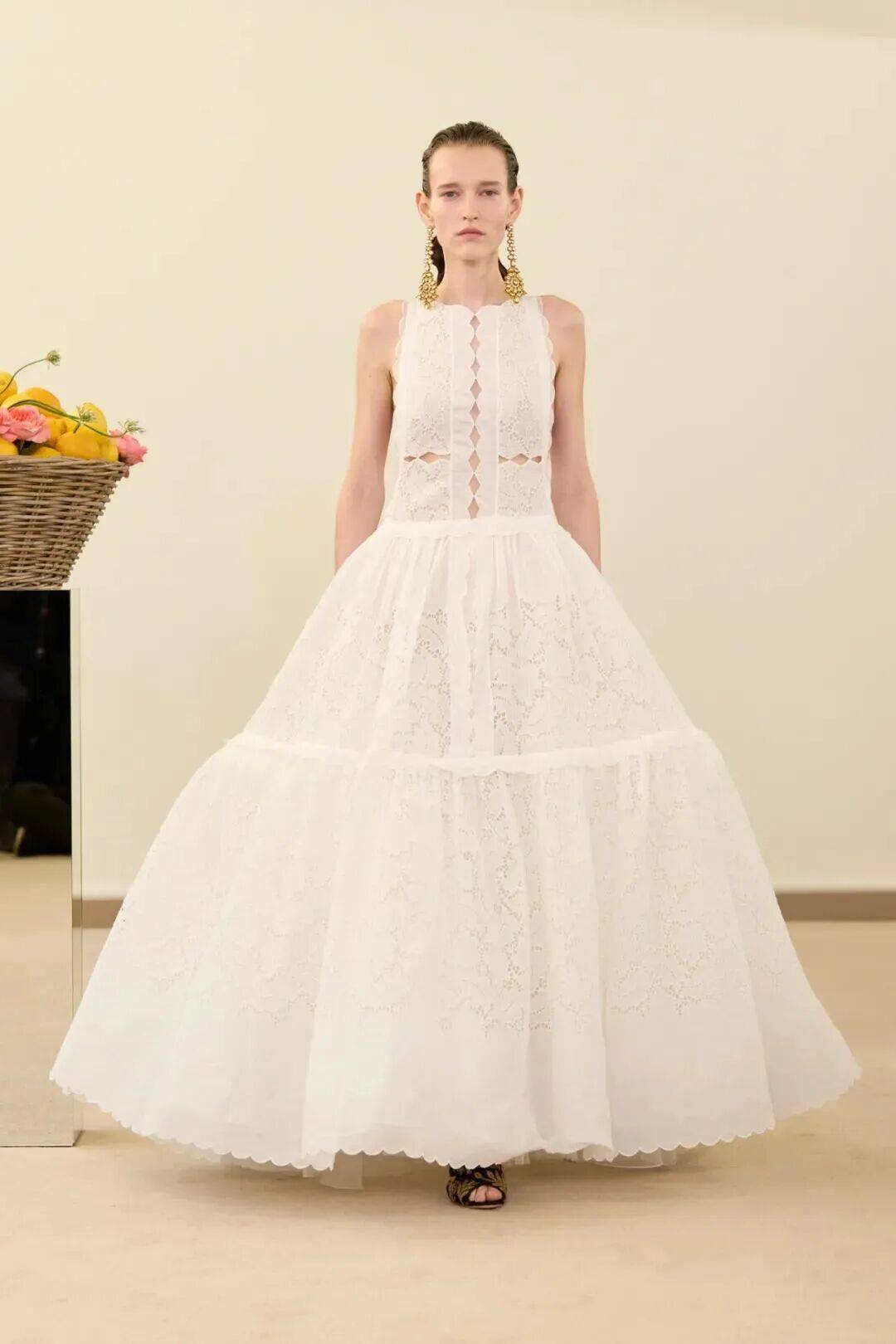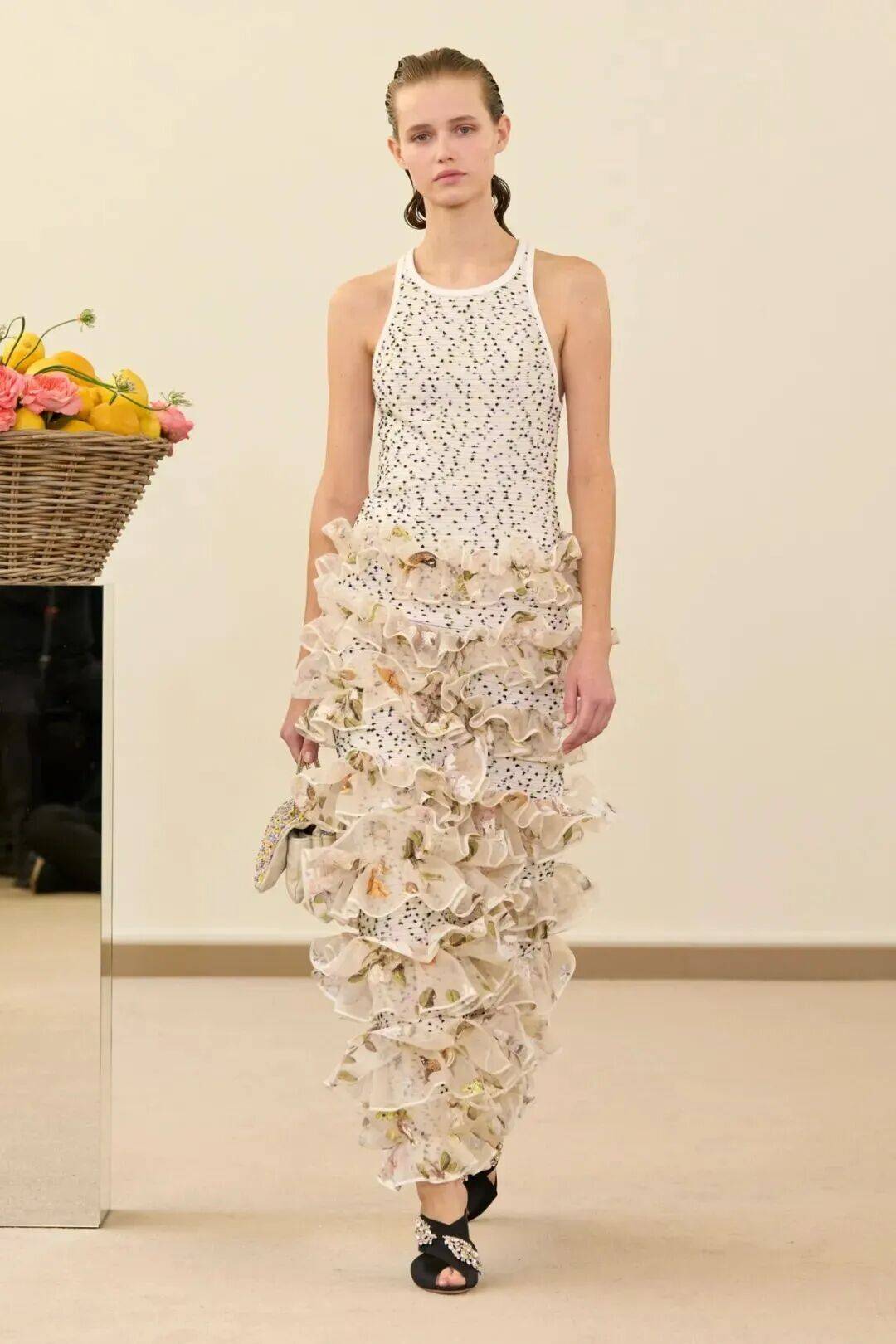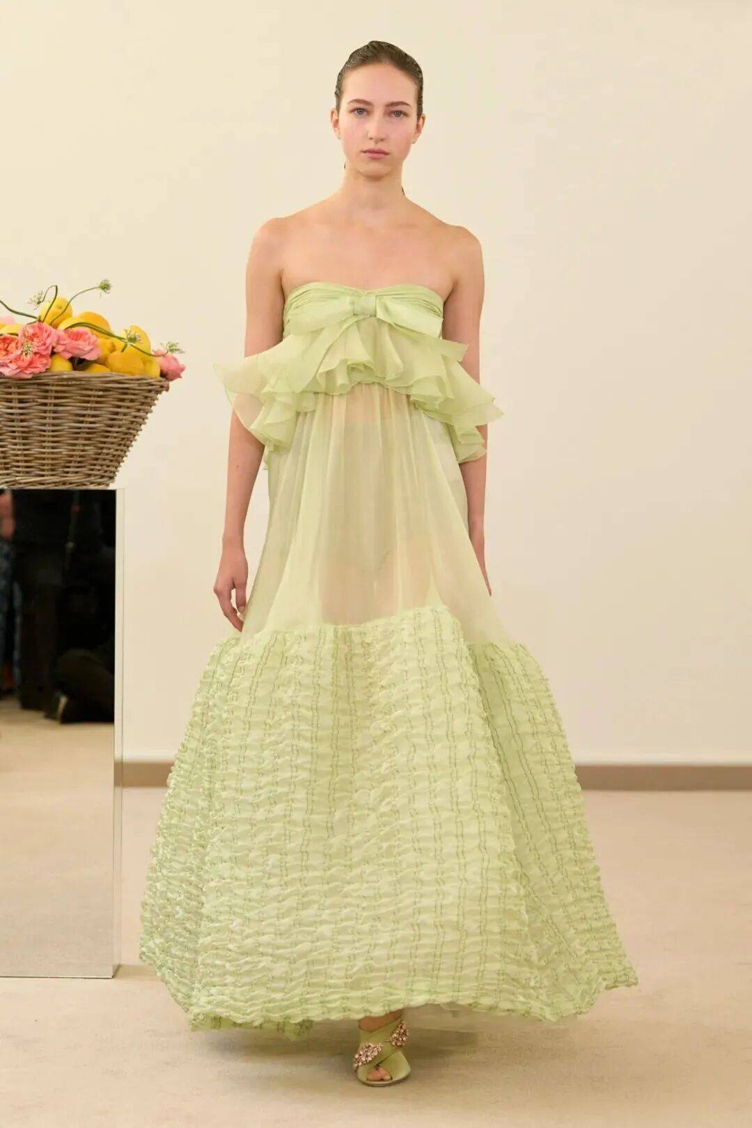 包括凯西·希尔顿及其女儿妮基·希尔顿·罗思柴尔德在内的宾客们齐聚在瓦利在巴黎的总部。那里摆放着带有镜子装饰的基座,上面放着装满鲜花和新鲜水果的篮子。这位设计师的开场设计同样朴实无华:有的是用厚重的亚麻布或精致的网眼蕾丝制成的,有些上面印有静物画的复制品,而另一些则绣有麦穗图案的破碎镜子。