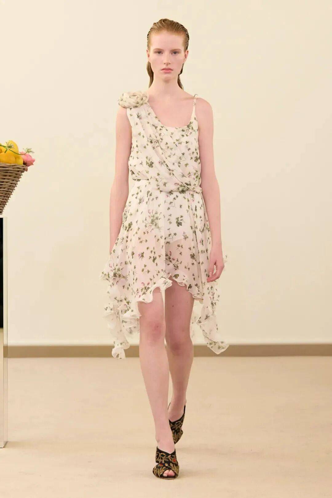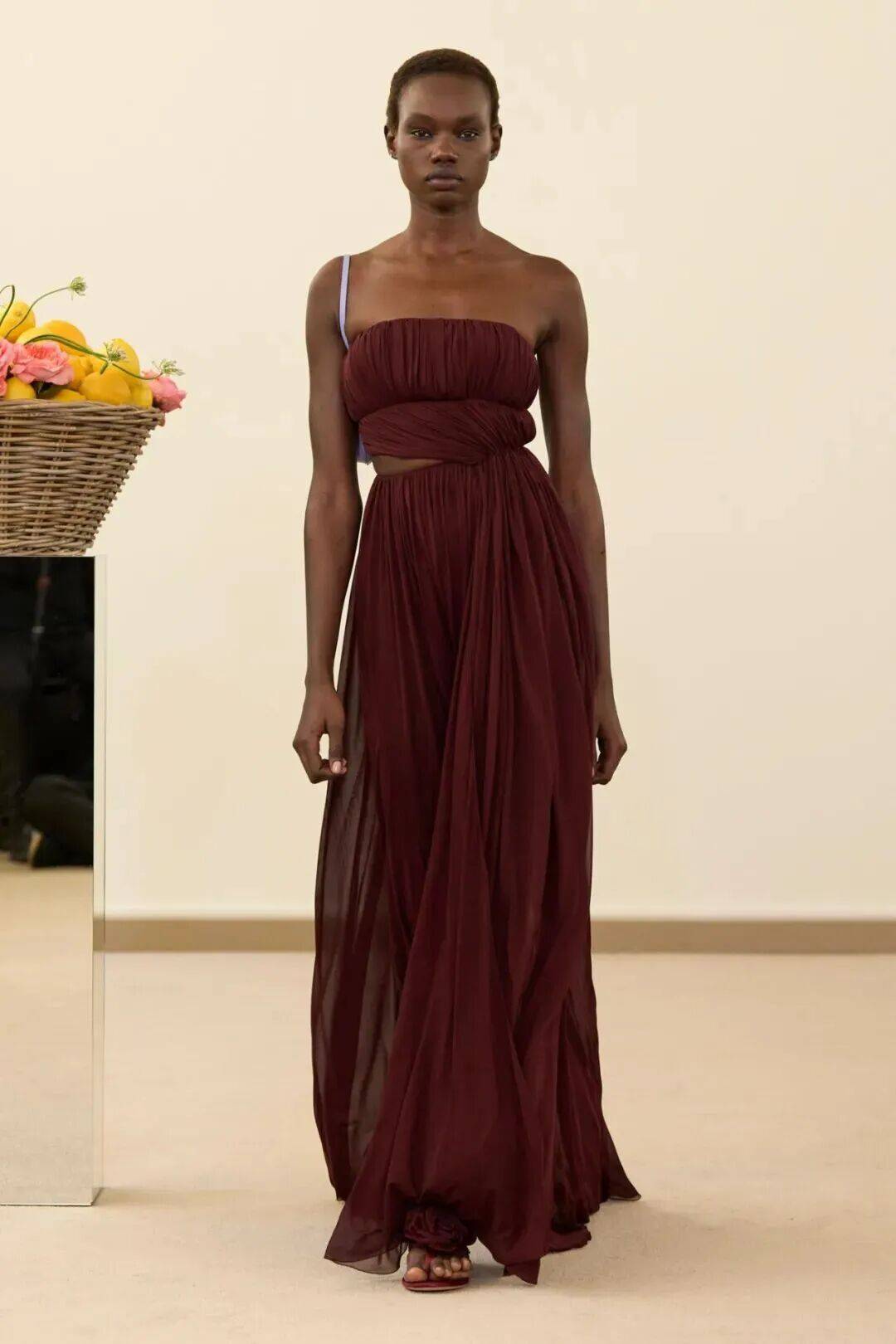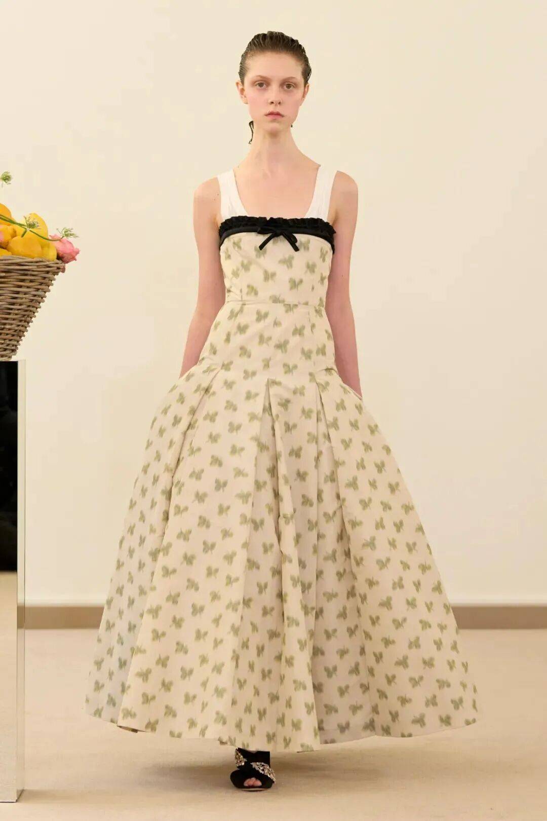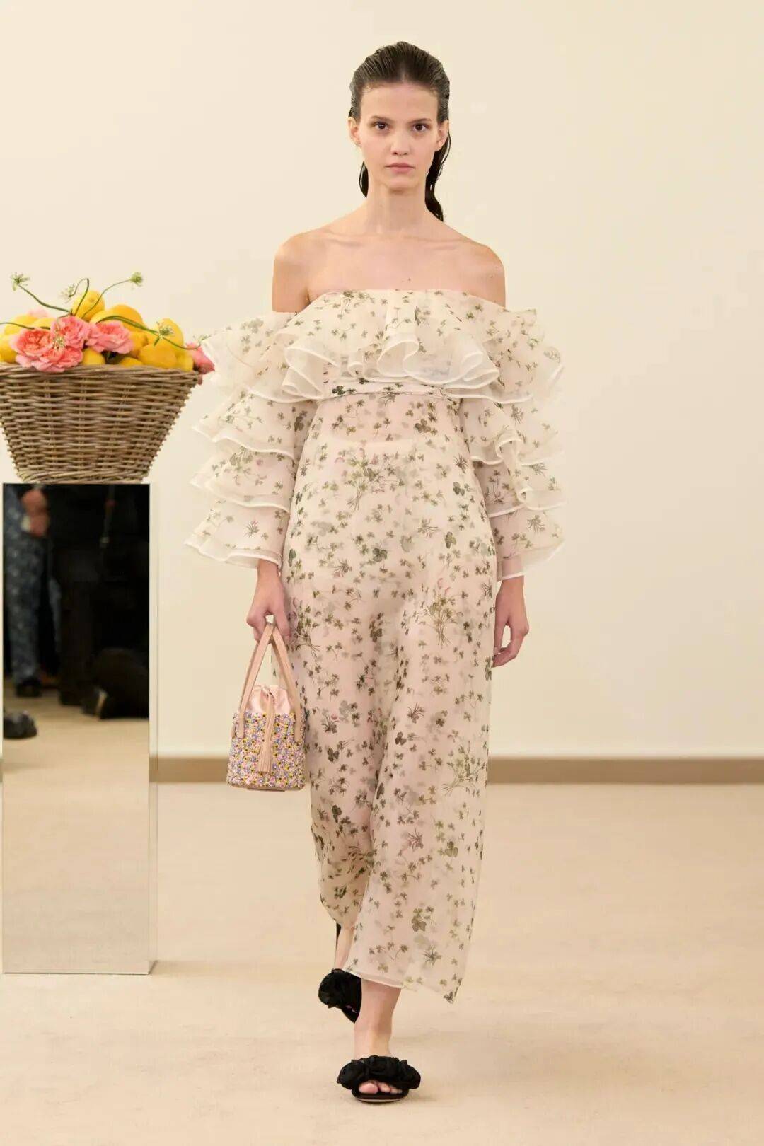 包括凯西·希尔顿及其女儿妮基·希尔顿·罗思柴尔德在内的宾客们齐聚在瓦利在巴黎的总部。那里摆放着带有镜子装饰的基座,上面放着装满鲜花和新鲜水果的篮子。这位设计师的开场设计同样朴实无华:有的是用厚重的亚麻布或精致的网眼蕾丝制成的,有些上面印有静物画的复制品,而另一些则绣有麦穗图案的破碎镜子。