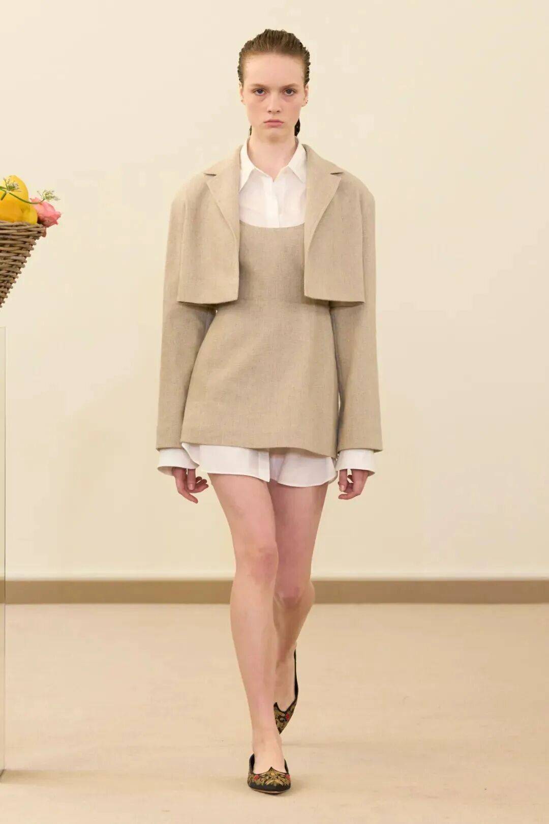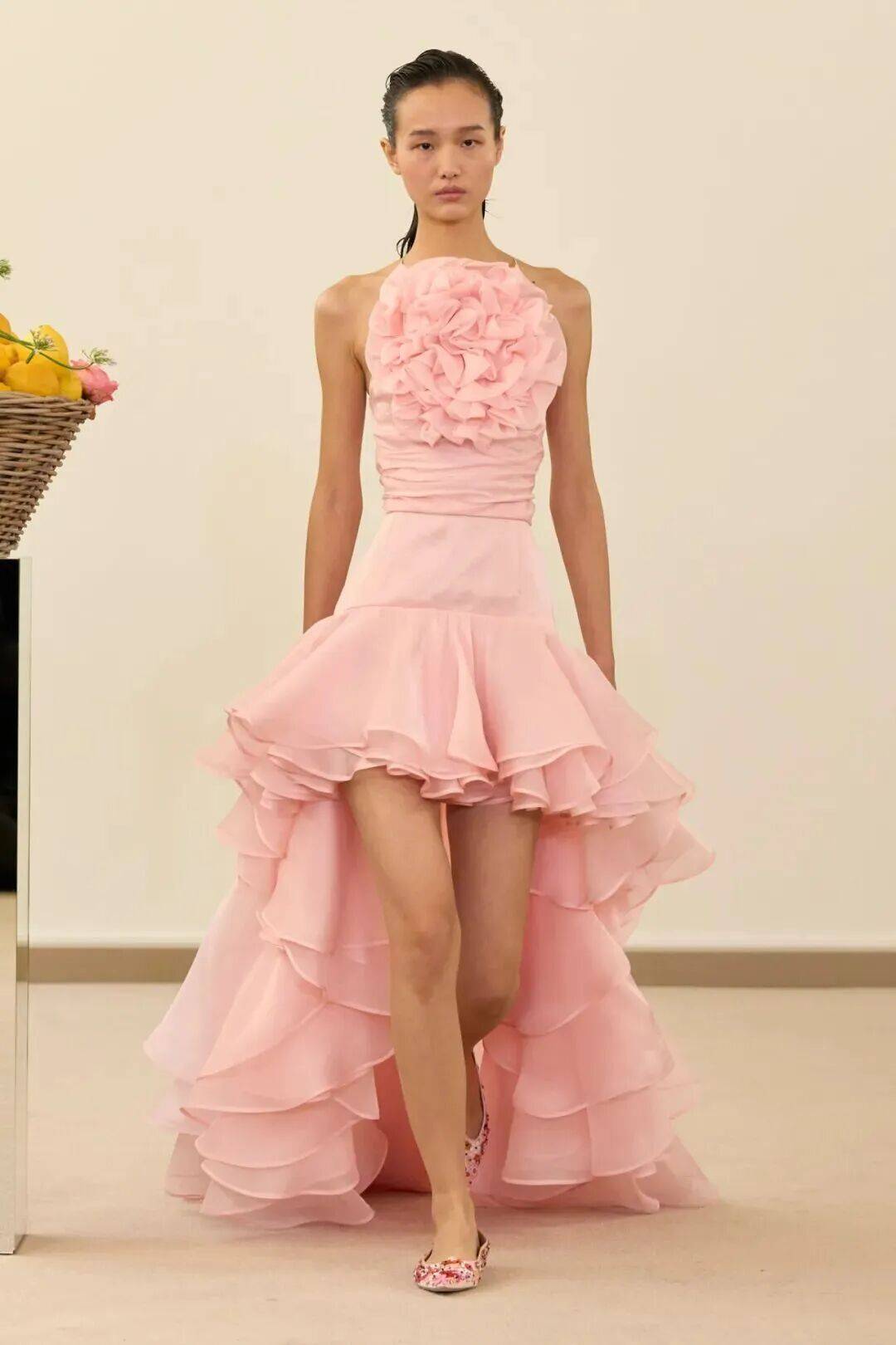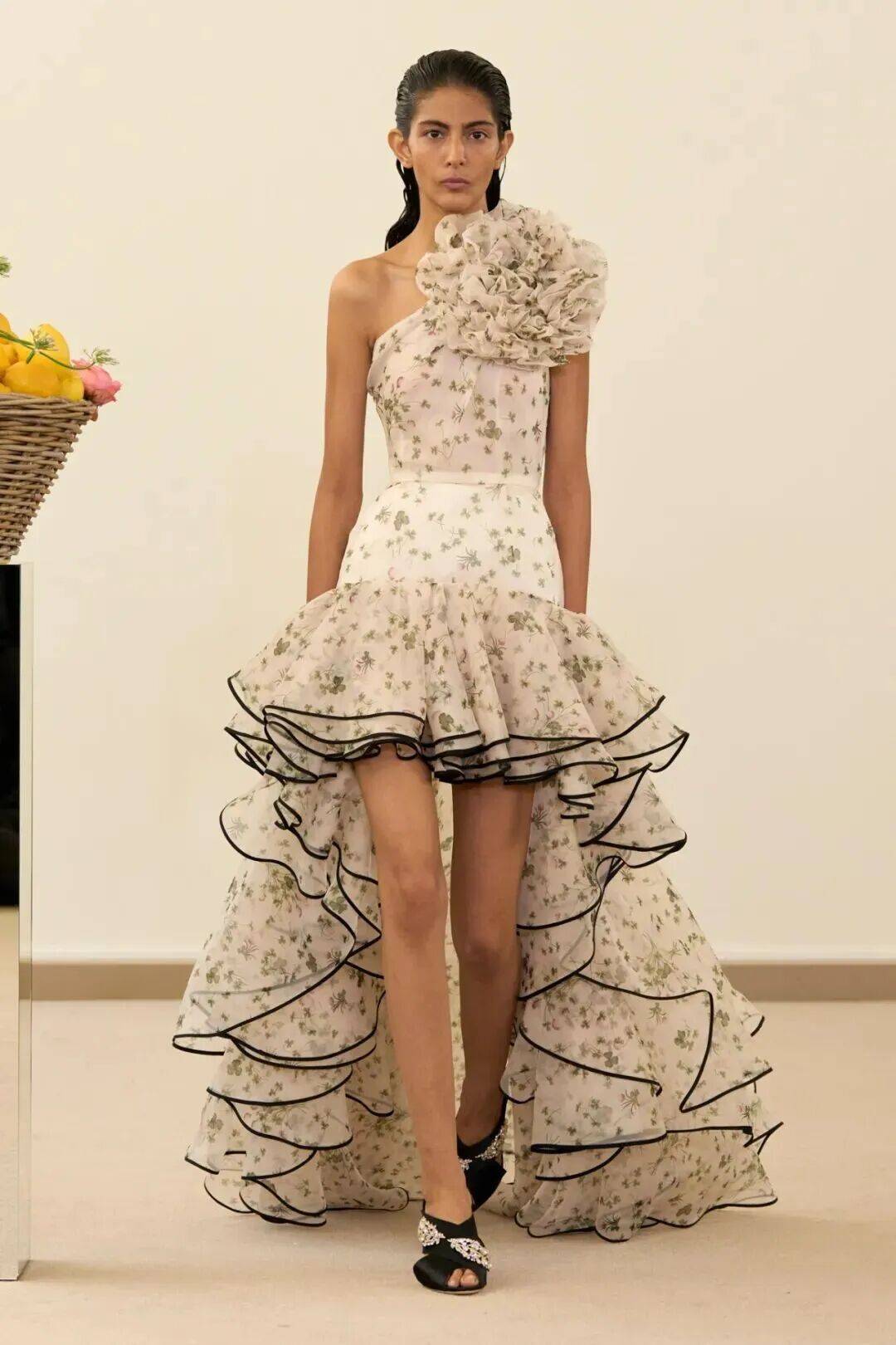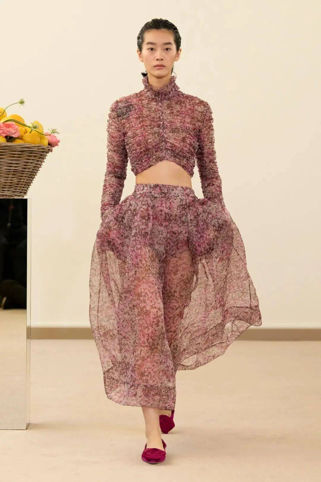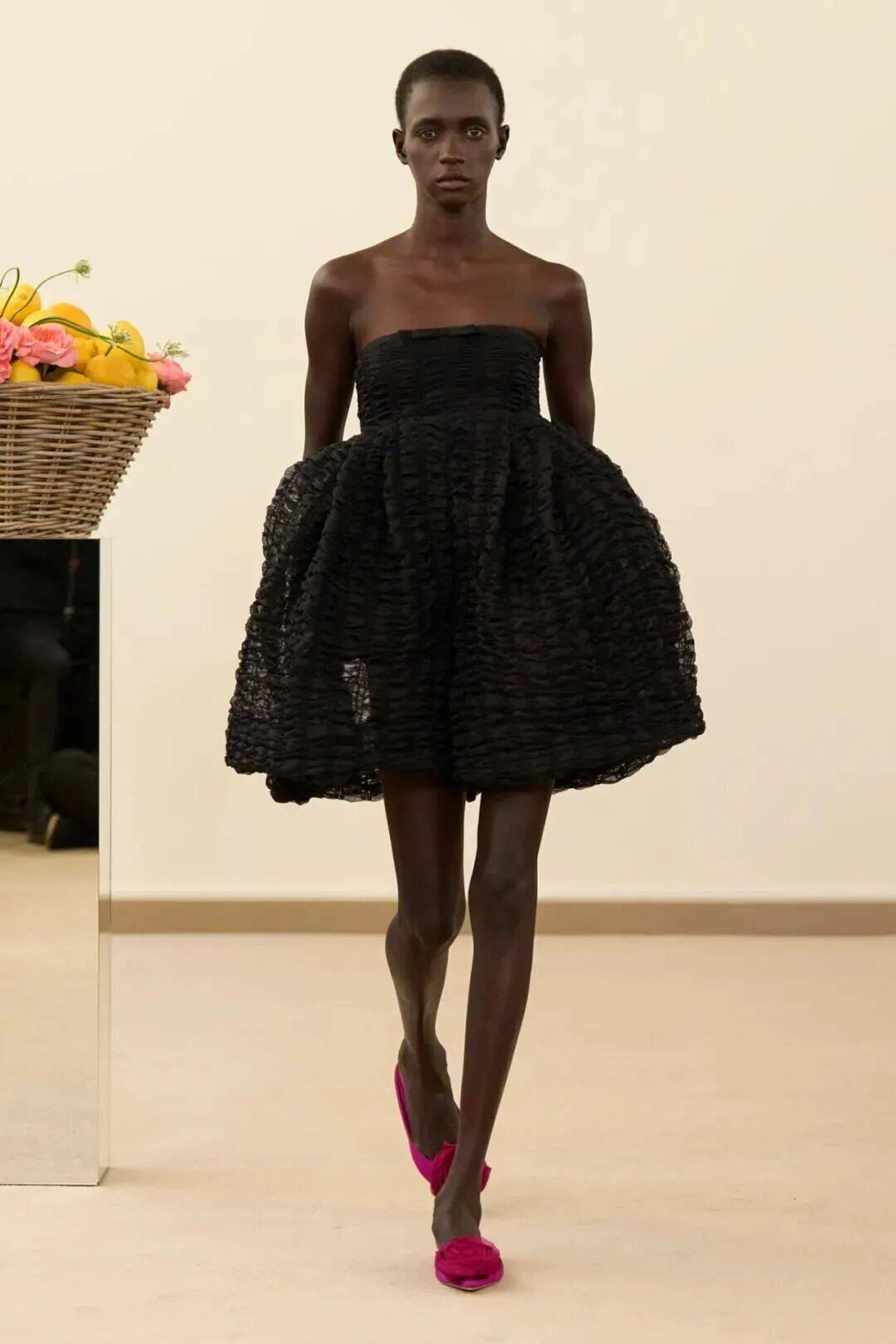 包括凯西·希尔顿及其女儿妮基·希尔顿·罗思柴尔德在内的宾客们齐聚在瓦利在巴黎的总部。那里摆放着带有镜子装饰的基座,上面放着装满鲜花和新鲜水果的篮子。这位设计师的开场设计同样朴实无华:有的是用厚重的亚麻布或精致的网眼蕾丝制成的,有些上面印有静物画的复制品,而另一些则绣有麦穗图案的破碎镜子。