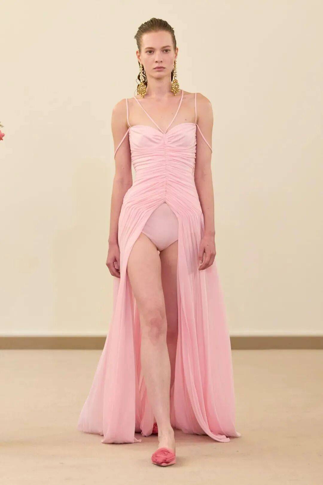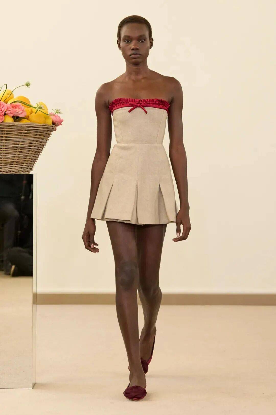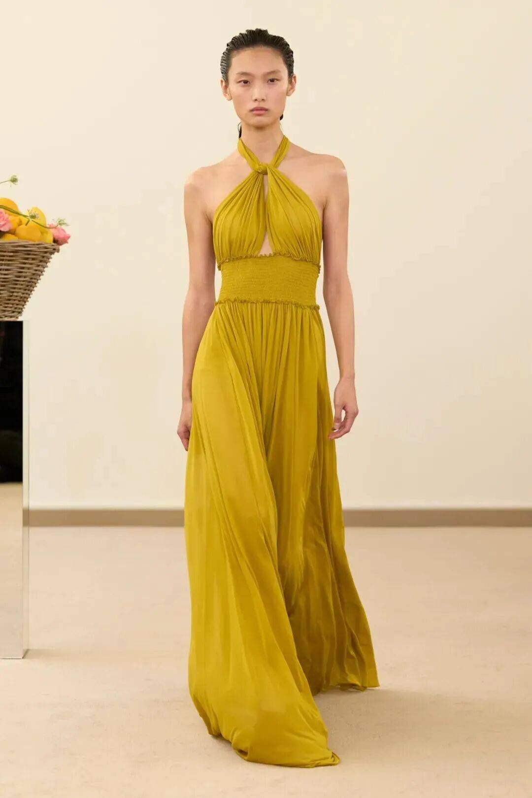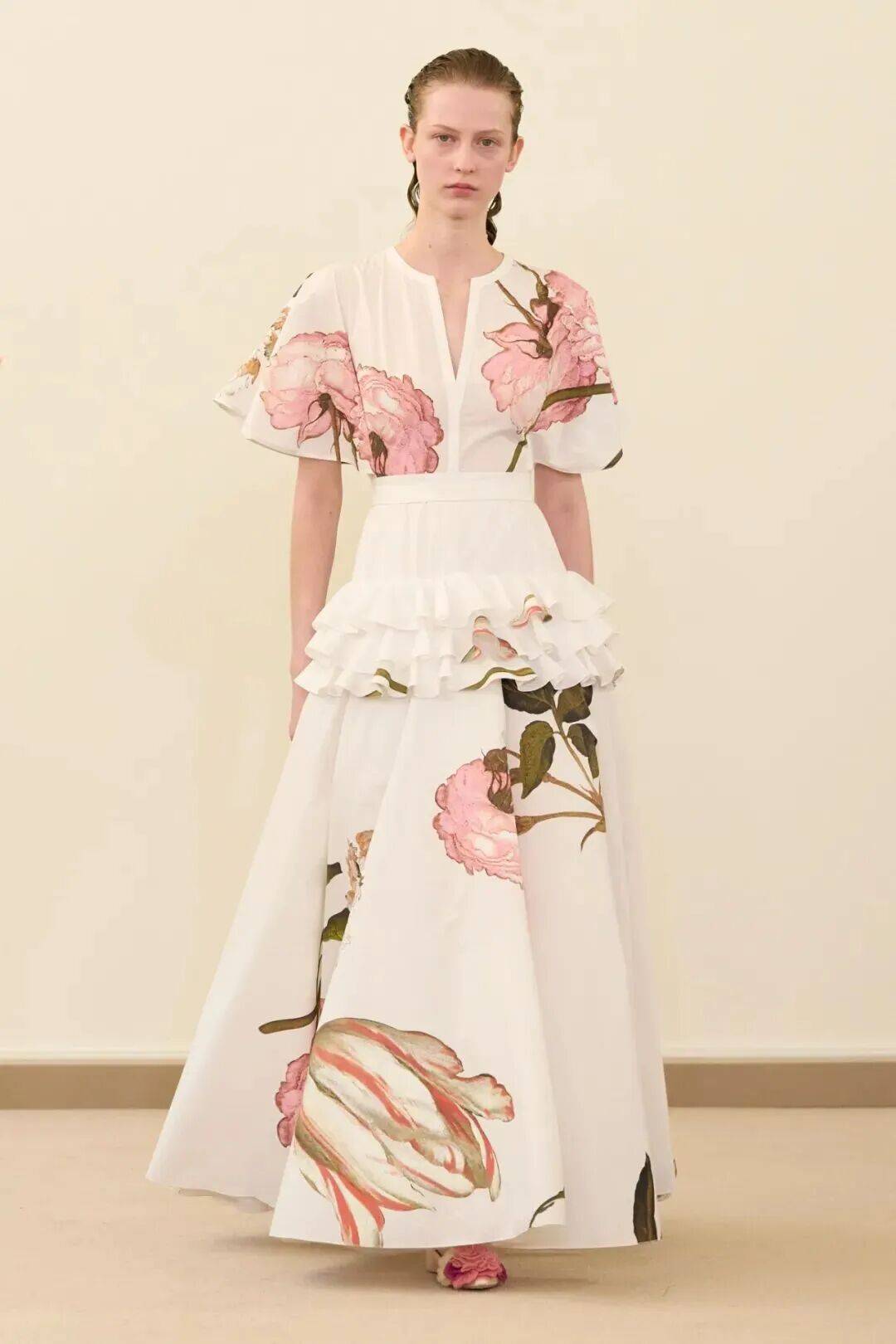包括凯西·希尔顿及其女儿妮基·希尔顿·罗思柴尔德在内的宾客们齐聚在瓦利在巴黎的总部。那里摆放着带有镜子装饰的基座,上面放着装满鲜花和新鲜水果的篮子。这位设计师的开场设计同样朴实无华:有的是用厚重的亚麻布或精致的网眼蕾丝制成的,有些上面印有静物画的复制品,而另一些则绣有麦穗图案的破碎镜子。