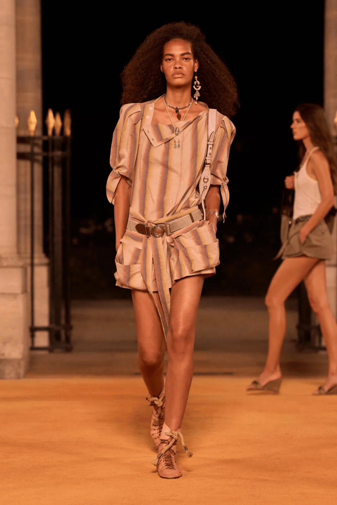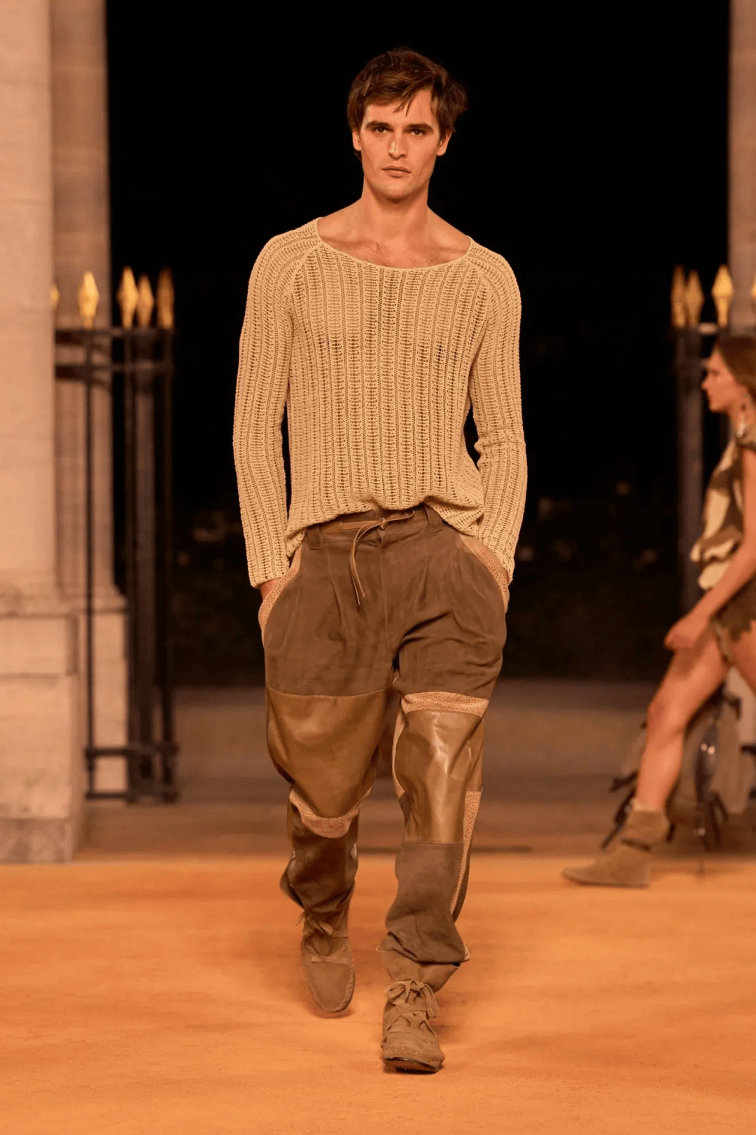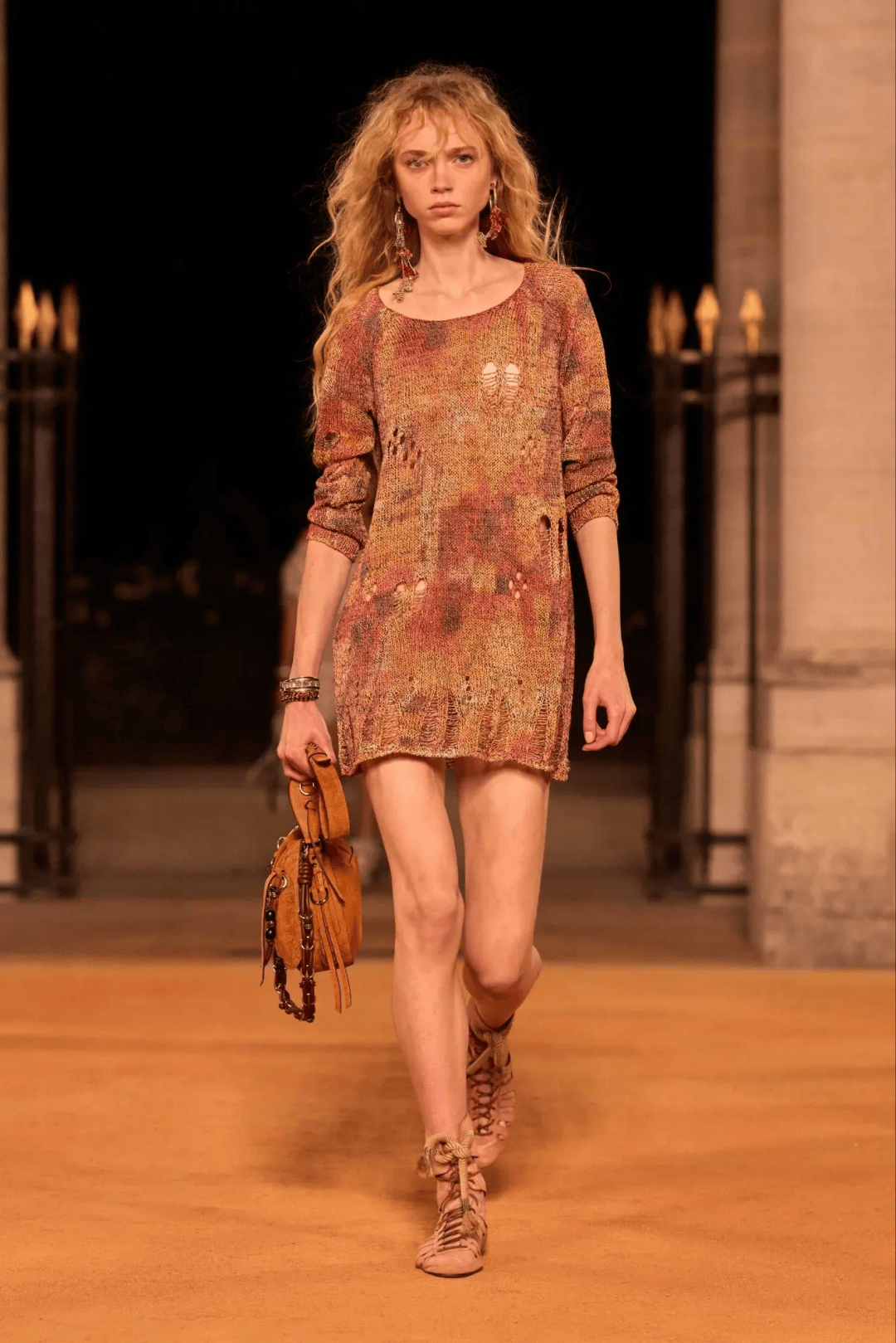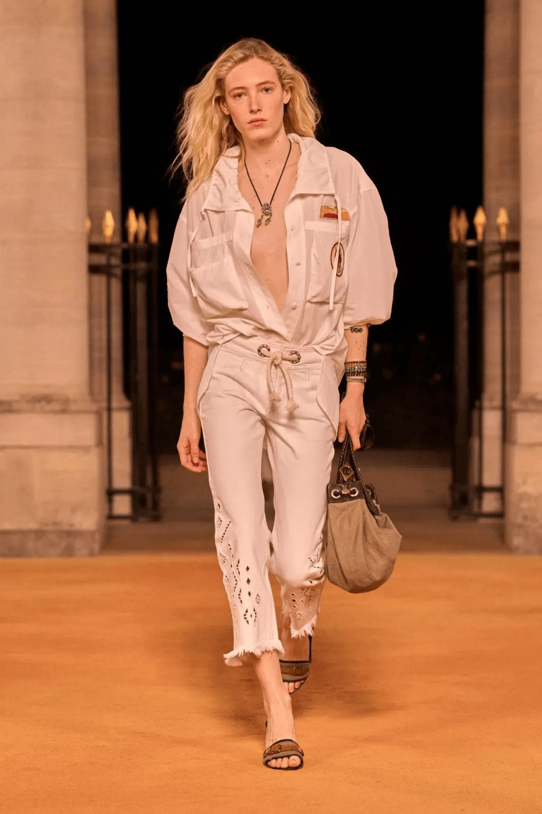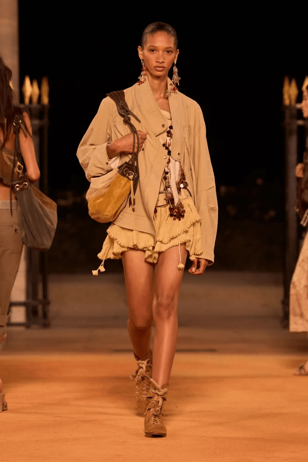 贝克尔以“旅途”为线索,构建出一个漫游者的衣橱。系列中大量运用经漂白与做旧处理的麂皮、蕾丝与皮革,以奶油色、沙褐、卡其等大地色系呼应“晒痕累累的旅行者”意象。拼接刺绣的工装外套、复古军衫、飘逸长裙,仿佛装满了行者沿途收集的记忆碎片。