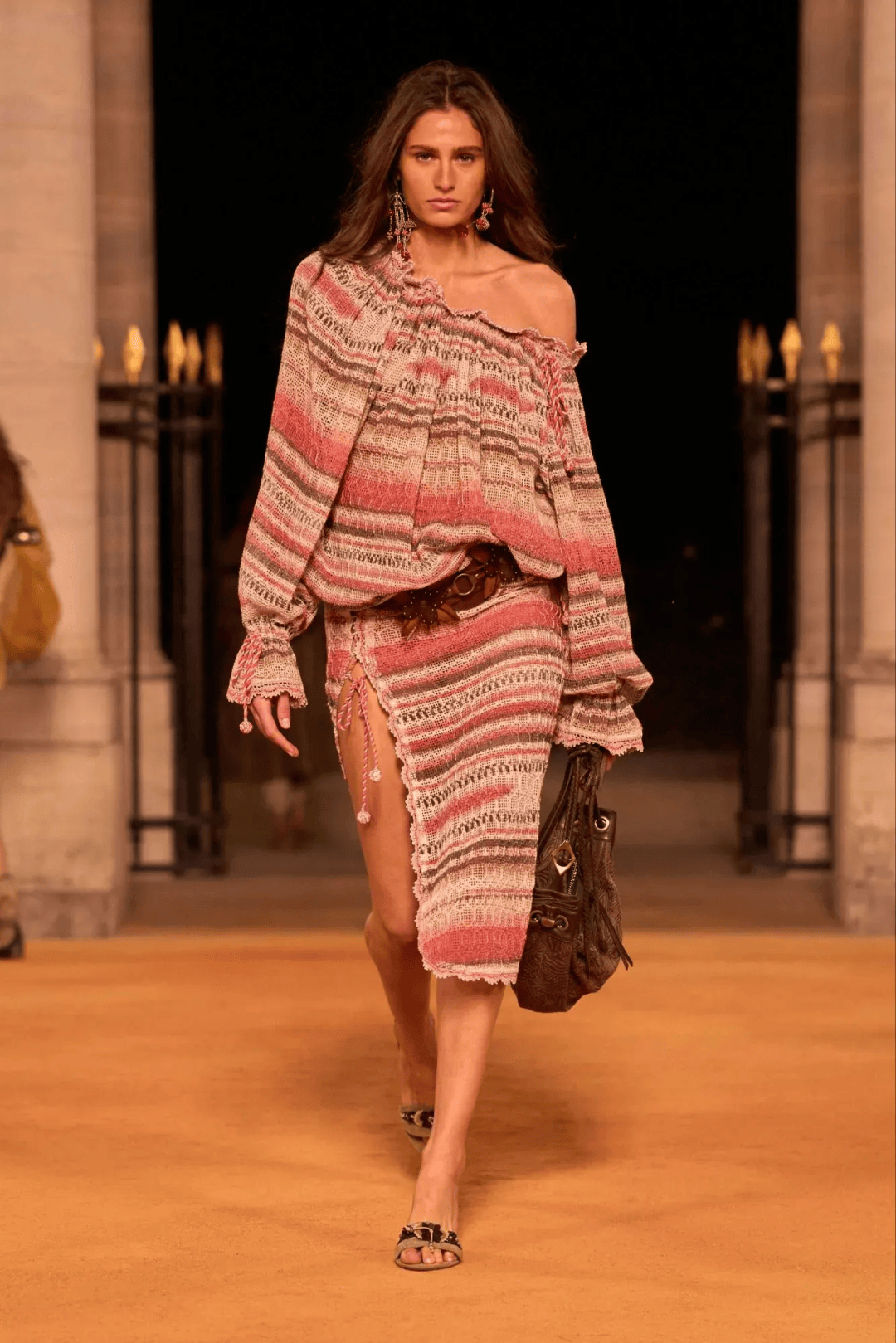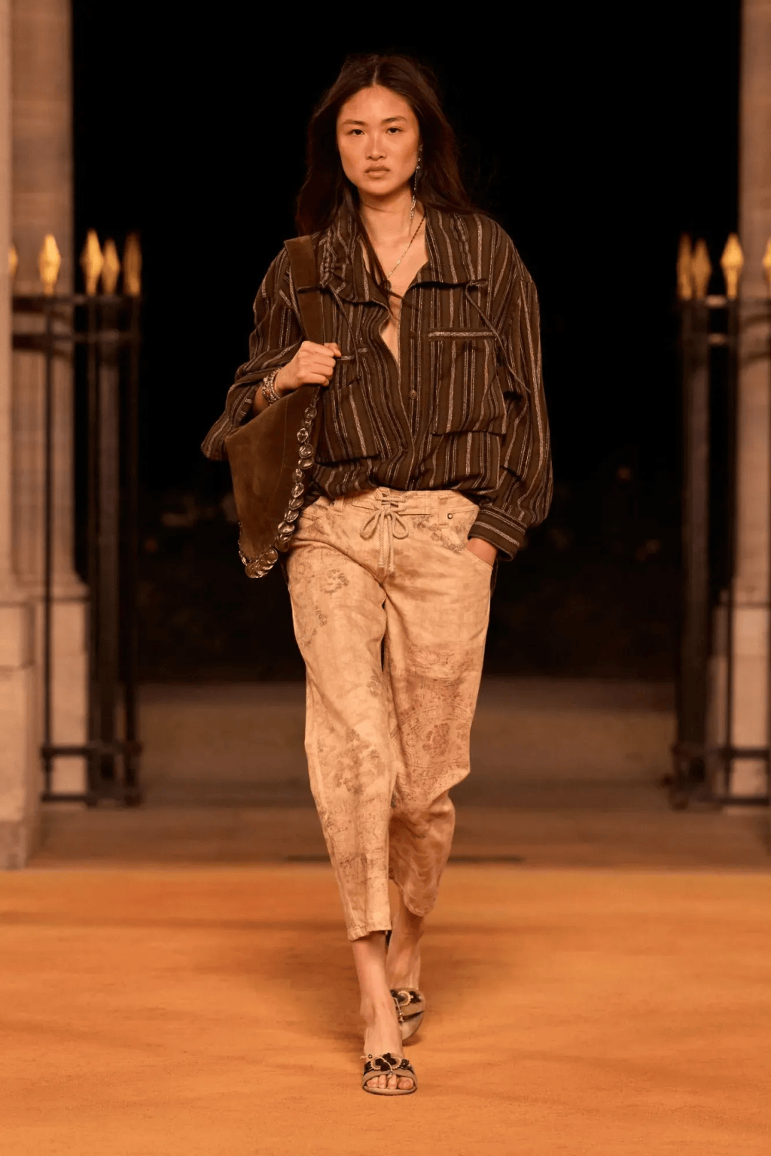 飞行夹克的双层拉链设计、光泽感与镂空面料的拼贴、串珠与贝壳刺绣的装点,皆在致敬手工技艺的同时延续了品牌的松弛美学。男装部分则以80年代初的宽松剪裁回溯复古——方形廓形外套搭配慵懒长裤,柏柏尔条纹双排扣衬衫注入异域风情。就连配饰也暗藏巧思:鎏金链带的麂皮新月包、实用双肩包,既是旅途伴侣,亦是对品牌自由精神的物化诠释。