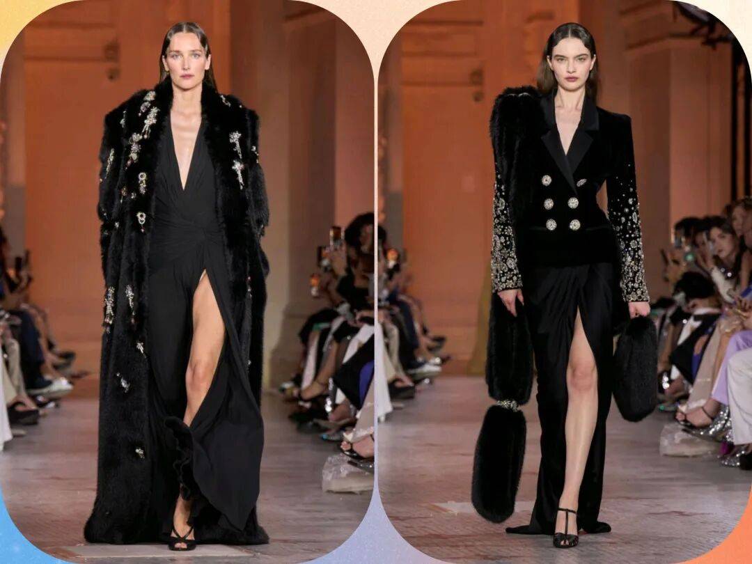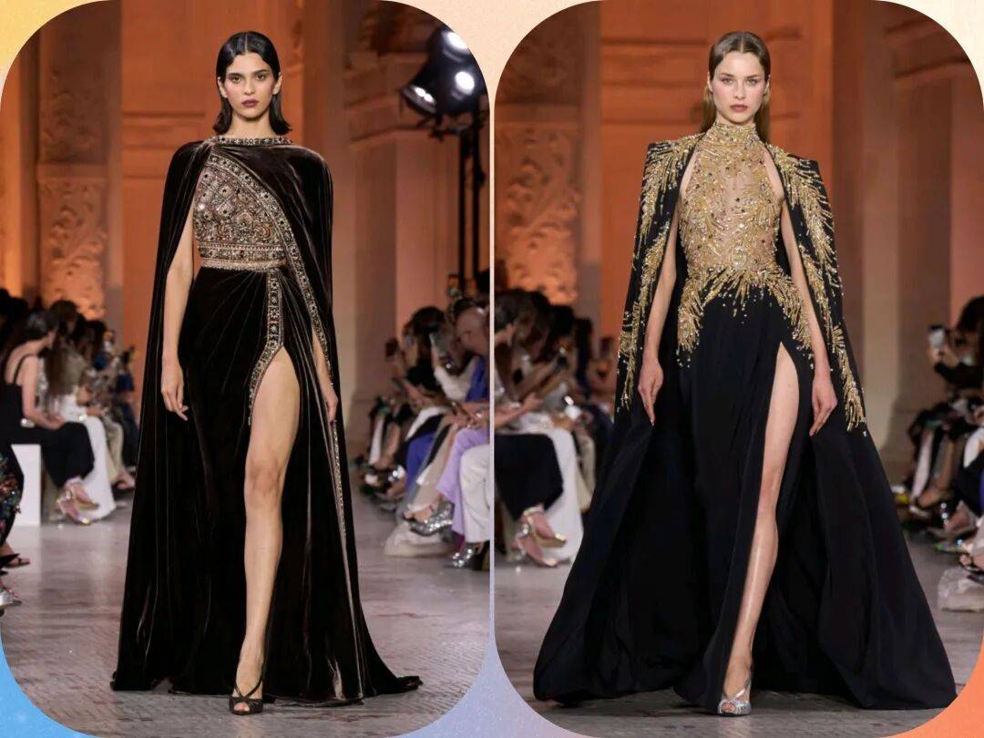 *在黑色的裙装中,上半身和裙摆之间形成了质感的对比,修身的上半身在光泽金色等元素中,也在纹理中多了一些华丽奢华的优雅,而廓形的裙摆也在丝绒材质中,还有开叉裙摆、斗篷元素的肩袖等设计的结合,让黑色的裙装有更多的气质感。