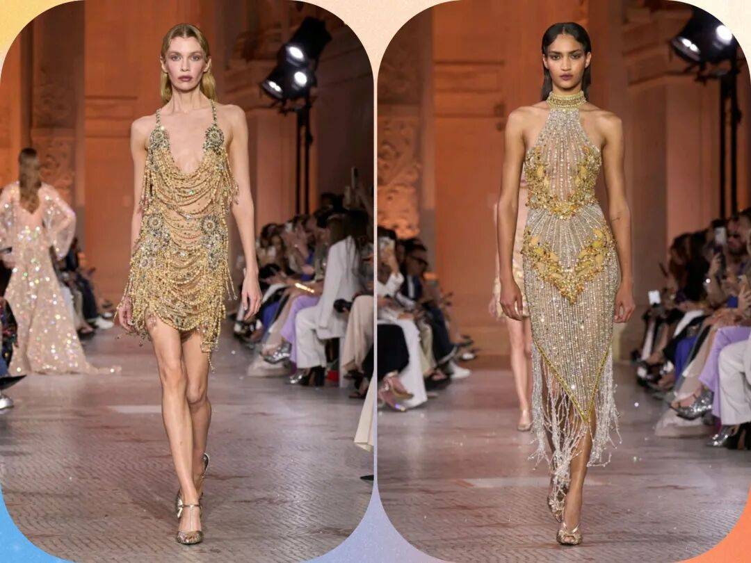 *在吊带、挂脖款式为主的裙装中,金色和银色之间的结合,也在流苏、立体元素等设计的结合,则让服装增加了一些细节和高级的时尚感。