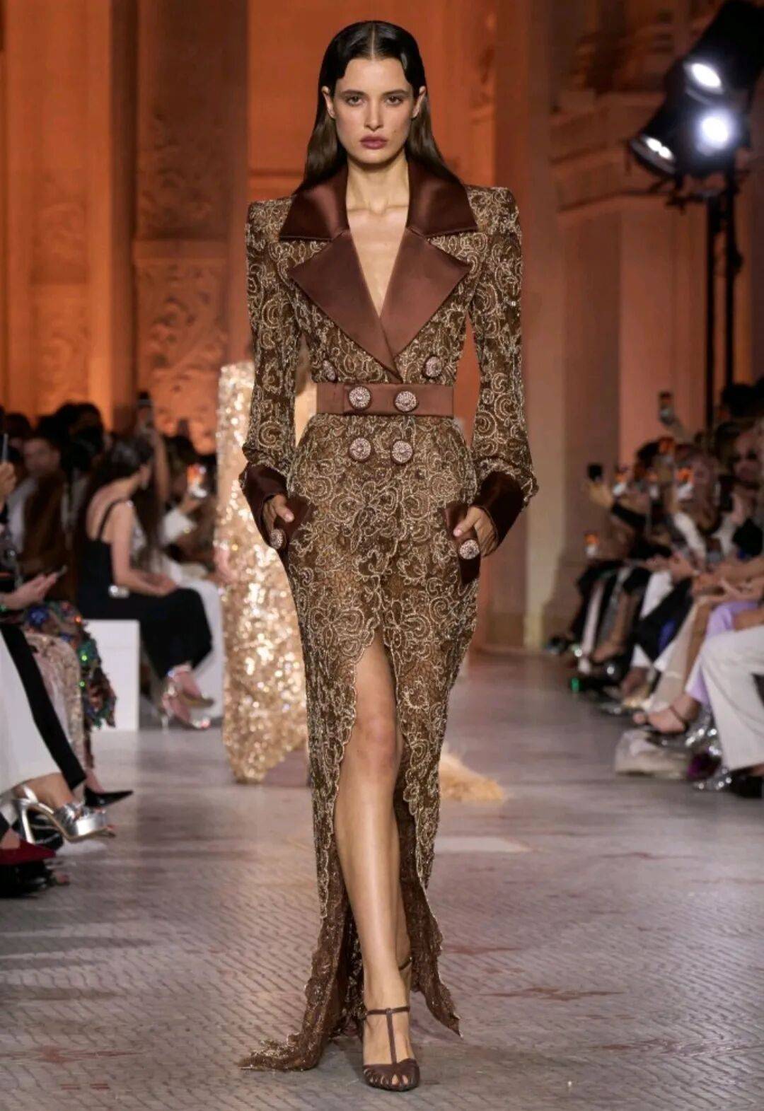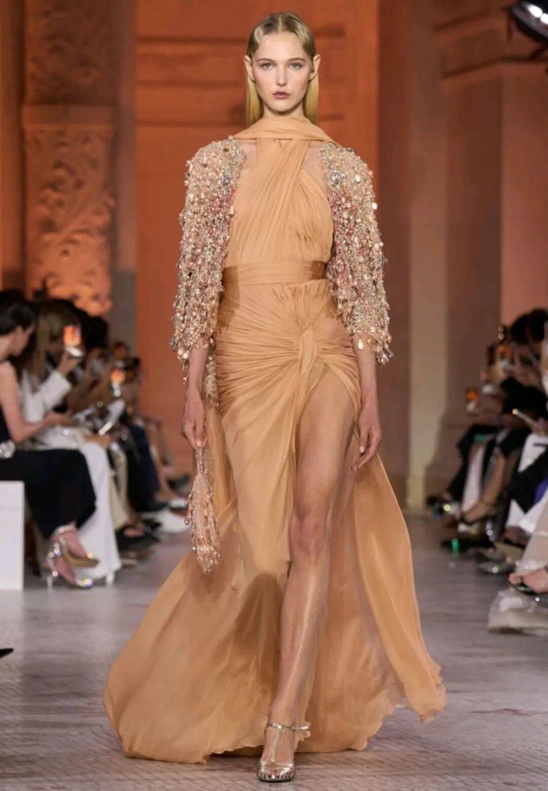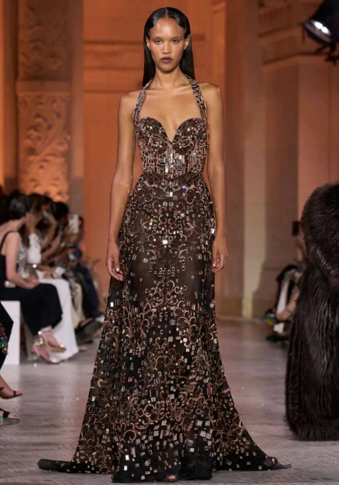 *浅棕色颜色的服装在低调的柔和中,绸缎面料的高级中,以亮片元素的边缘的装饰,也多了奢华的高级感。