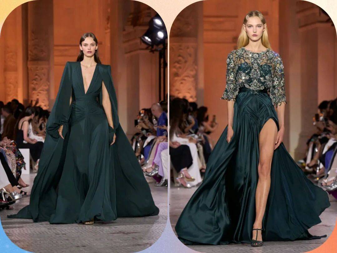 *墨绿色的颜色在裙装之上,稳重中还有绿色系颜色的活力高级感,在裙装中,结合V字衣领、斗篷元素的袖子、开叉的裙摆等设计,为深色的裙装增加了一些细节亮点的装饰。