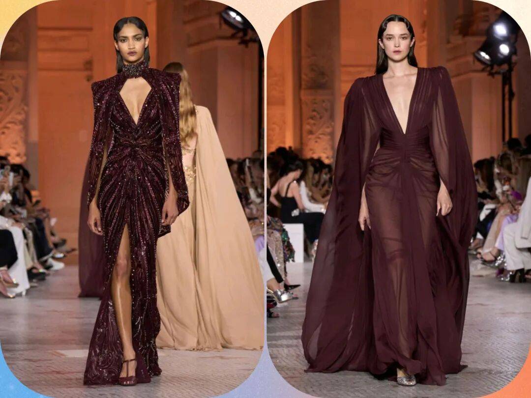 *暗红色的颜色在裙装之中,还有薄纱材质的轻盈飘逸、光泽亮片元素的时髦华丽,在褶皱元素的立体、斗篷元素的开叉设计、还有深V字衣领等这些设计的结合,让暗红色的裙装多了一些细节设计感。