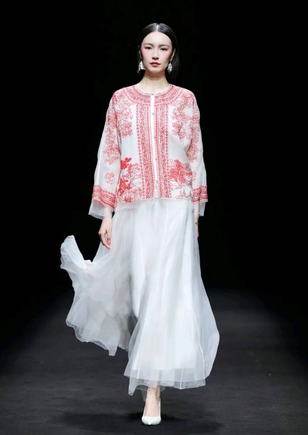 **红白的上衣在线条元素的花纹上,立领的中式上衣,也在这些白色的裙装中,以纯白色的裙装结合薄纱也多了一些轻盈飘逸和视觉的差异。