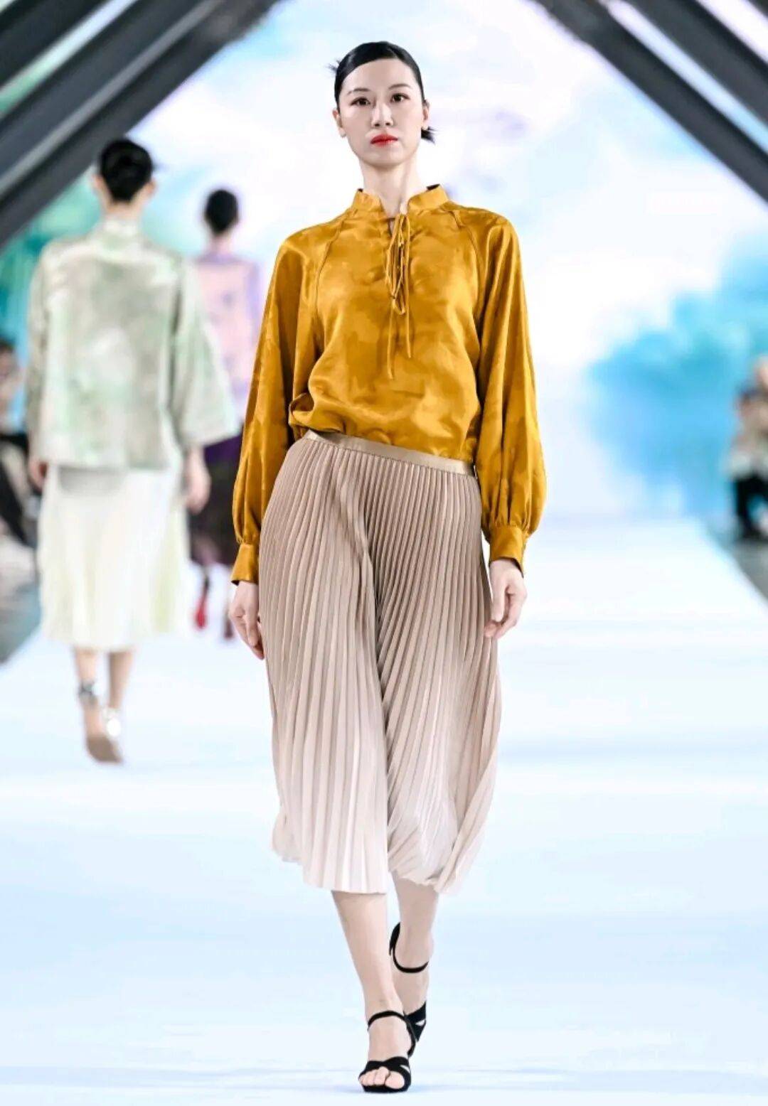 **金色系的休闲上衣在立领等设计的中式设计中,而和棕色、白色等渐变设计中,让百褶裙的裙装也多了不少的气质感。