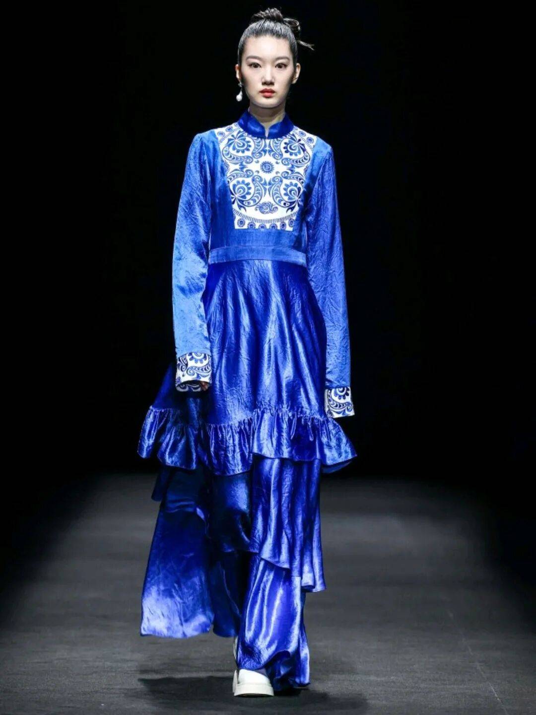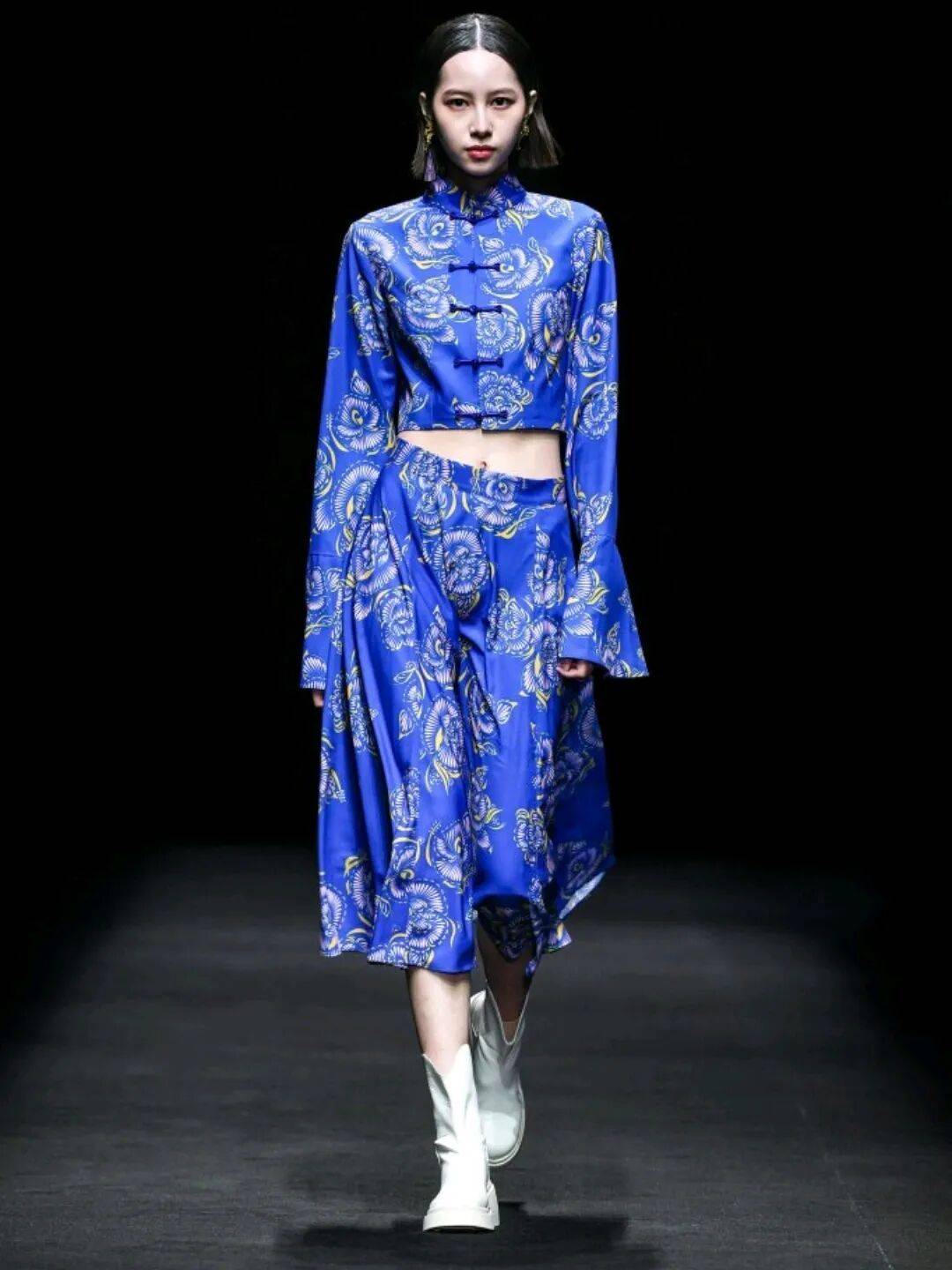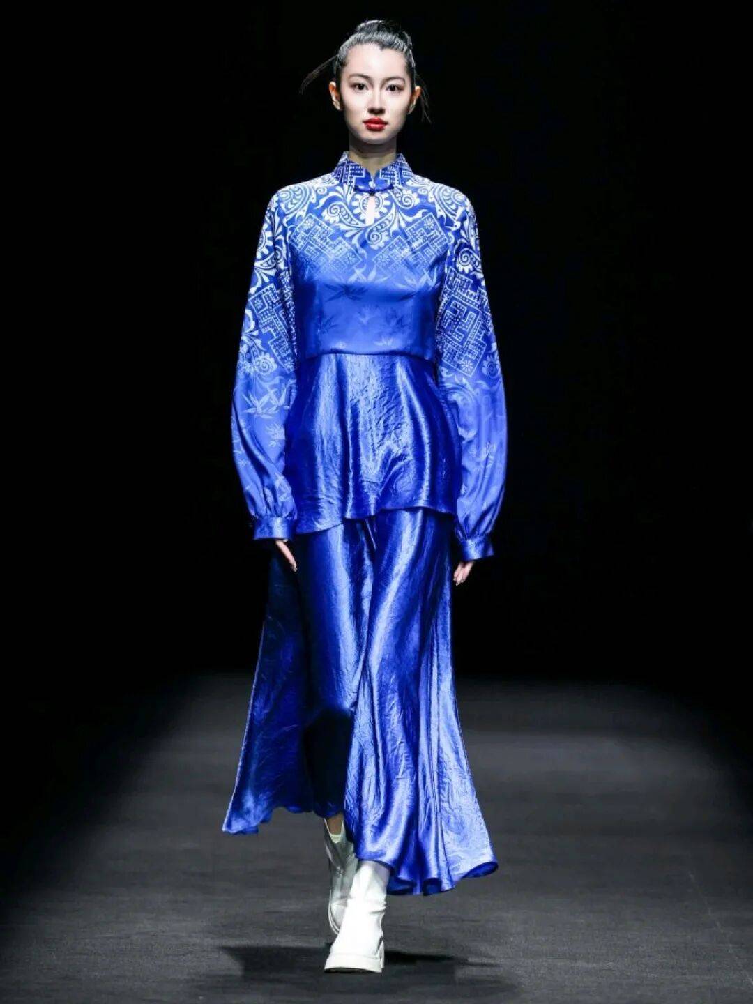 **蓝色的服装在廓形的线条之中,白色的花纹在渐变中,多了一些活力和柔和感。
