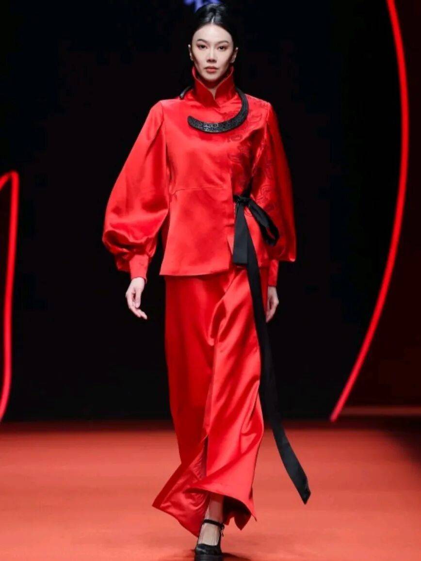 **国风元素的服装在纯色的简约大方中,沉稳黑色和鲜艳红色的搭配,形成了较为强烈的色彩冲击,更是带来了层次和简约时尚。