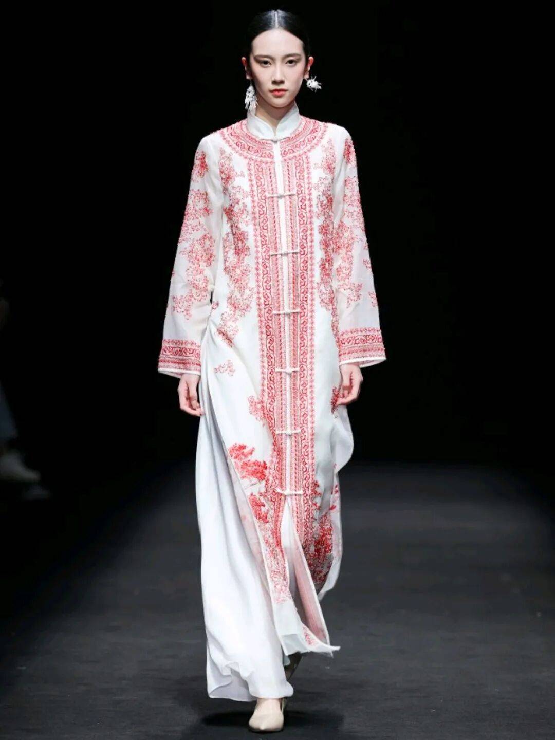 **白色的长款服装,在红色花纹的装饰中,也在高开叉的设计中,以白色直筒裤的搭配,多几分轻盈飘逸感。